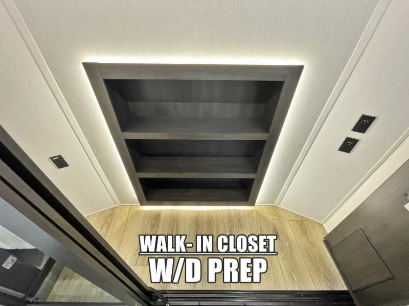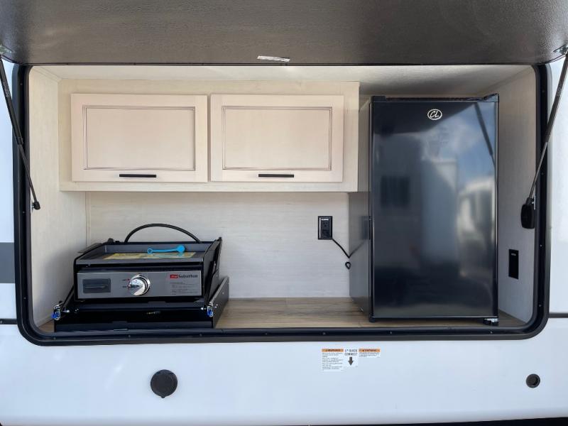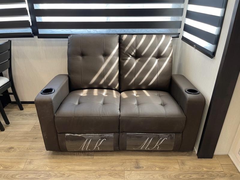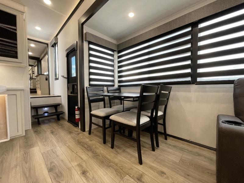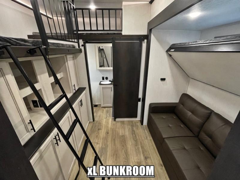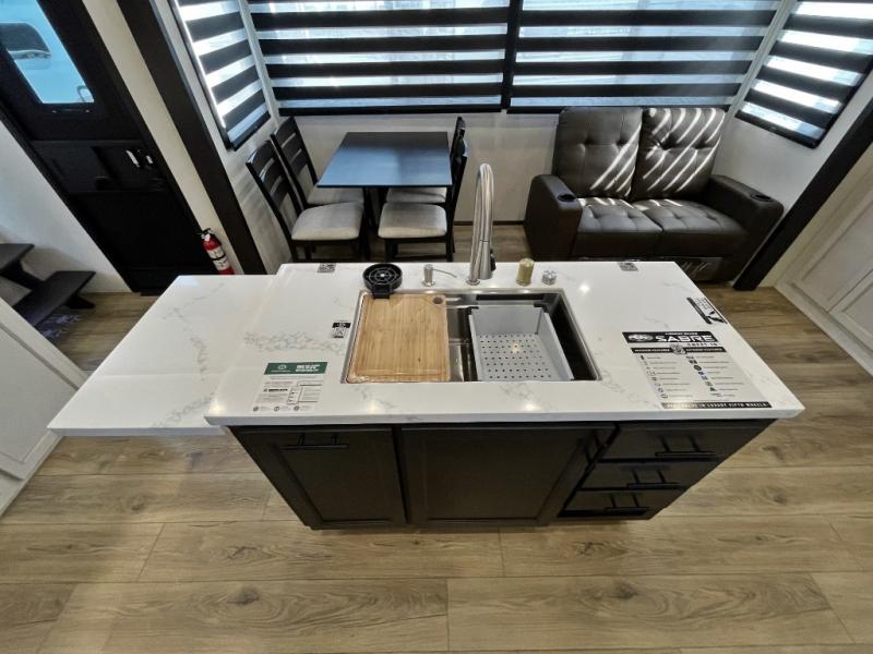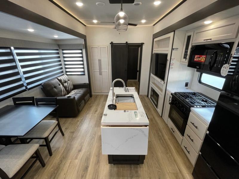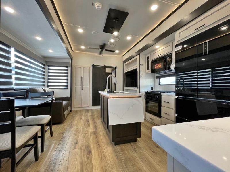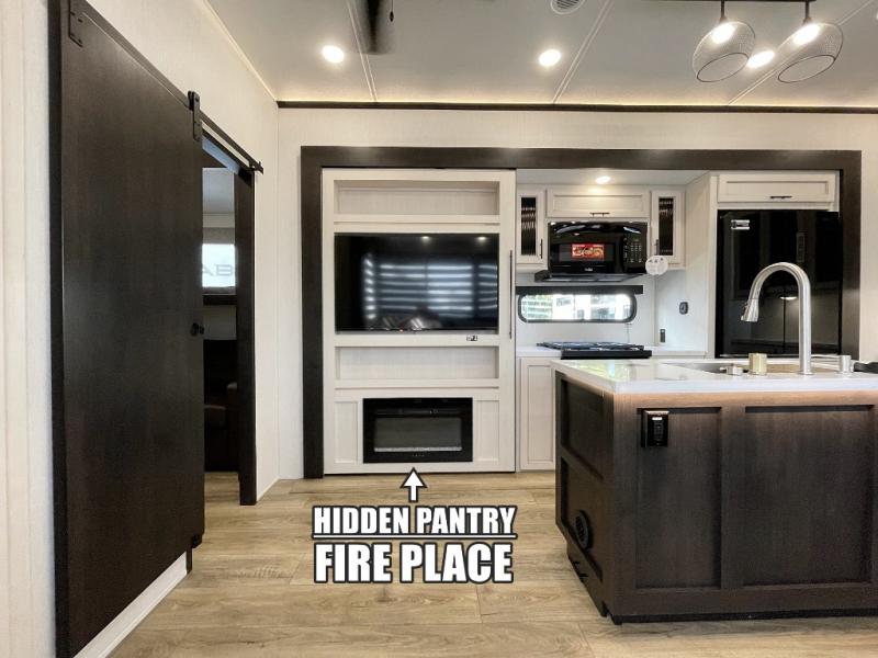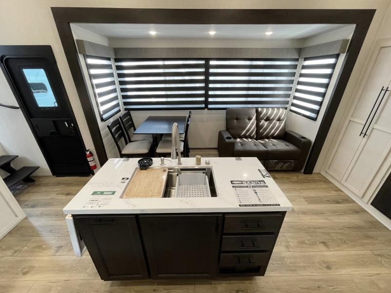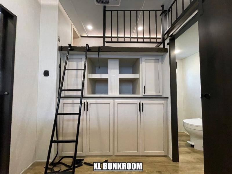 You won't believe all that this fifth wheel has to offer! Enjoy a good night's rest each night on the camper king bed slide in the front private bedroom which also has a front wardrobe with washer and dryer prep, and the rest of your group can sleep in the second bedroom. Inside this bedroom is a slide that houses a tri-fold sofa with a flip-up bunk above it, an entertainment center with storage, and a loft area above it all with two bunks and cabinets. The rear bedroom even has its very own rear full bathroom with a 36" x 24" shower to freshen up in each morning and one of the dual entry doors to the unit. The chef will enjoy using the kitchen island to prepare their best home cooked meals and everyone can gather together at the versatile dinette/desk conveniently across from the entertainment center with a fireplace.