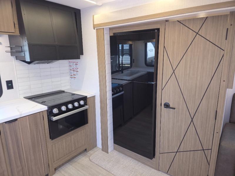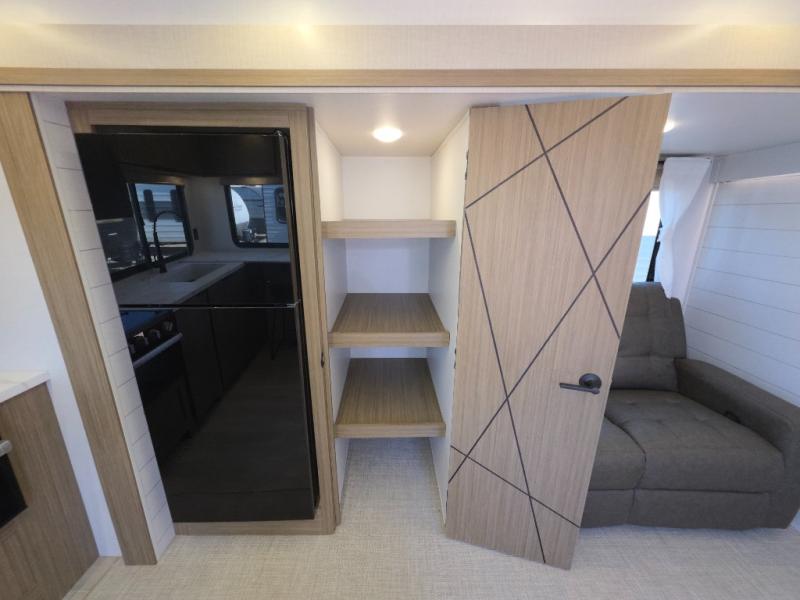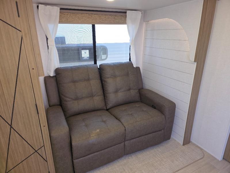 You're going to love cooking in the rear kitchen of this travel trailer! It has everything you need to prepare delicious home cooked meals including a large pantry and oversized fridge, plus there are two bar stools to sit on while you enjoy them. The theater seating is conveniently across from the swiveling entertainment center which has hidden shelves behind it for your games and movies. As you walk through the bathroom, you will notice a walk-in shower to the left and a toilet and sink to the right. It leads directly into the front private bedroom which has a Versa-Tilt custom king bed to lay your head on at night and a closet plus overhead storage for your items!