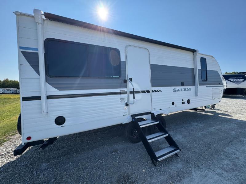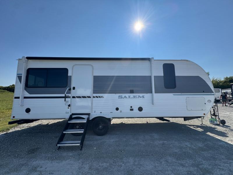 The Salem travel trailers are packed with hassle-free camping amenities and there are a variety of floorplans to choose from. The heated and enclosed Accessibelly will help protect against the elements and debris during transport, and the exterior retro/metal redesign is sure to be eye-catching! There are stylish roller shades inside, along with updated backsplash, elegant curtain rods and curtains, plus many more interior comforts! Choose a Salem travel trailer today for quality and value!