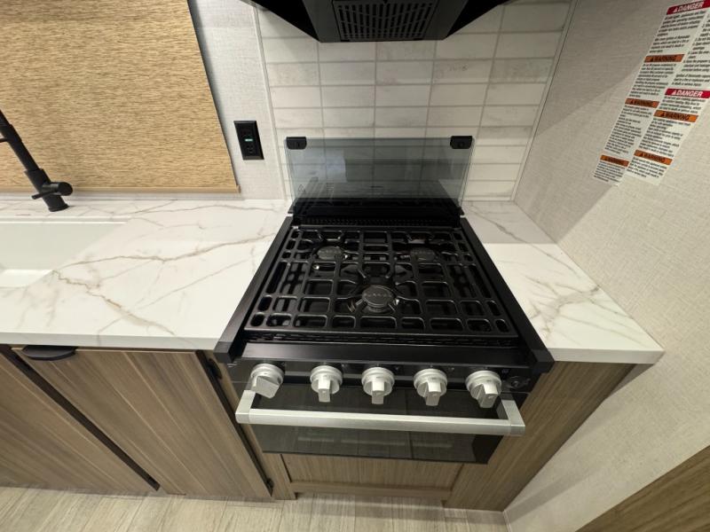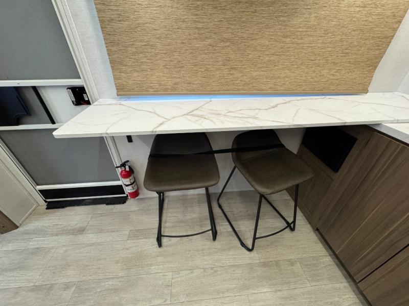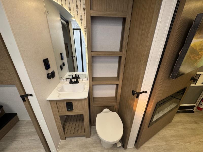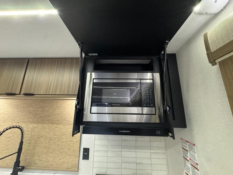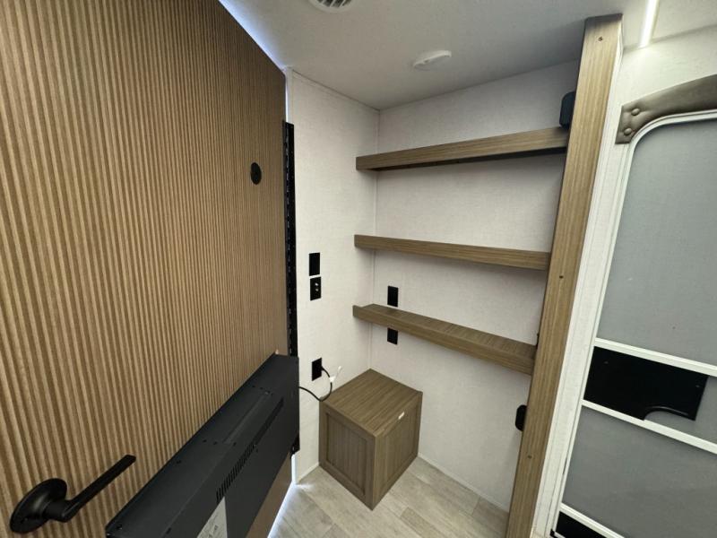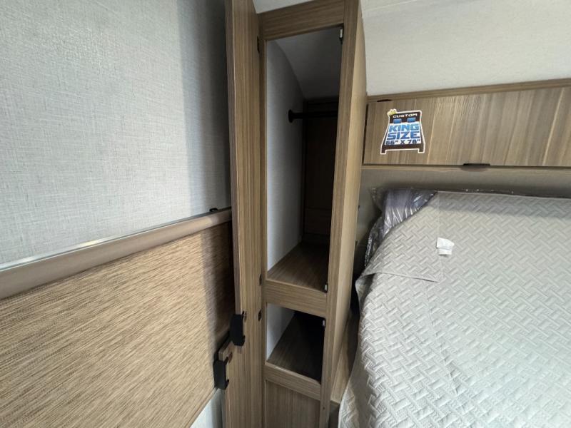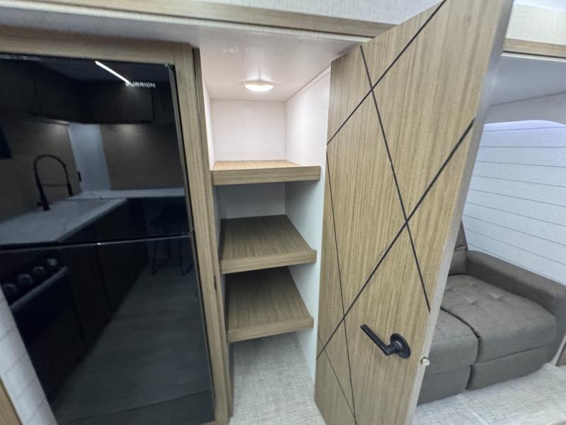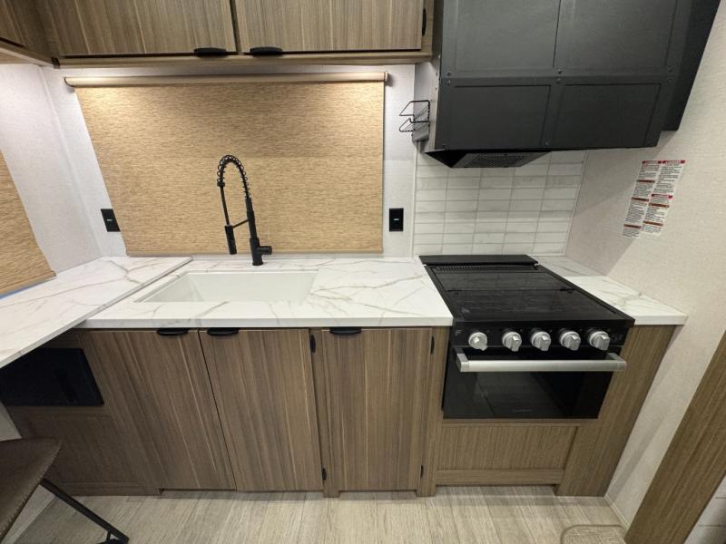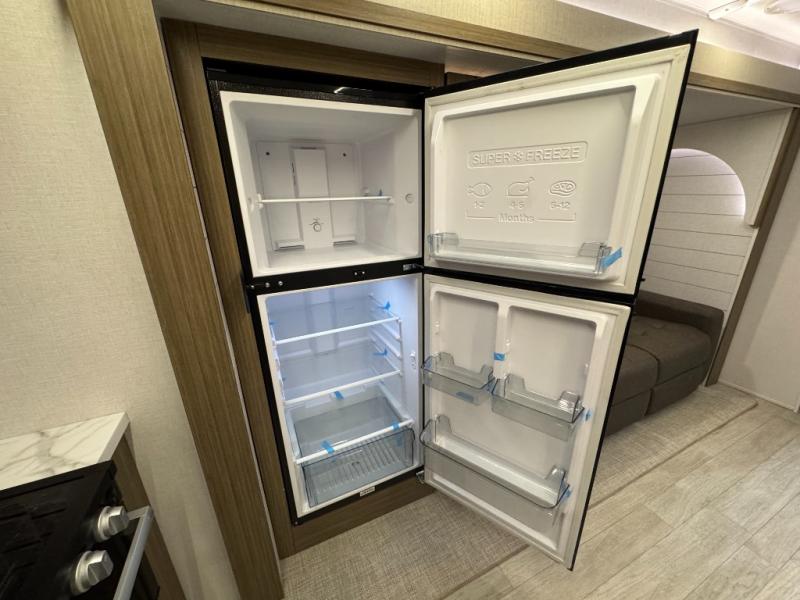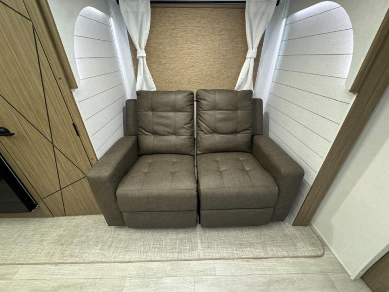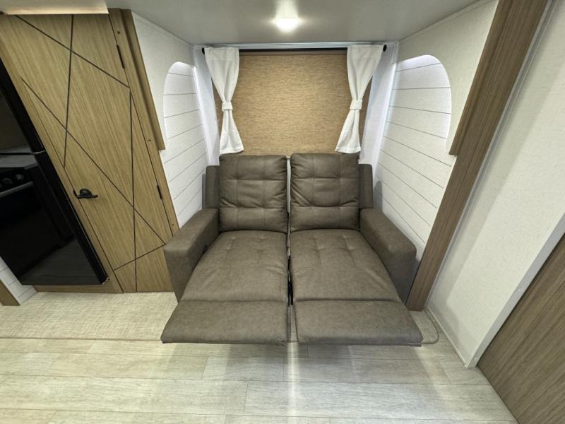You're going to love cooking in the rear kitchen of this travel trailer! It has everything you need to prepare delicious home cooked meals including a large pantry and oversized fridge, plus there are two bar stools to sit on while you enjoy them. The theater seating is conveniently across from the swiveling entertainment center which has hidden shelves behind it for your games and movies. As you walk through the bathroom, you will notice a walk-in shower to the left and a toilet and sink to the right. It leads directly into the front private bedroom which has a Versa-Tilt custom king bed to lay your head on at night and a closet plus overhead storage for your items!