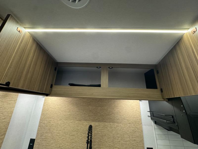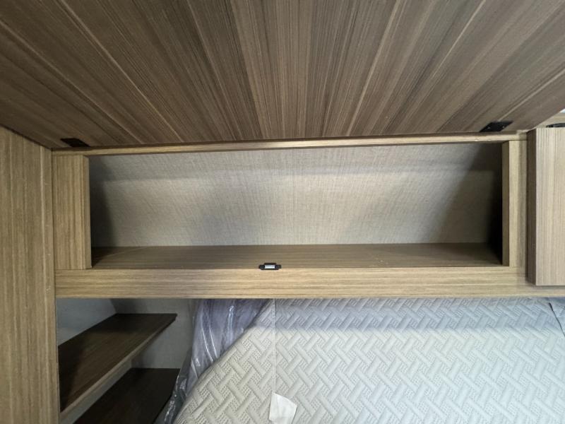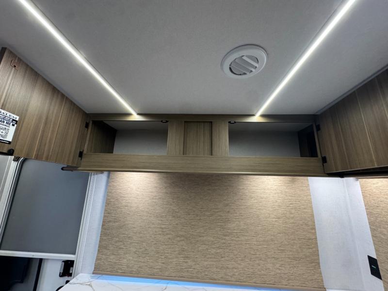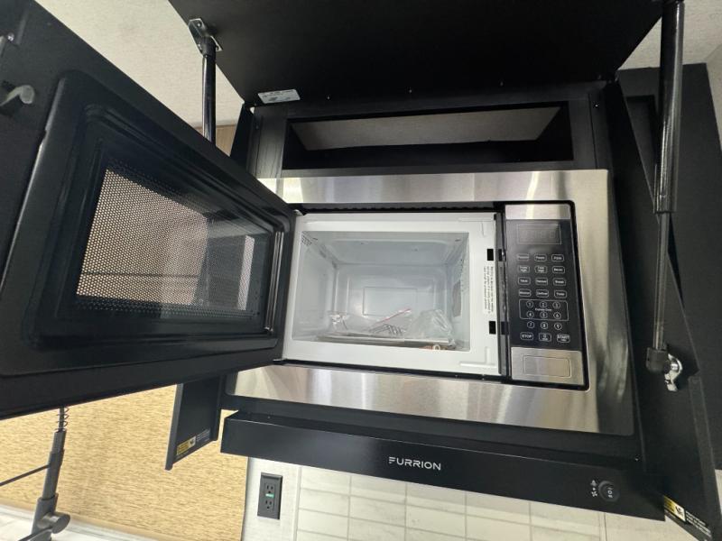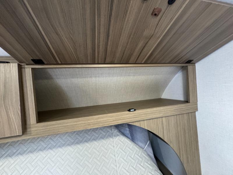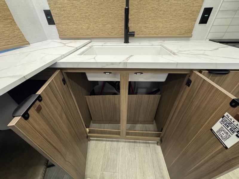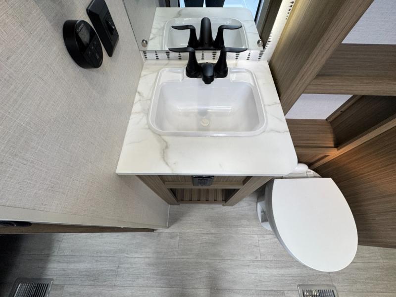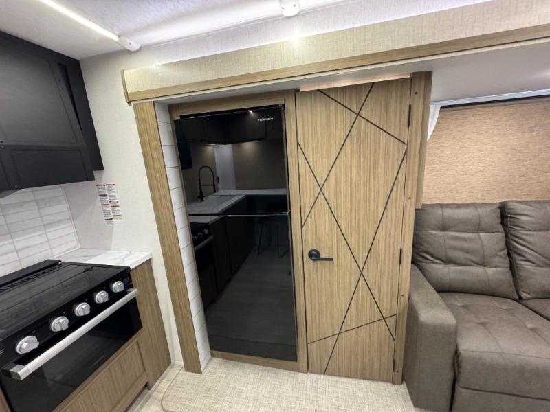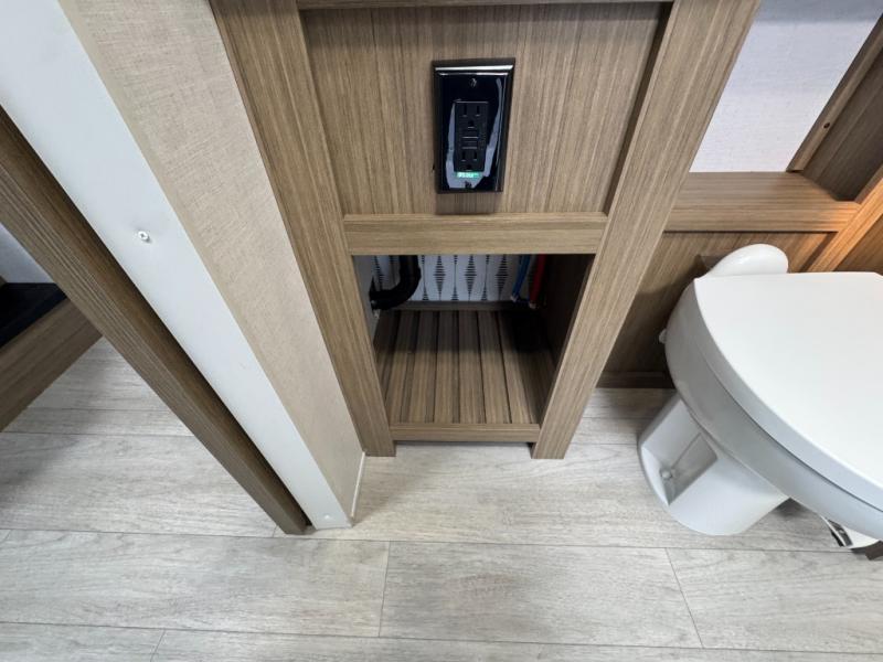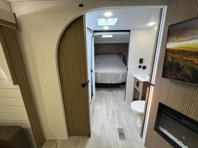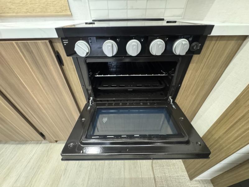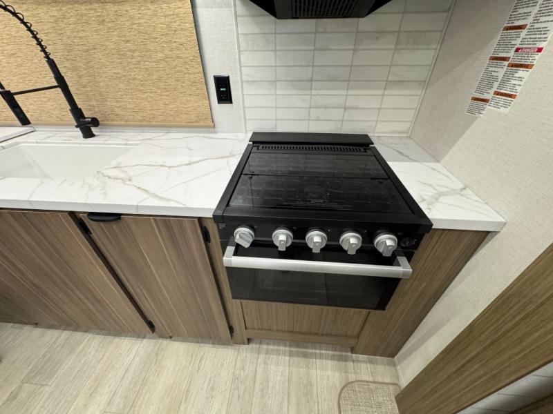 You're going to love cooking in the rear kitchen of this travel trailer! It has everything you need to prepare delicious home cooked meals including a large pantry and oversized fridge, plus there are two bar stools to sit on while you enjoy them. The theater seating is conveniently across from the swiveling entertainment center which has hidden shelves behind it for your games and movies. As you walk through the bathroom, you will notice a walk-in shower to the left and a toilet and sink to the right. It leads directly into the front private bedroom which has a Versa-Tilt custom king bed to lay your head on at night and a closet plus overhead storage for your items!
