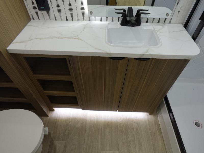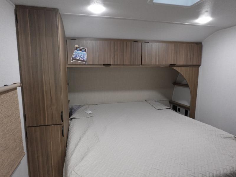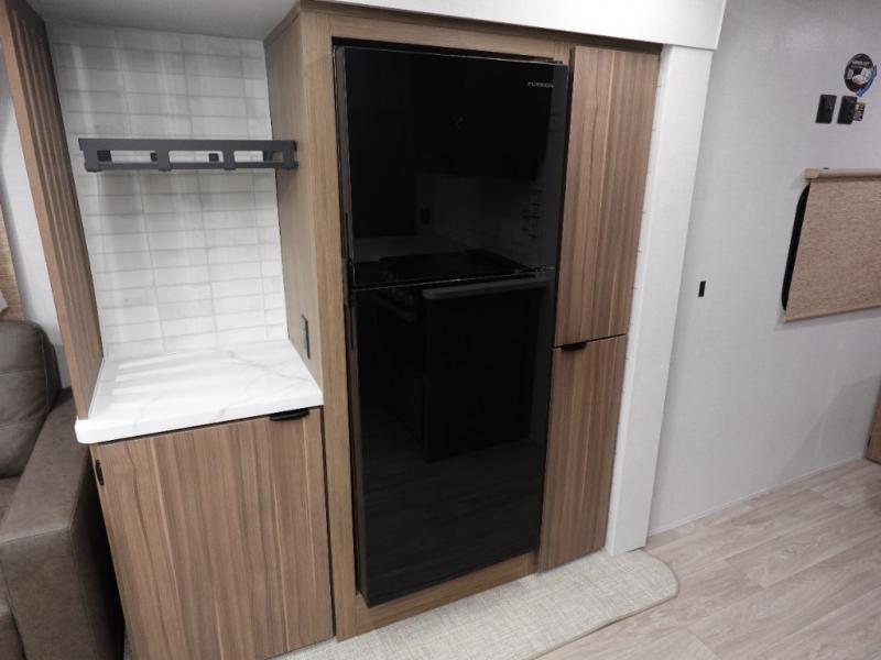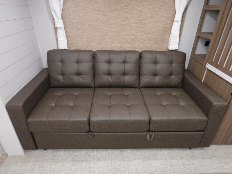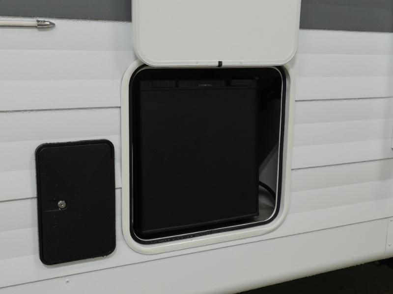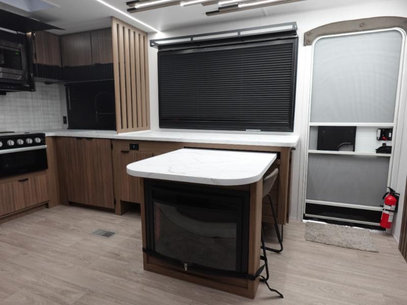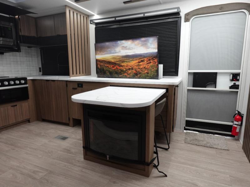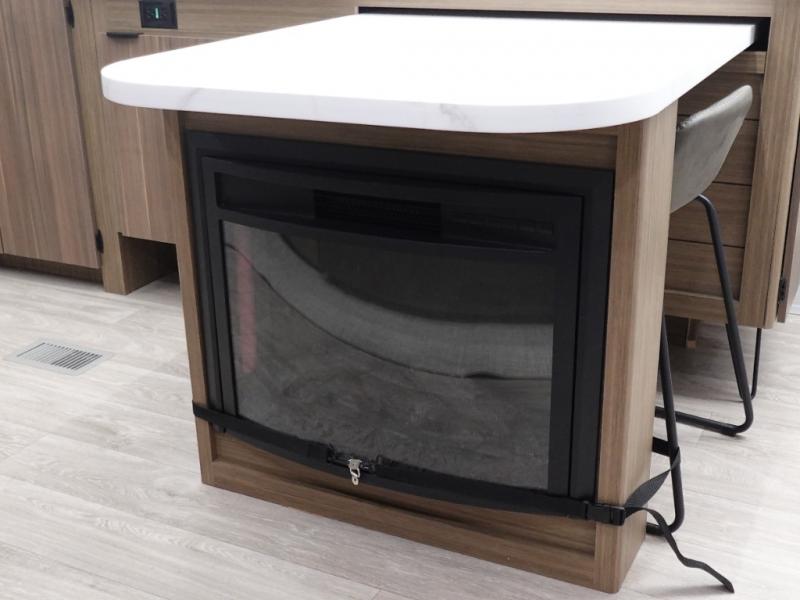 You can enjoy at-home comforts wherever you decide to camp in this travel trailer. The custom king bed with Versa Tilt includes dual shelves and a wardrobe so you can keep your space tidy. If you have a guest or two little ones, they can sleep on the jackknife sofa within the large slide out. Once you've made breakfast in the fully equipped kitchen, you can utilize the pull-out table to dine at. There is also a fireplace below the table, which will be perfect for cozy evenings indoors. And don't overlook the full rear bath, complete with a spacious shower, a toilet, bath shelves, and ample counter space!
