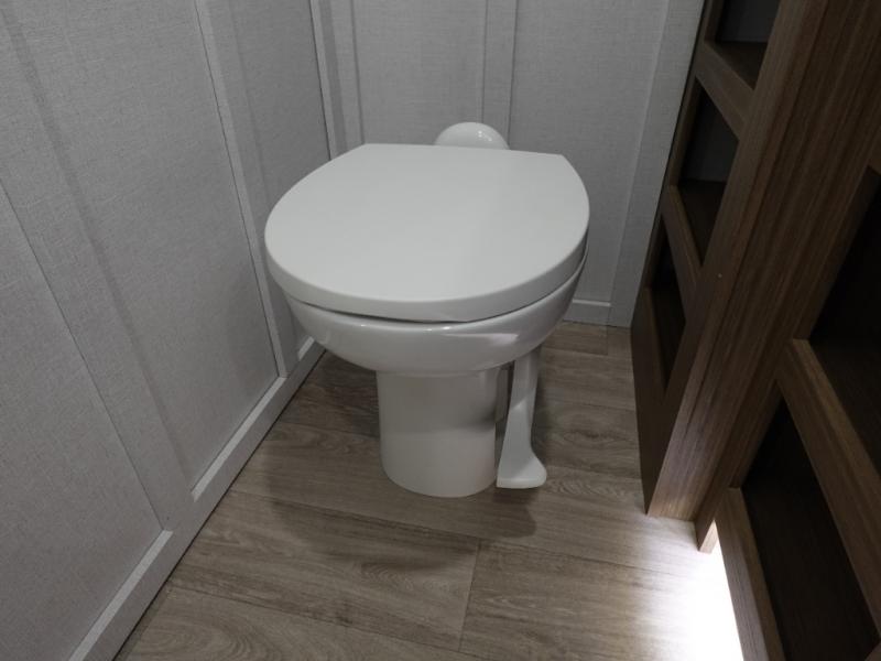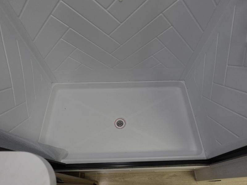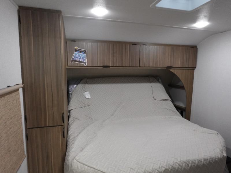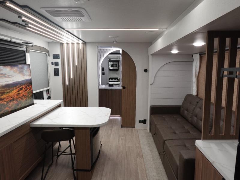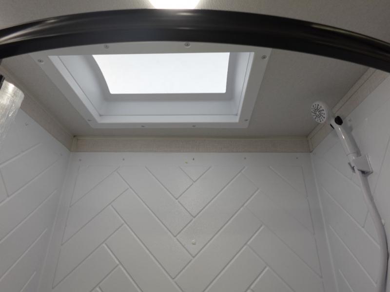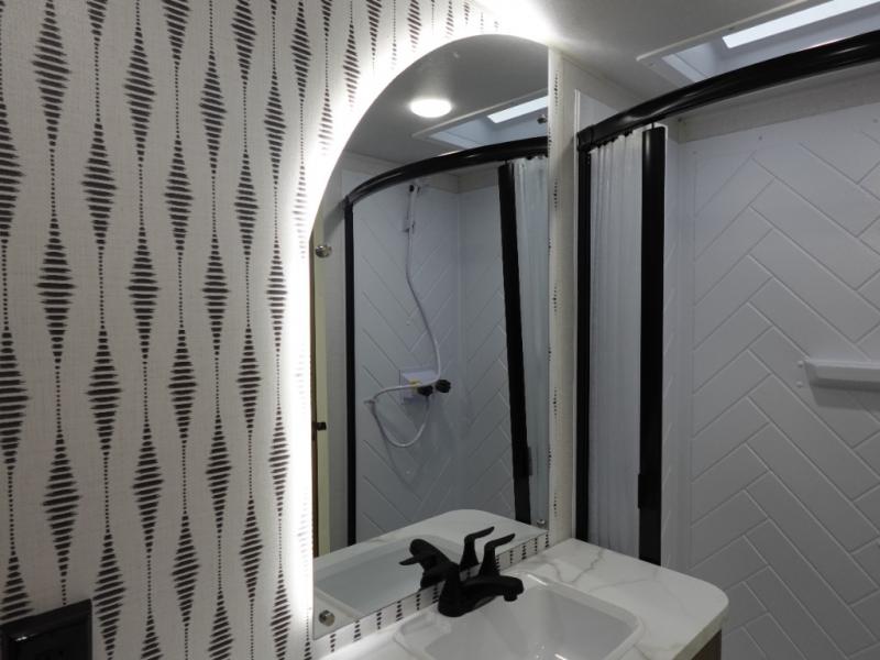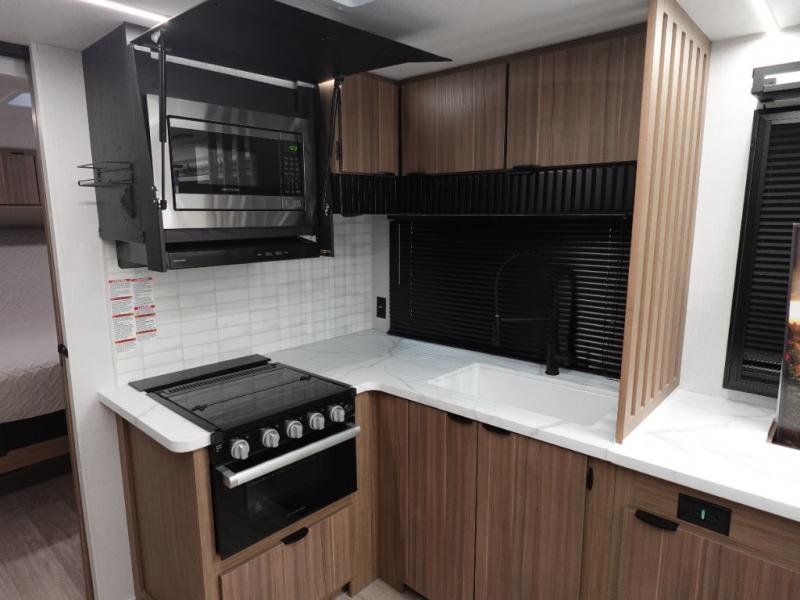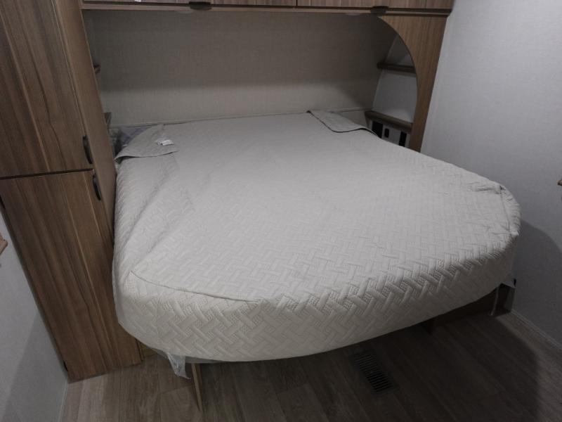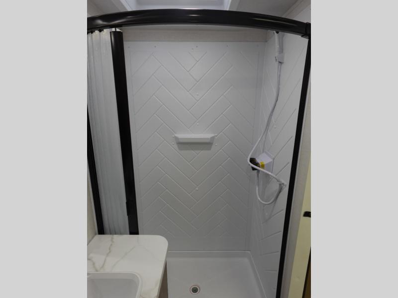 You can enjoy at-home comforts wherever you decide to camp in this travel trailer. The custom king bed with Versa Tilt includes dual shelves and a wardrobe so you can keep your space tidy. If you have a guest or two little ones, they can sleep on the jackknife sofa within the large slide out. Once you've made breakfast in the fully equipped kitchen, you can utilize the pull-out table to dine at. There is also a fireplace below the table, which will be perfect for cozy evenings indoors. And don't overlook the full rear bath, complete with a spacious shower, a toilet, bath shelves, and ample counter space!