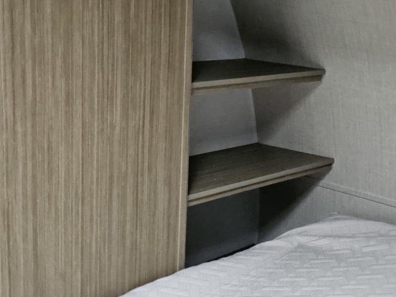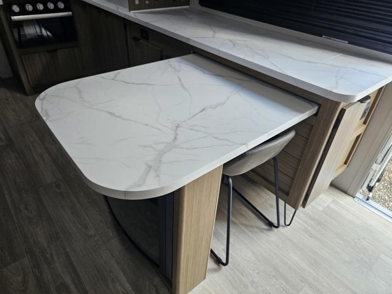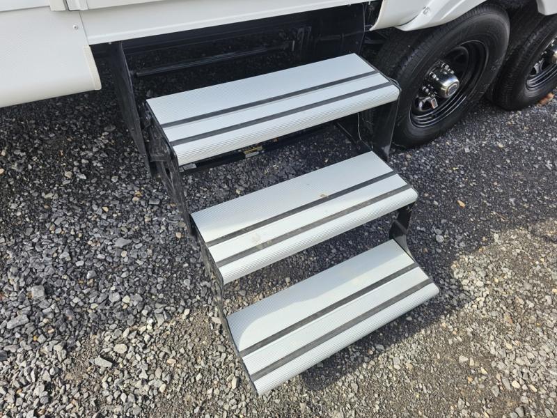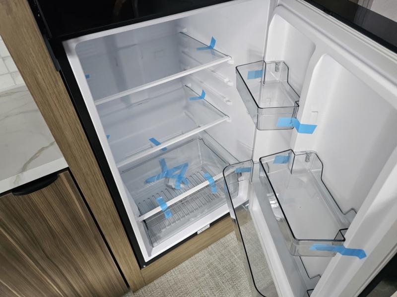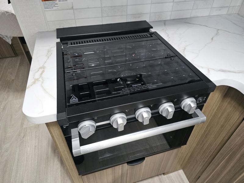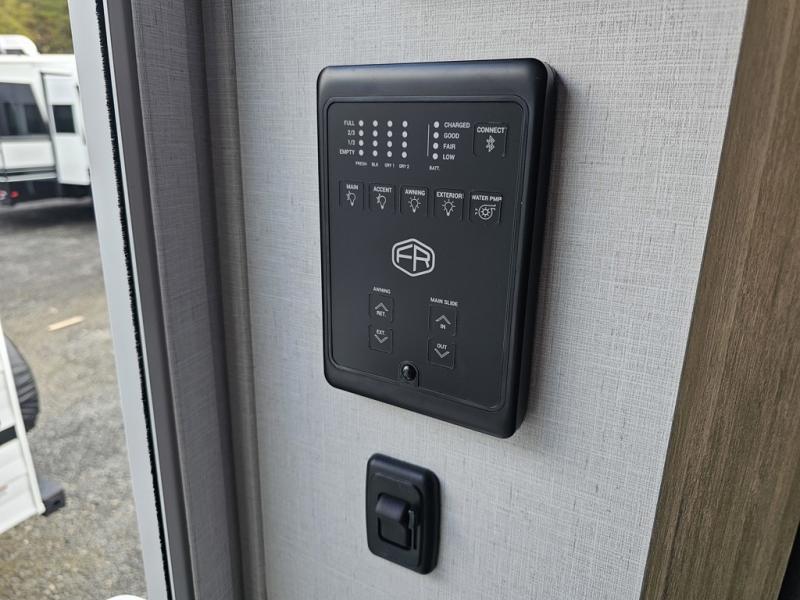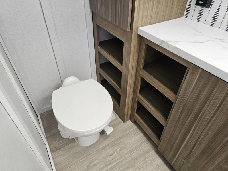 You can enjoy at-home comforts wherever you decide to camp in this travel trailer. The custom king bed with Versa Tilt includes dual shelves and a wardrobe so you can keep your space tidy. If you have a guest or two little ones, they can sleep on the jackknife sofa within the large slide out. Once you've made breakfast in the fully equipped kitchen, you can utilize the pull-out table to dine at. There is also a fireplace below the table, which will be perfect for cozy evenings indoors. And don't overlook the full rear bath, complete with a spacious shower, a toilet, bath shelves, and ample counter space!