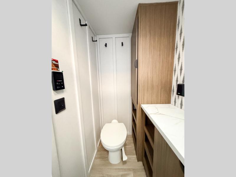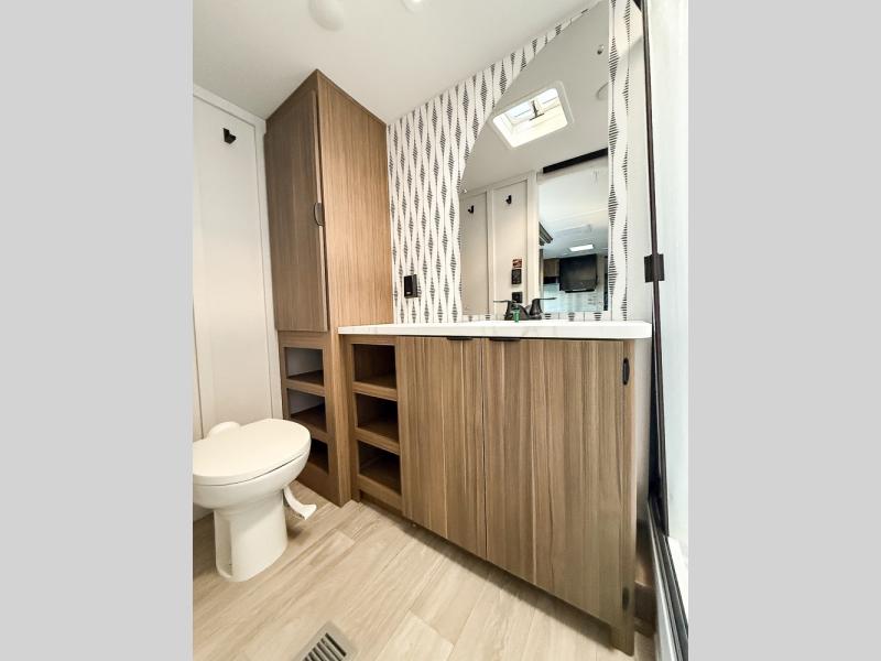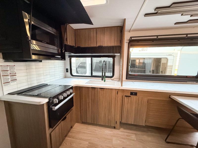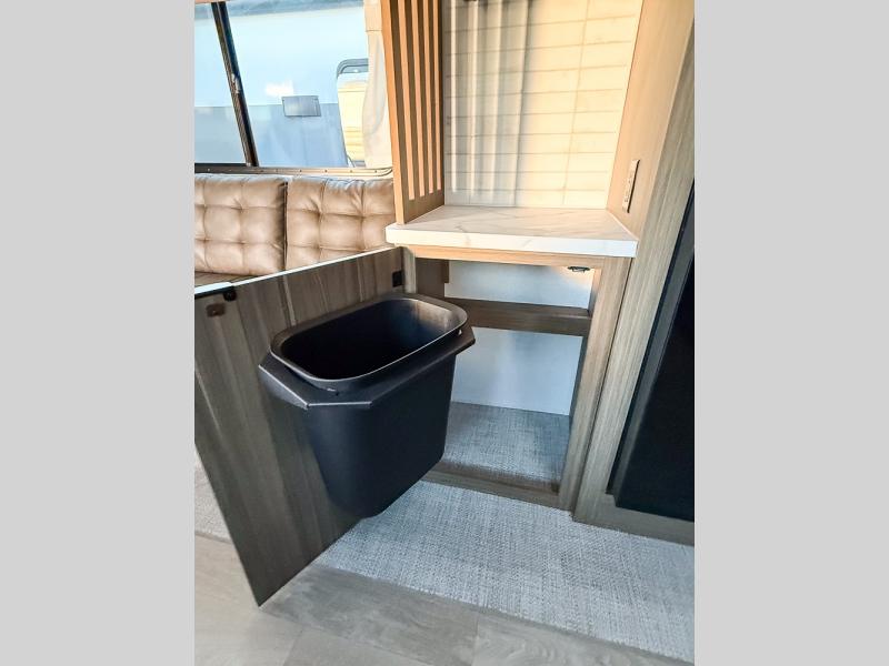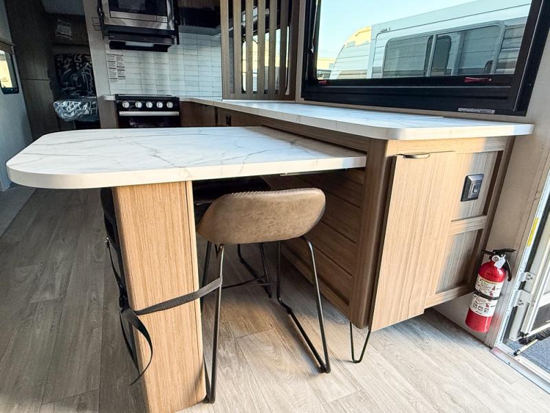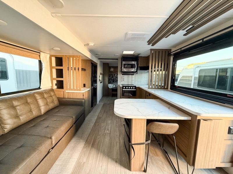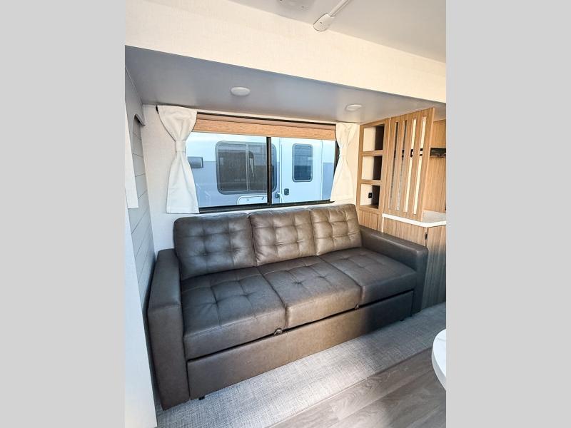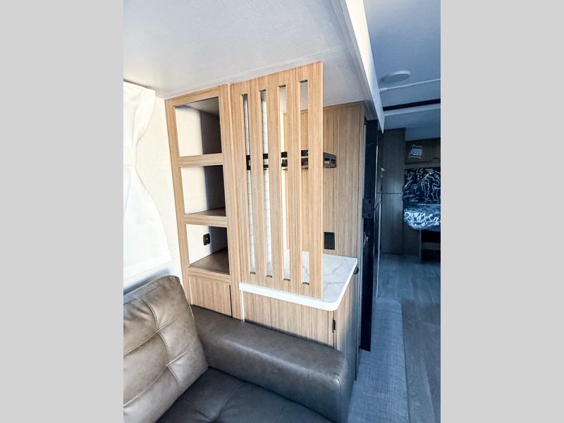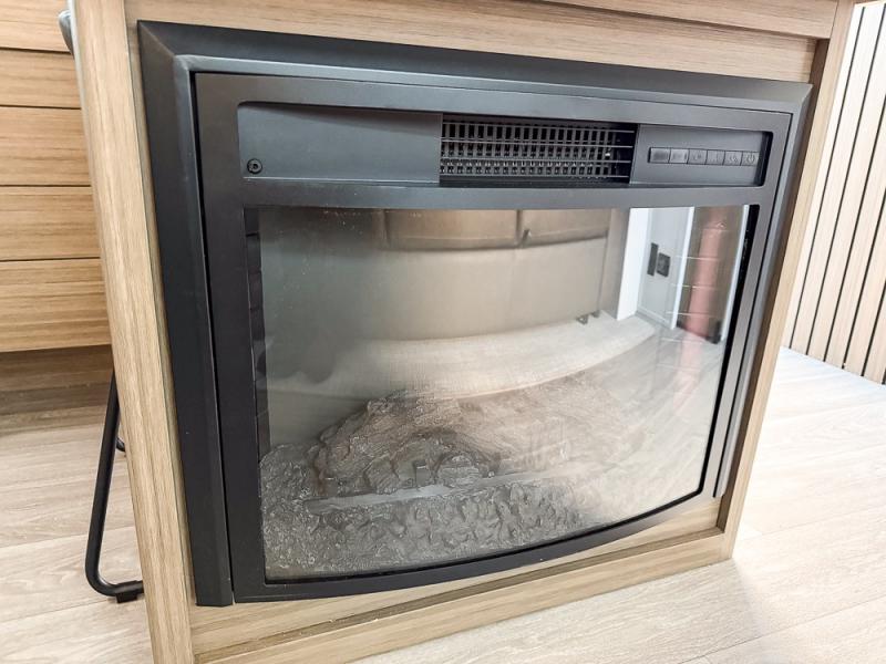 You can enjoy at-home comforts wherever you decide to camp in this travel trailer. The custom king bed with Versa Tilt includes dual shelves and a wardrobe so you can keep your space tidy. If you have a guest or two little ones, they can sleep on the jackknife sofa within the large slide out. Once you've made breakfast in the fully equipped kitchen, you can utilize the pull-out table to dine at. There is also a fireplace below the table, which will be perfect for cozy evenings indoors. And don't overlook the full rear bath, complete with a spacious shower, a toilet, bath shelves, and ample counter space!