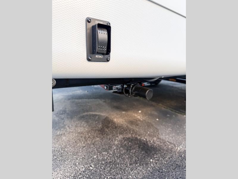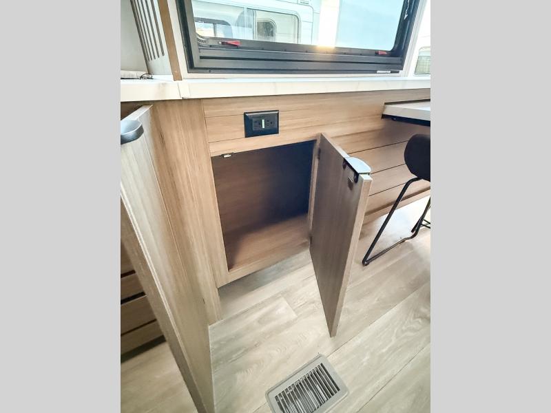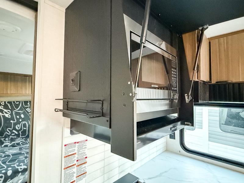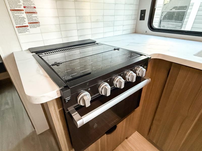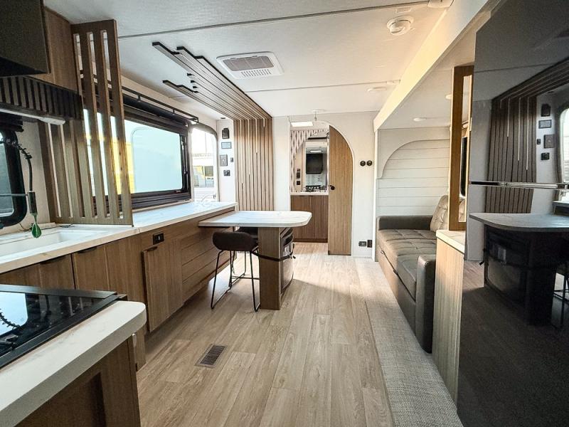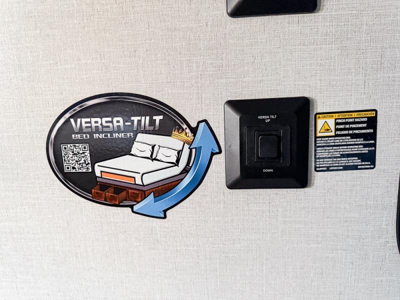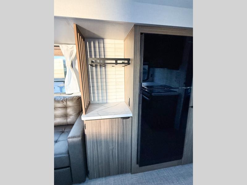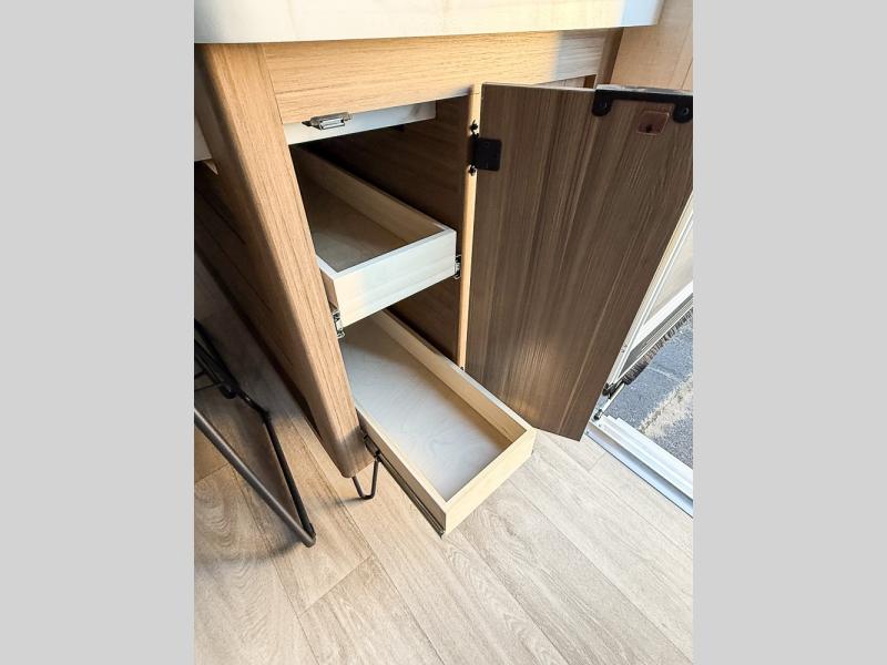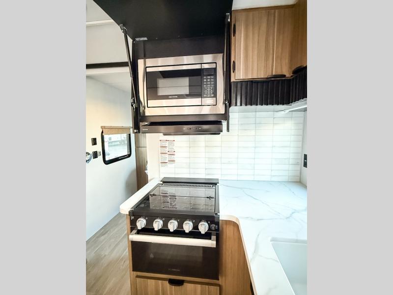 You can enjoy at-home comforts wherever you decide to camp in this travel trailer. The custom king bed with Versa Tilt includes dual shelves and a wardrobe so you can keep your space tidy. If you have a guest or two little ones, they can sleep on the jackknife sofa within the large slide out. Once you've made breakfast in the fully equipped kitchen, you can utilize the pull-out table to dine at. There is also a fireplace below the table, which will be perfect for cozy evenings indoors. And don't overlook the full rear bath, complete with a spacious shower, a toilet, bath shelves, and ample counter space!