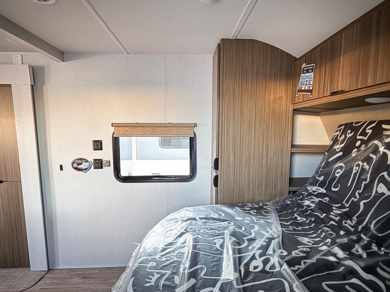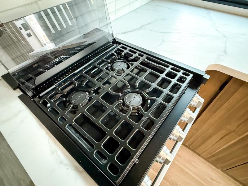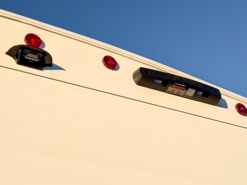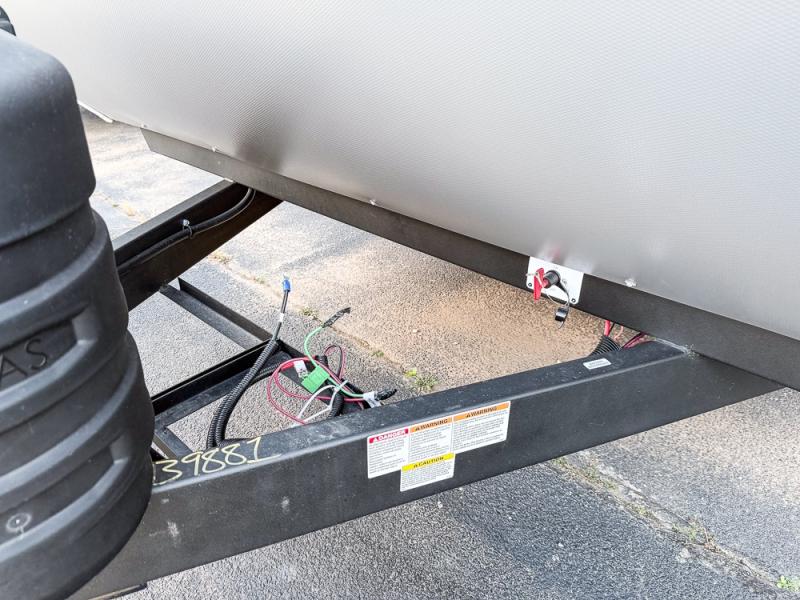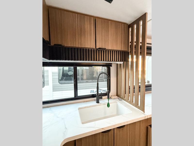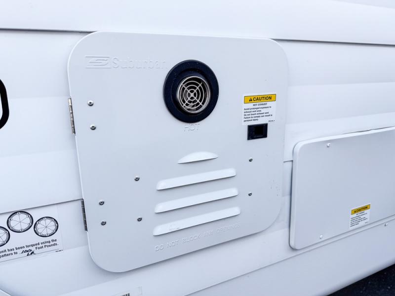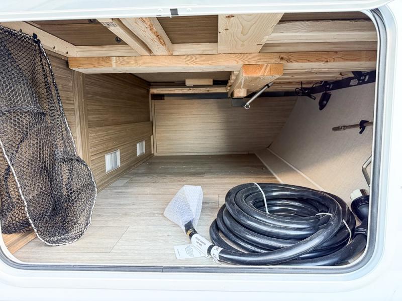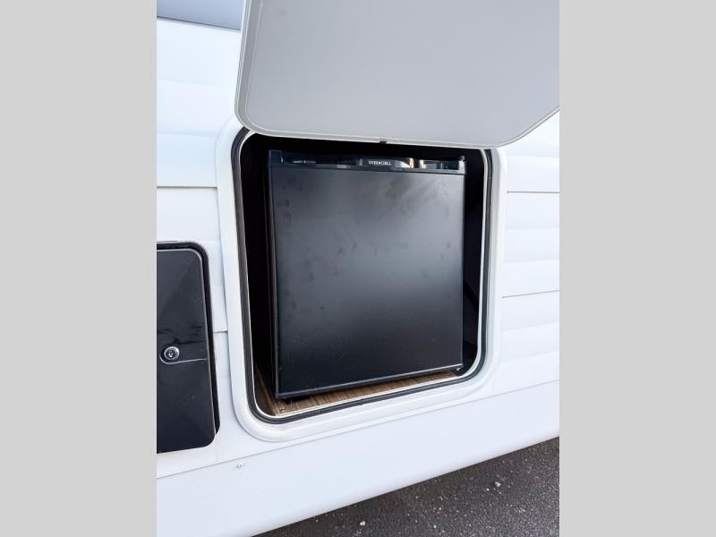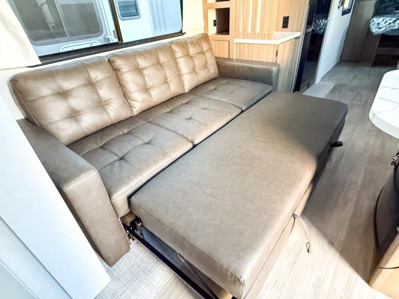 You can enjoy at-home comforts wherever you decide to camp in this travel trailer. The custom king bed with Versa Tilt includes dual shelves and a wardrobe so you can keep your space tidy. If you have a guest or two little ones, they can sleep on the jackknife sofa within the large slide out. Once you've made breakfast in the fully equipped kitchen, you can utilize the pull-out table to dine at. There is also a fireplace below the table, which will be perfect for cozy evenings indoors. And don't overlook the full rear bath, complete with a spacious shower, a toilet, bath shelves, and ample counter space!