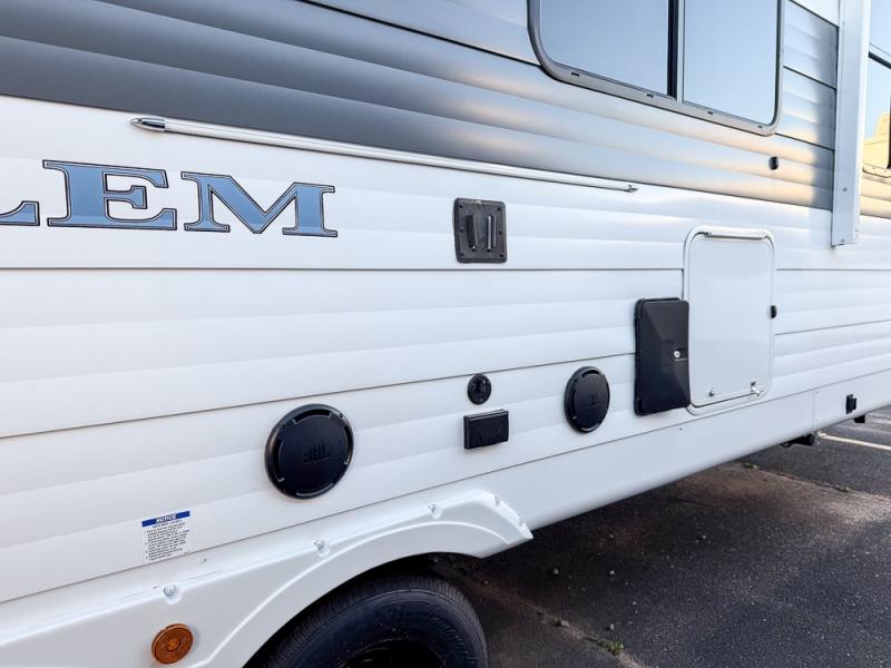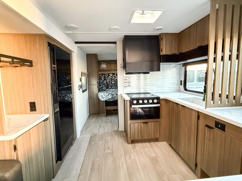 The Salem travel trailers are packed with hassle-free camping amenities and there are a variety of floorplans to choose from. The heated and enclosed Accessibelly will help protect against the elements and debris during transport, and the exterior retro/metal redesign is sure to be eye-catching! There are stylish roller shades inside, along with updated backsplash, elegant curtain rods and curtains, plus many more interior comforts! Choose a Salem travel trailer today for quality and value!