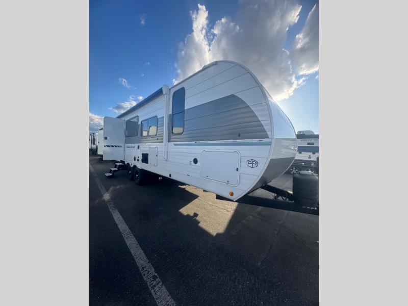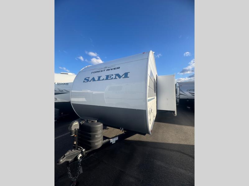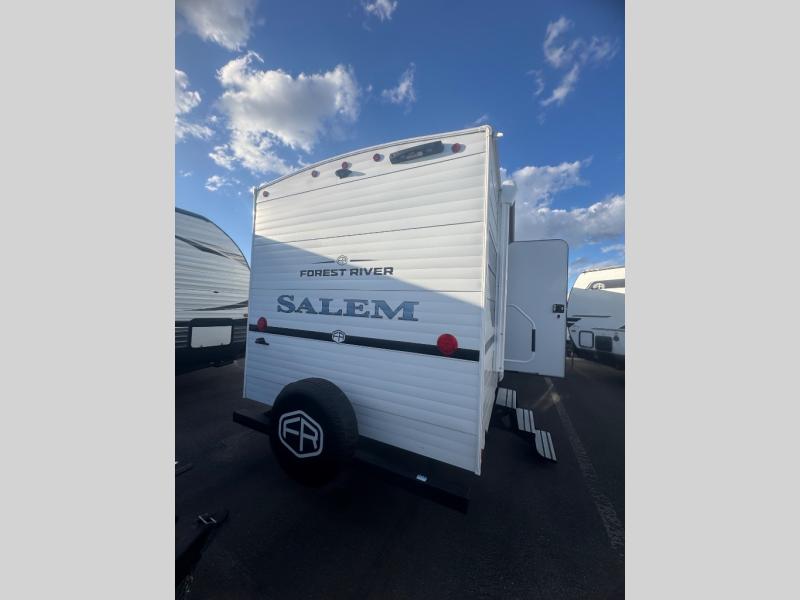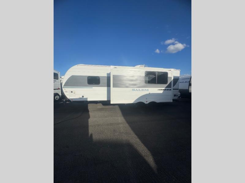 The Salem travel trailers are packed with hassle-free camping amenities and there are a variety of floorplans to choose from. The heated and enclosed Accessibelly will help protect against the elements and debris during transport, and the exterior retro/metal redesign is sure to be eye-catching! There are stylish roller shades inside, along with updated backsplash, elegant curtain rods and curtains, plus many more interior comforts! Choose a Salem travel trailer today for quality and value!