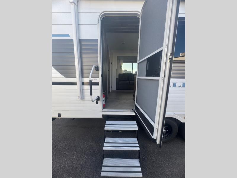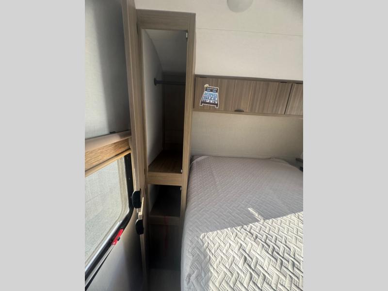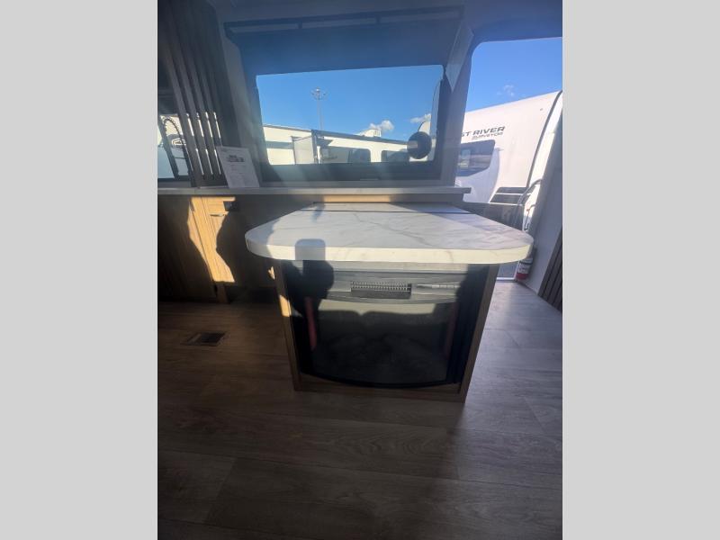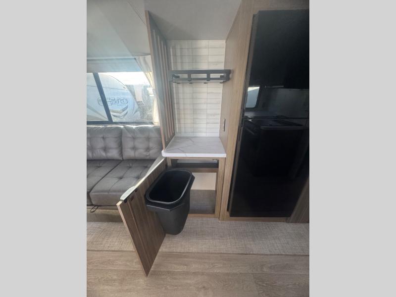 You can enjoy at-home comforts wherever you decide to camp in this travel trailer. The custom king bed with Versa Tilt includes dual shelves and a wardrobe so you can keep your space tidy. If you have a guest or two little ones, they can sleep on the jackknife sofa within the large slide out. Once you've made breakfast in the fully equipped kitchen, you can utilize the pull-out table to dine at. There is also a fireplace below the table, which will be perfect for cozy evenings indoors. And don't overlook the full rear bath, complete with a spacious shower, a toilet, bath shelves, and ample counter space!
