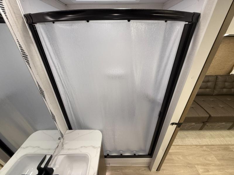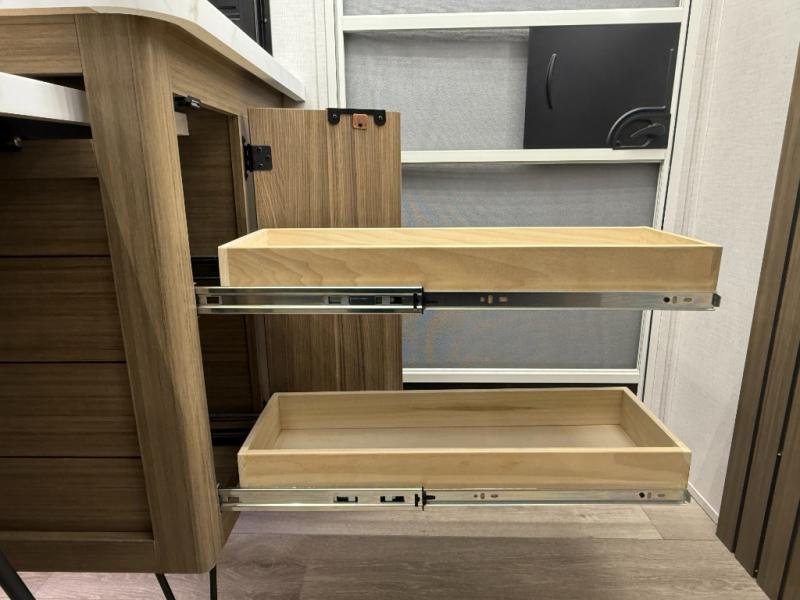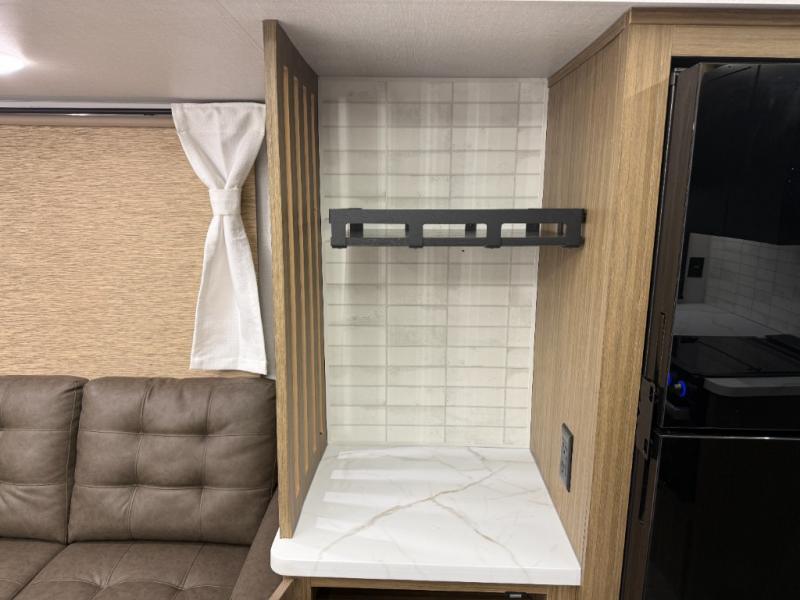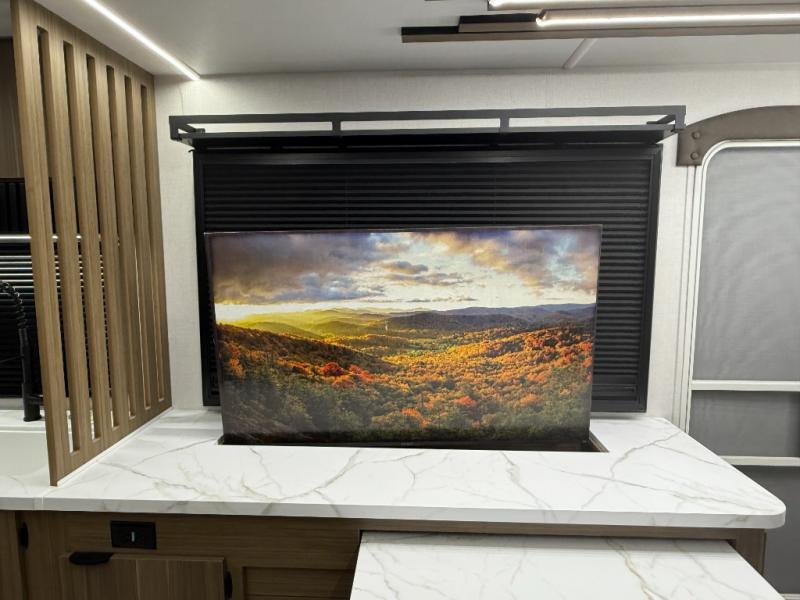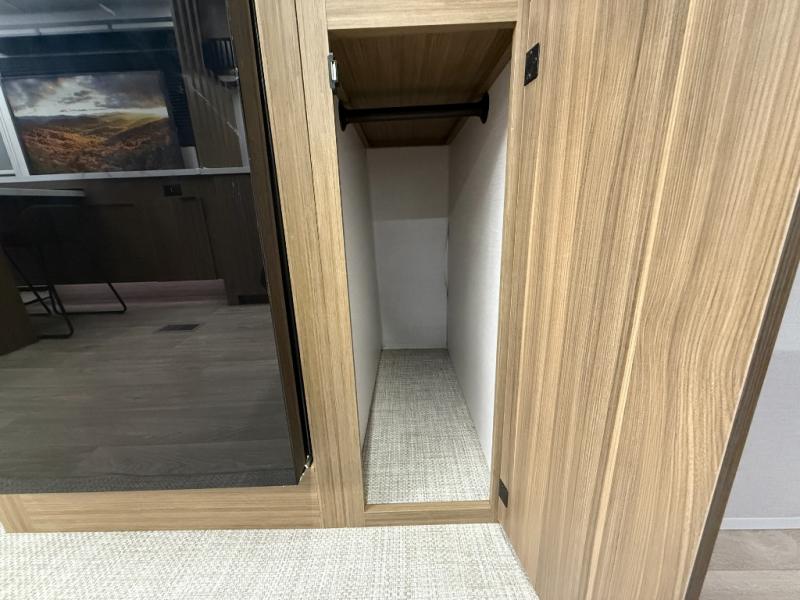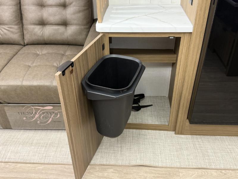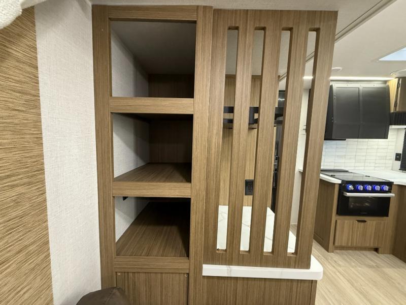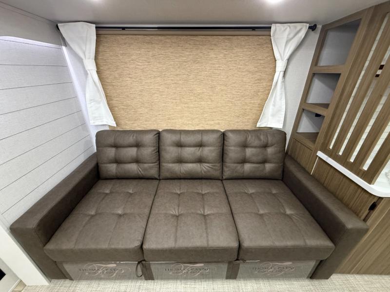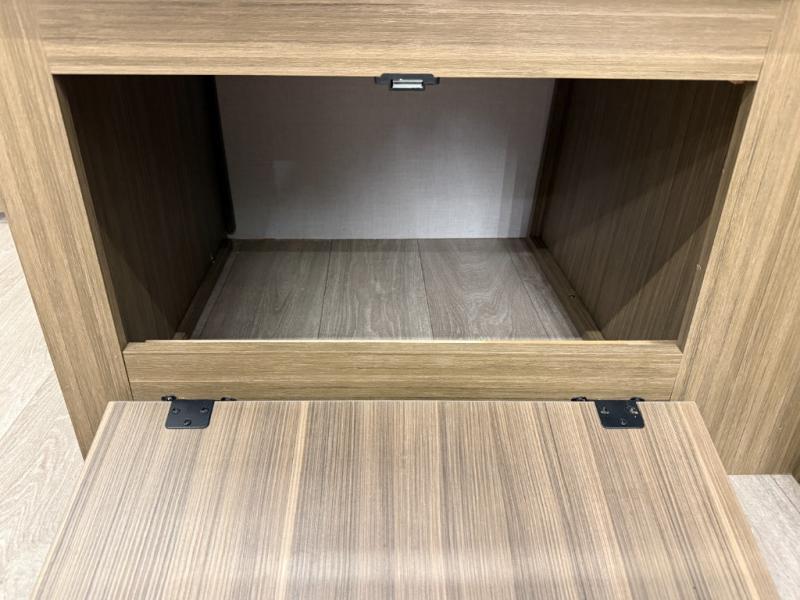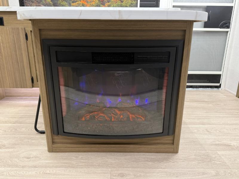 You can enjoy at-home comforts wherever you decide to camp in this travel trailer. The custom king bed with Versa Tilt includes dual shelves and a wardrobe so you can keep your space tidy. If you have a guest or two little ones, they can sleep on the jackknife sofa within the large slide out. Once you've made breakfast in the fully equipped kitchen, you can utilize the pull-out table to dine at. There is also a fireplace below the table, which will be perfect for cozy evenings indoors. And don't overlook the full rear bath, complete with a spacious shower, a toilet, bath shelves, and ample counter space!