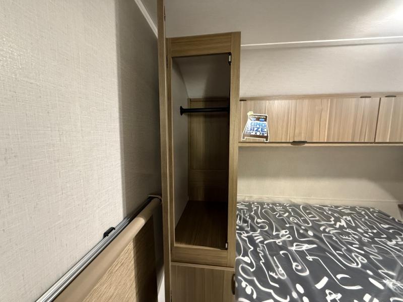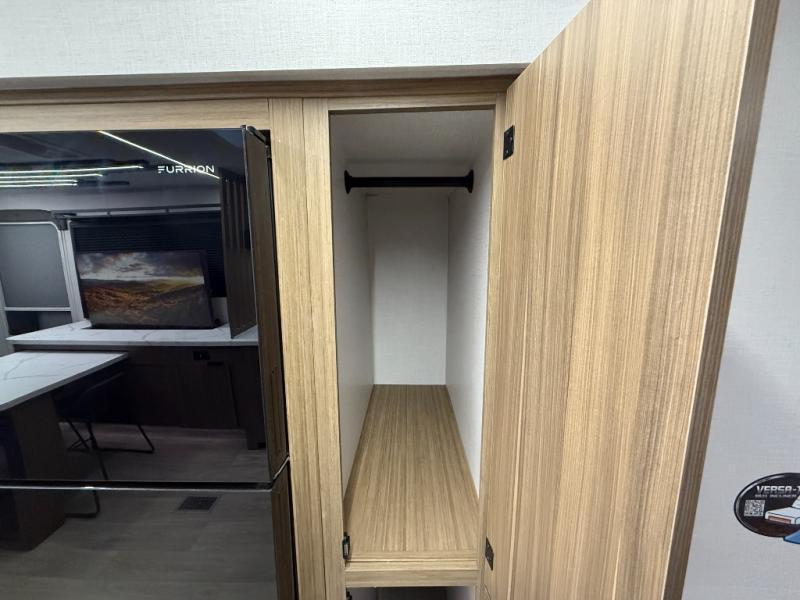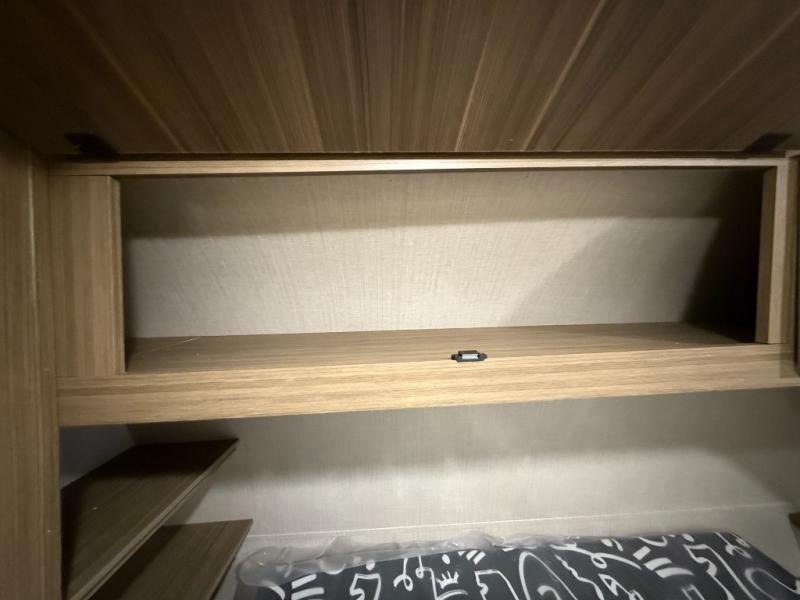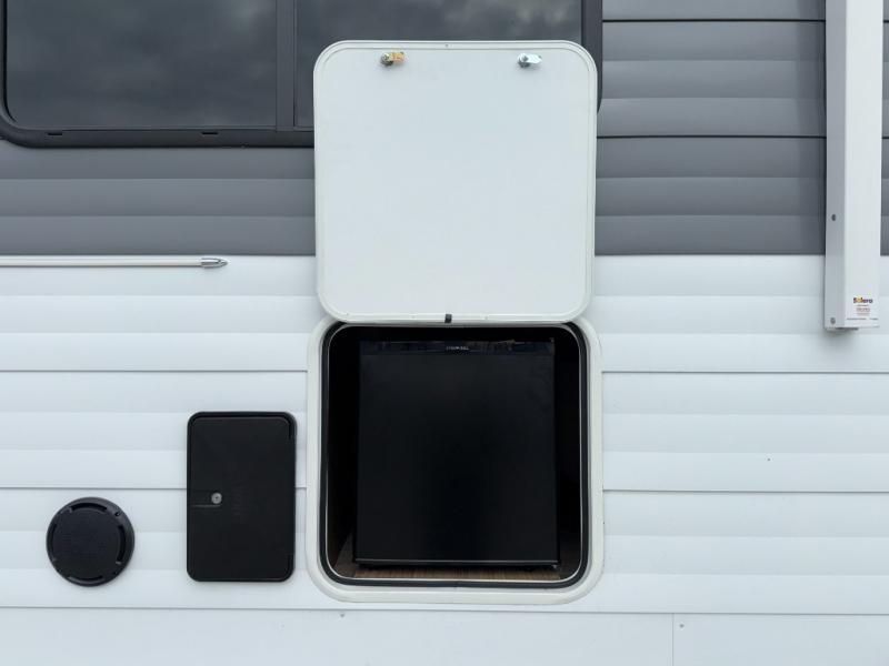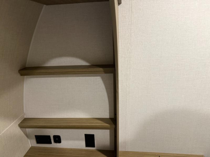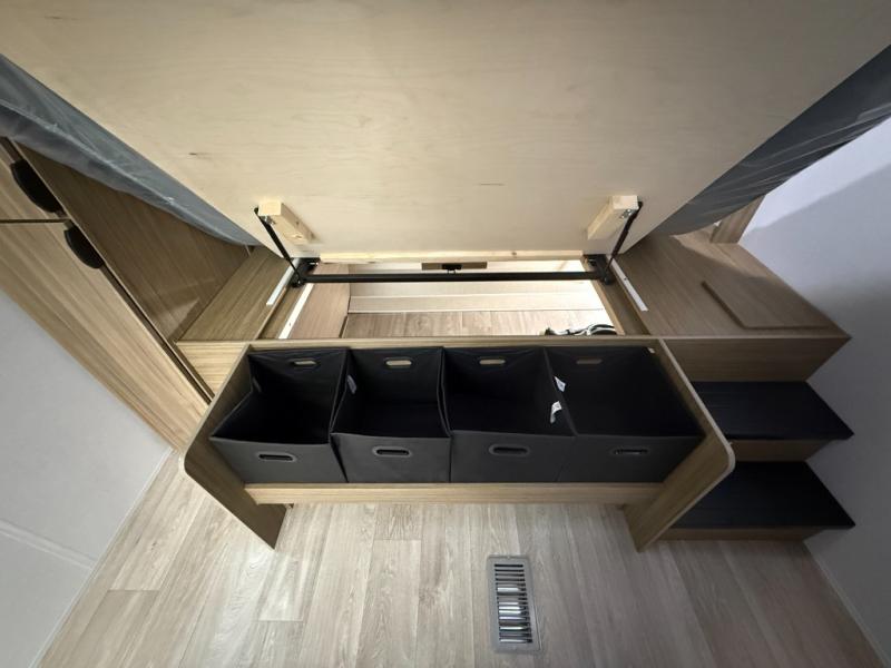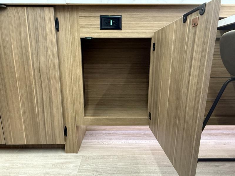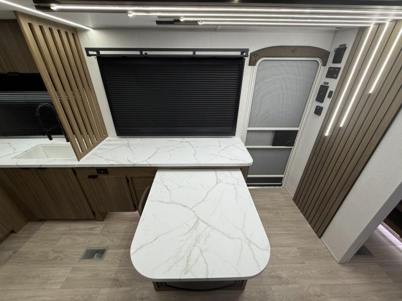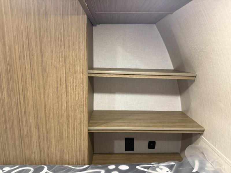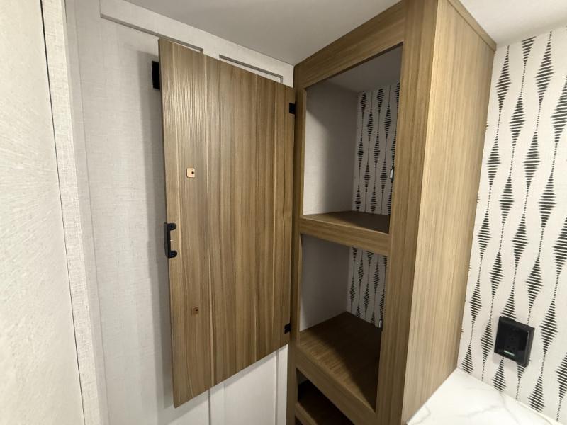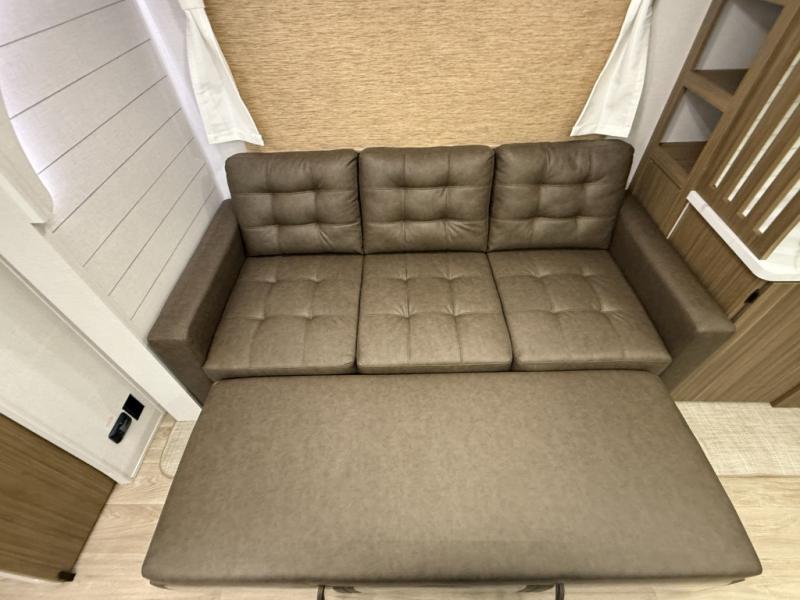 You can enjoy at-home comforts wherever you decide to camp in this travel trailer. The custom king bed with Versa Tilt includes dual shelves and a wardrobe so you can keep your space tidy. If you have a guest or two little ones, they can sleep on the jackknife sofa within the large slide out. Once you've made breakfast in the fully equipped kitchen, you can utilize the pull-out table to dine at. There is also a fireplace below the table, which will be perfect for cozy evenings indoors. And don't overlook the full rear bath, complete with a spacious shower, a toilet, bath shelves, and ample counter space!