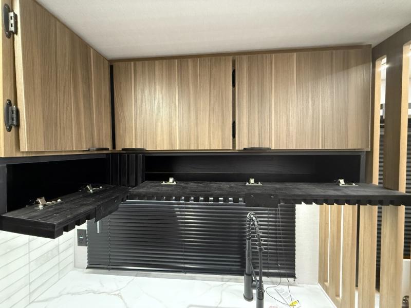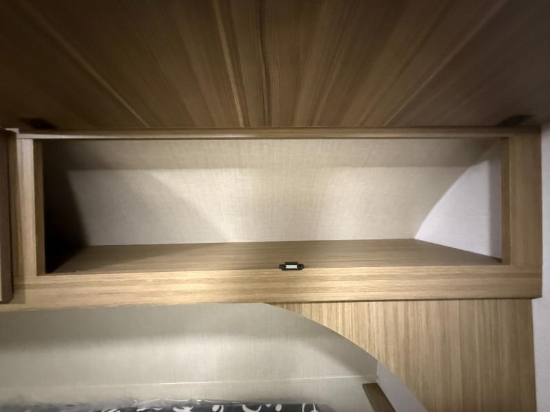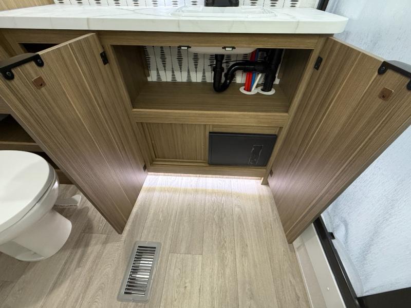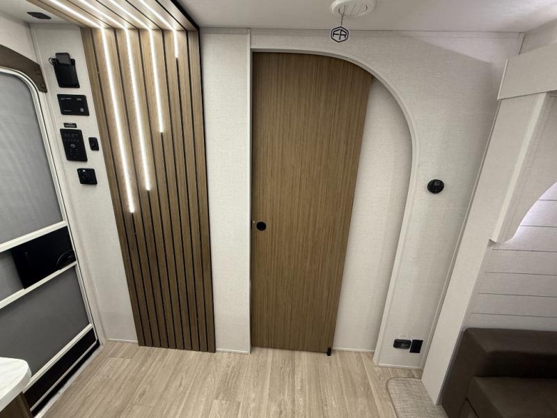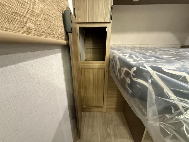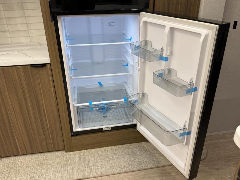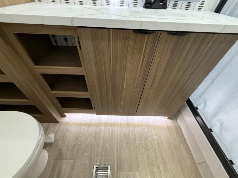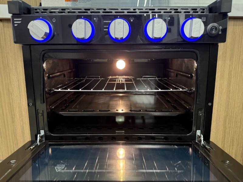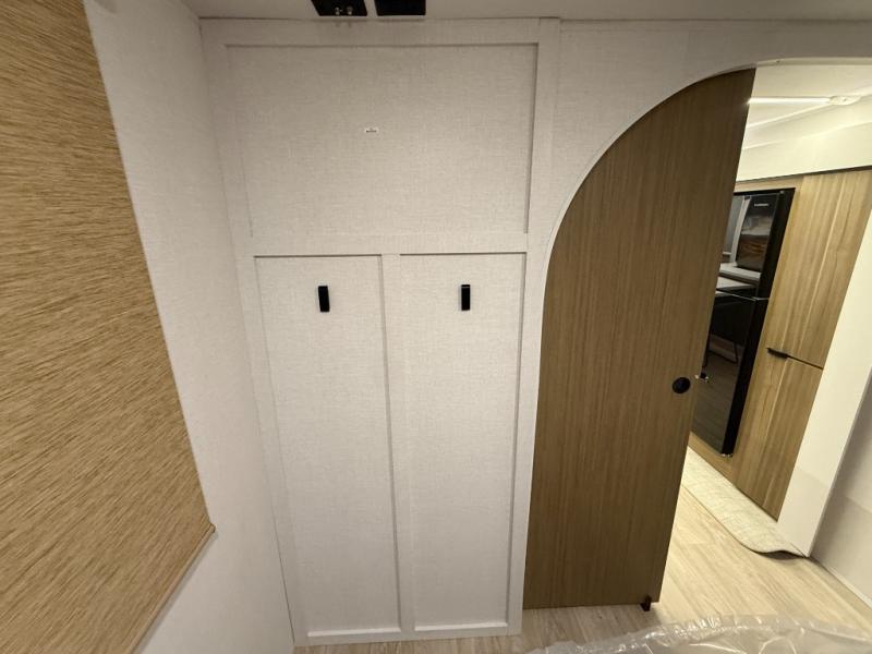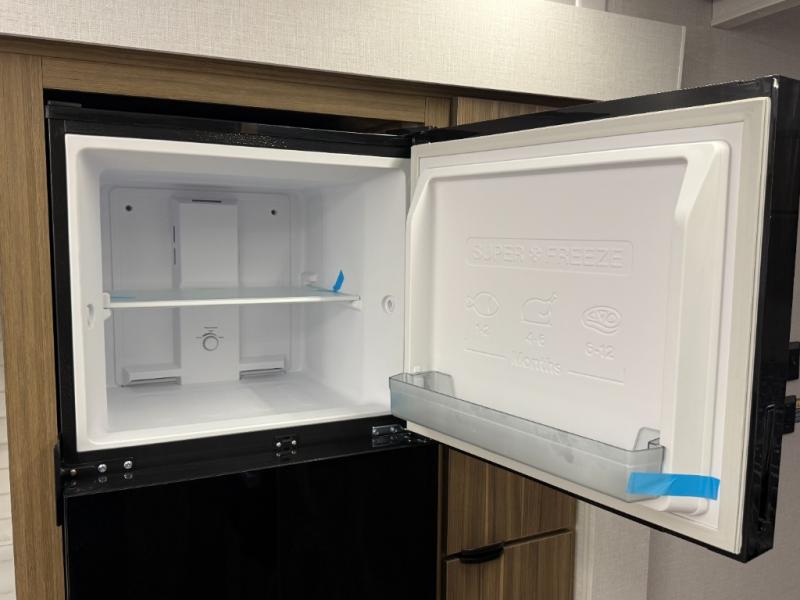 You can enjoy at-home comforts wherever you decide to camp in this travel trailer. The custom king bed with Versa Tilt includes dual shelves and a wardrobe so you can keep your space tidy. If you have a guest or two little ones, they can sleep on the jackknife sofa within the large slide out. Once you've made breakfast in the fully equipped kitchen, you can utilize the pull-out table to dine at. There is also a fireplace below the table, which will be perfect for cozy evenings indoors. And don't overlook the full rear bath, complete with a spacious shower, a toilet, bath shelves, and ample counter space!
