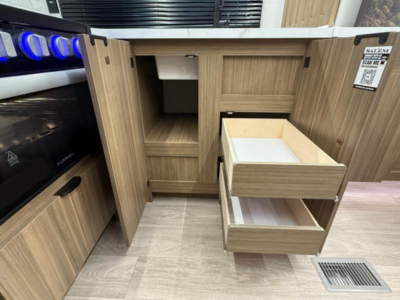 The Salem travel trailers are packed with hassle-free camping amenities and there are a variety of floorplans to choose from. The heated and enclosed Accessibelly will help protect against the elements and debris during transport, and the exterior retro/metal redesign is sure to be eye-catching! There are stylish roller shades inside, along with updated backsplash, elegant curtain rods and curtains, plus many more interior comforts! Choose a Salem travel trailer today for quality and value!