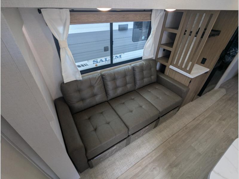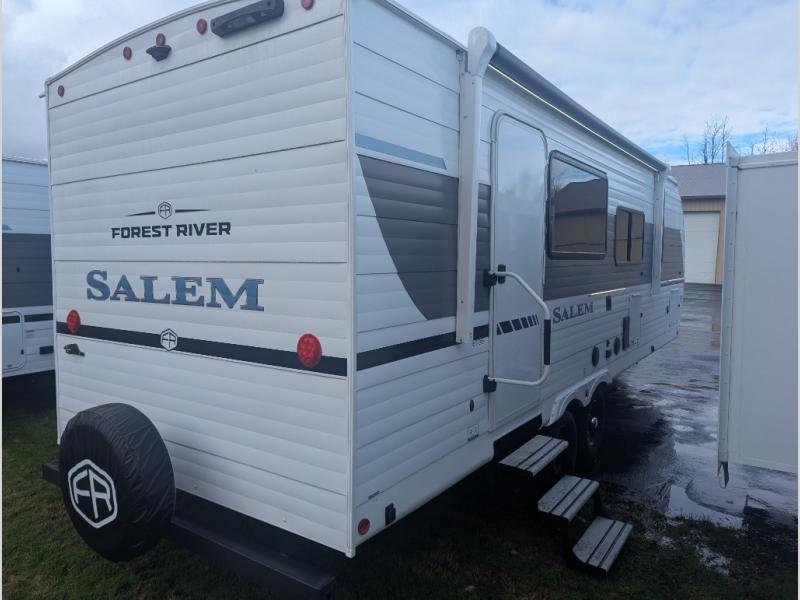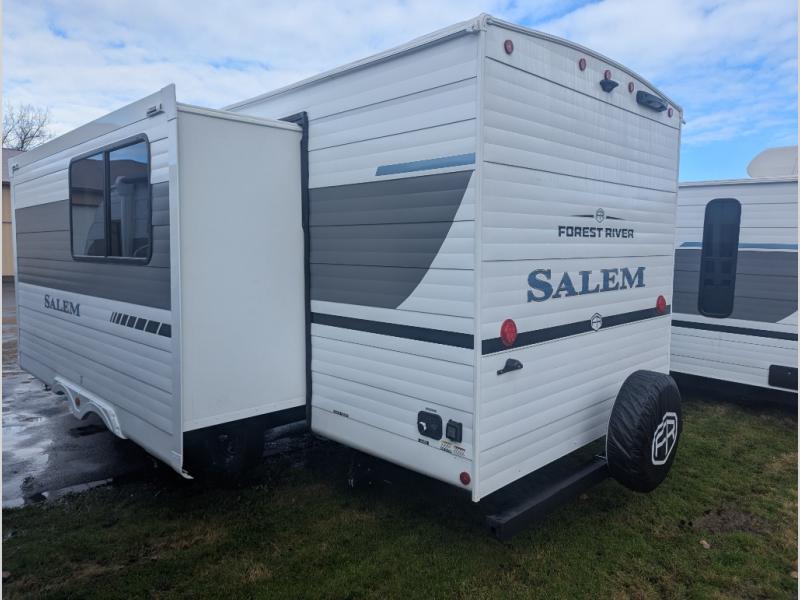 The Salem travel trailers are packed with hassle-free camping amenities and there are a variety of floorplans to choose from. The heated and enclosed Accessibelly will help protect against the elements and debris during transport, and the exterior retro/metal redesign is sure to be eye-catching! There are stylish roller shades inside, along with updated backsplash, elegant curtain rods and curtains, plus many more interior comforts! Choose a Salem travel trailer today for quality and value!