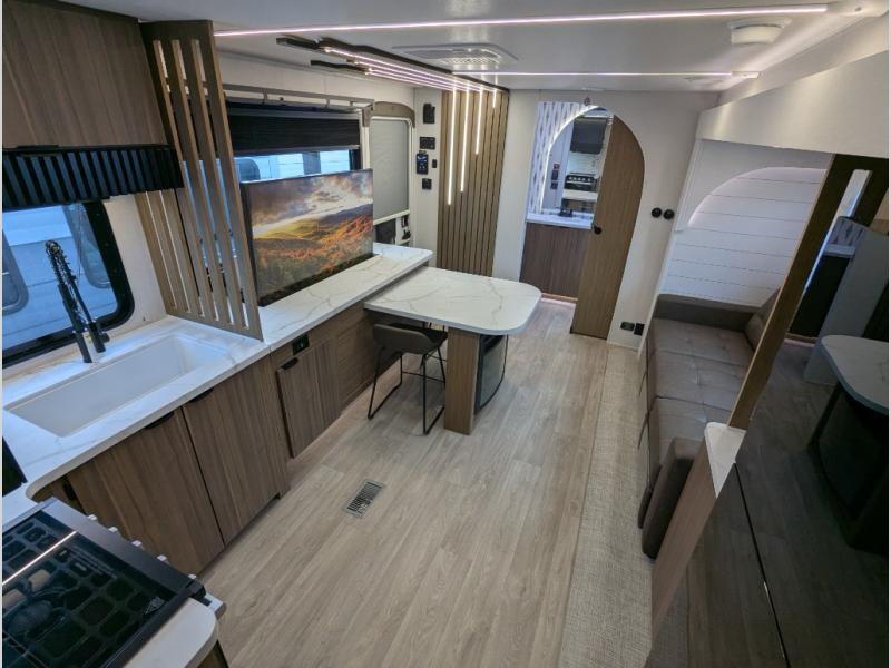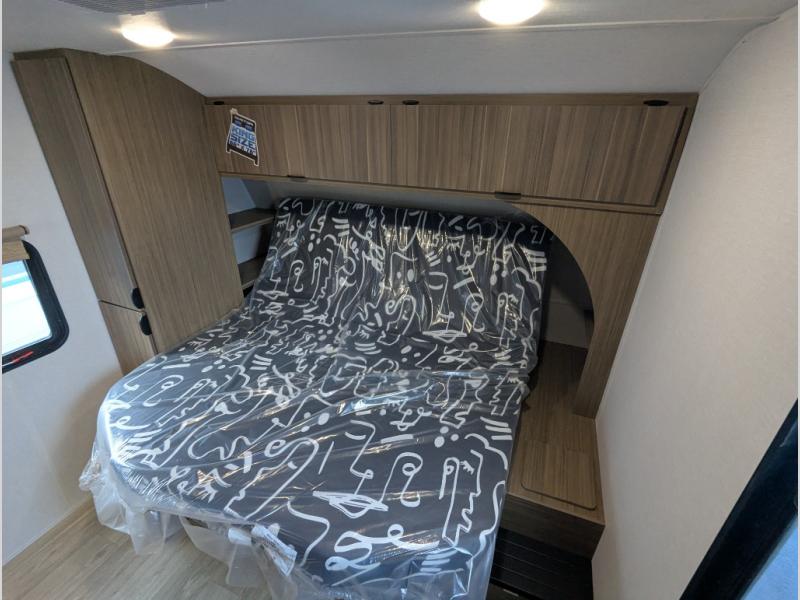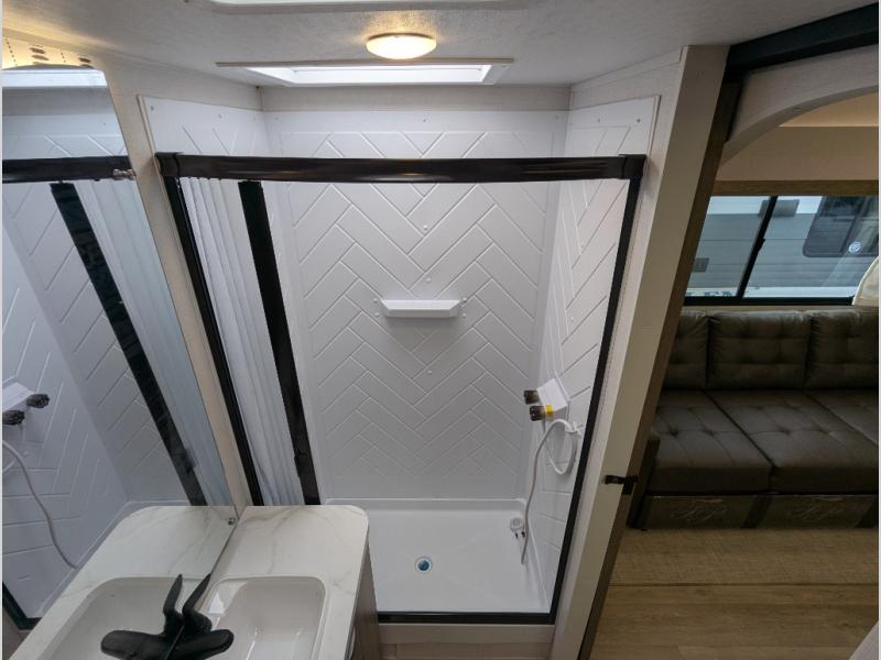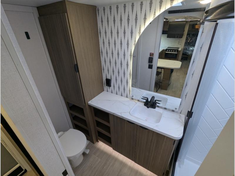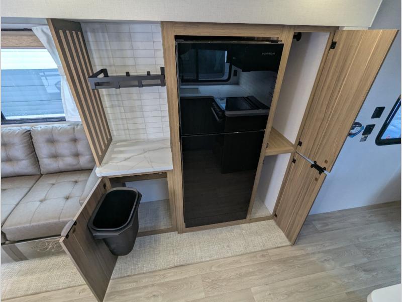 You can enjoy at-home comforts wherever you decide to camp in this travel trailer. The custom king bed with Versa Tilt includes dual shelves and a wardrobe so you can keep your space tidy. If you have a guest or two little ones, they can sleep on the jackknife sofa within the large slide out. Once you've made breakfast in the fully equipped kitchen, you can utilize the pull-out table to dine at. There is also a fireplace below the table, which will be perfect for cozy evenings indoors. And don't overlook the full rear bath, complete with a spacious shower, a toilet, bath shelves, and ample counter space!