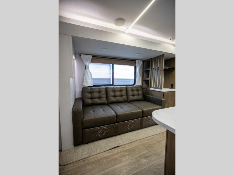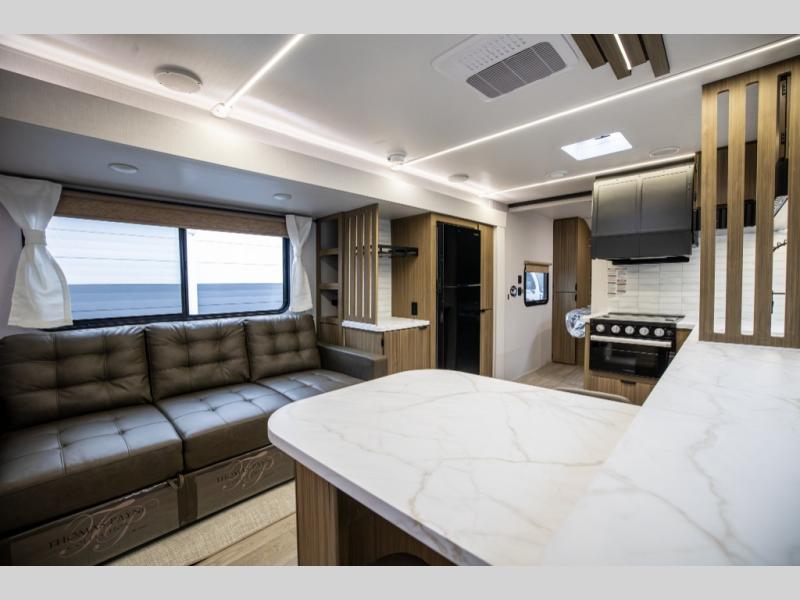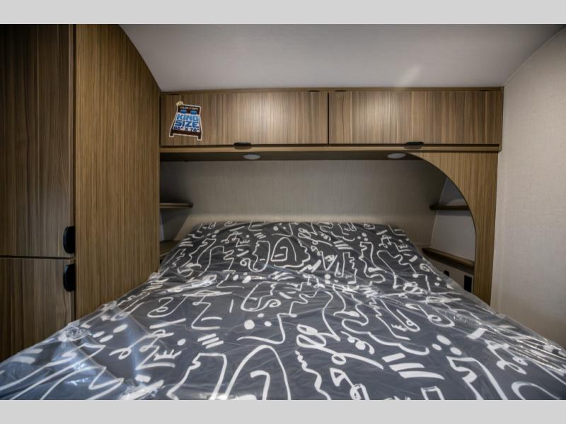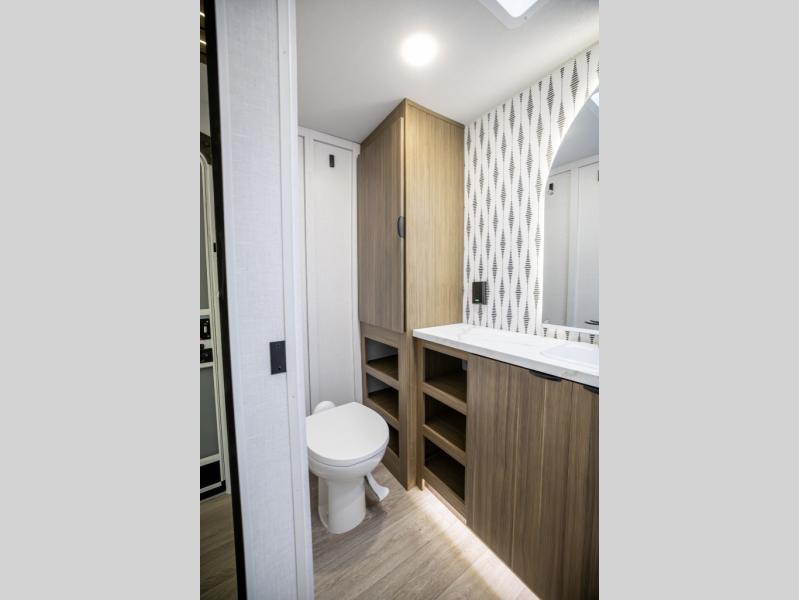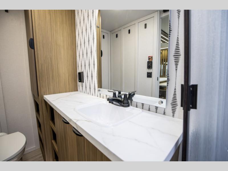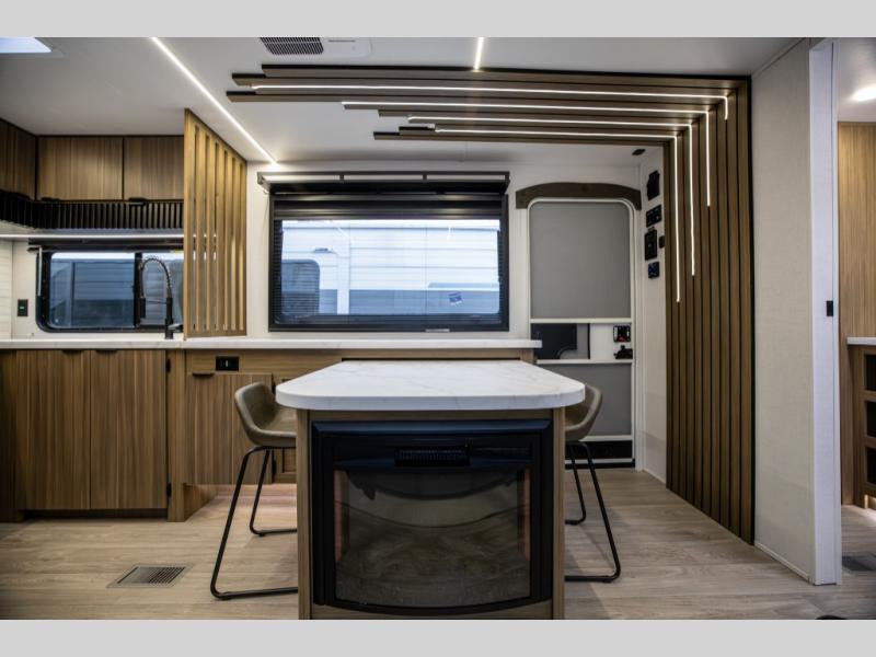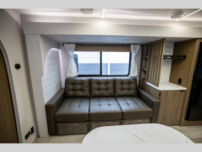 You can enjoy at-home comforts wherever you decide to camp in this travel trailer. The custom king bed with Versa Tilt includes dual shelves and a wardrobe so you can keep your space tidy. If you have a guest or two little ones, they can sleep on the jackknife sofa within the large slide out. Once you've made breakfast in the fully equipped kitchen, you can utilize the pull-out table to dine at. There is also a fireplace below the table, which will be perfect for cozy evenings indoors. And don't overlook the full rear bath, complete with a spacious shower, a toilet, bath shelves, and ample counter space!
