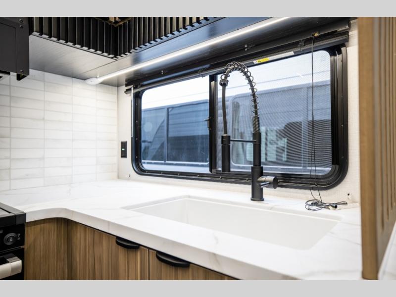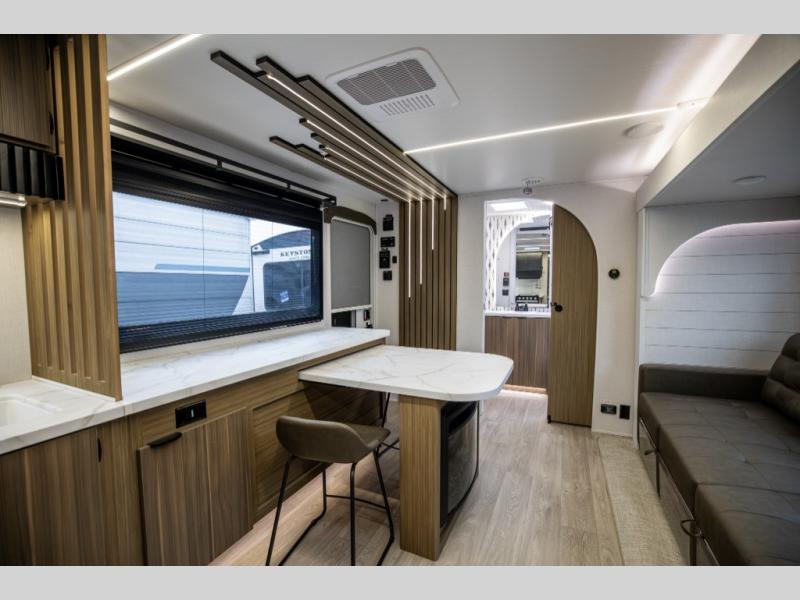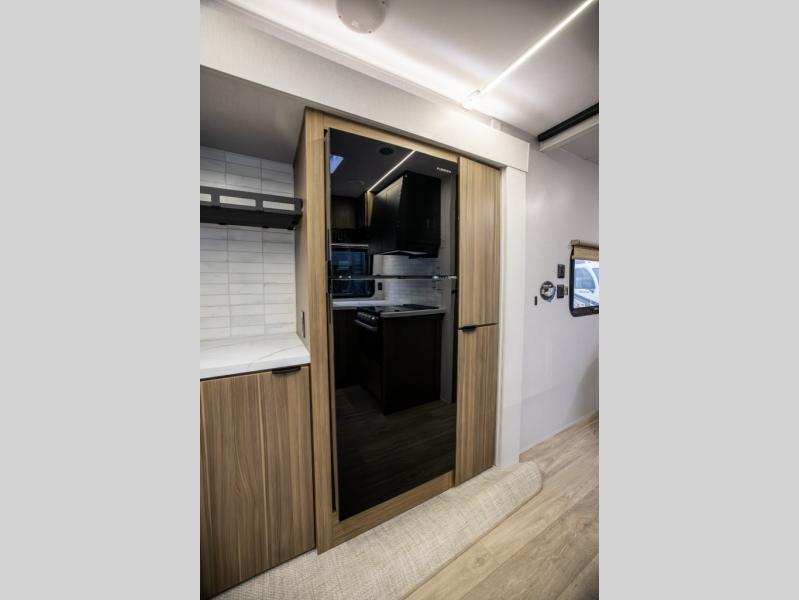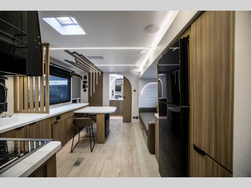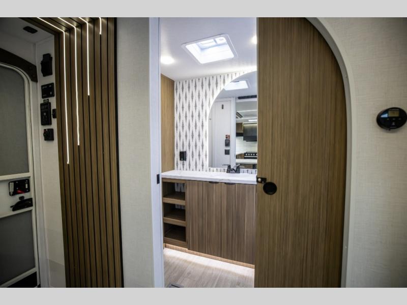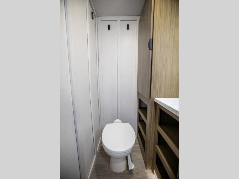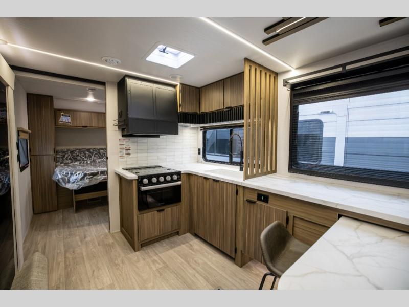 You can enjoy at-home comforts wherever you decide to camp in this travel trailer. The custom king bed with Versa Tilt includes dual shelves and a wardrobe so you can keep your space tidy. If you have a guest or two little ones, they can sleep on the jackknife sofa within the large slide out. Once you've made breakfast in the fully equipped kitchen, you can utilize the pull-out table to dine at. There is also a fireplace below the table, which will be perfect for cozy evenings indoors. And don't overlook the full rear bath, complete with a spacious shower, a toilet, bath shelves, and ample counter space!