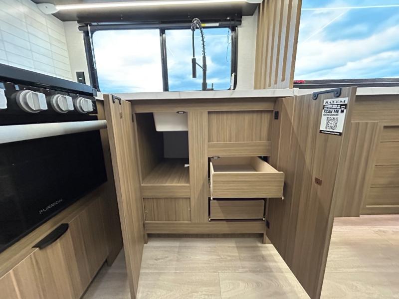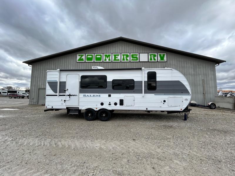 The Salem travel trailers are packed with hassle-free camping amenities and there are a variety of floorplans to choose from. The heated and enclosed Accessibelly will help protect against the elements and debris during transport, and the exterior retro/metal redesign is sure to be eye-catching! There are stylish roller shades inside, along with updated backsplash, elegant curtain rods and curtains, plus many more interior comforts! Choose a Salem travel trailer today for quality and value!