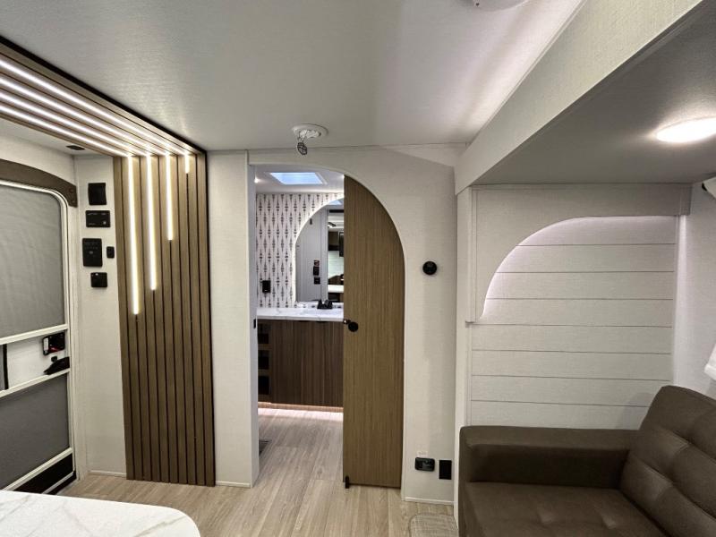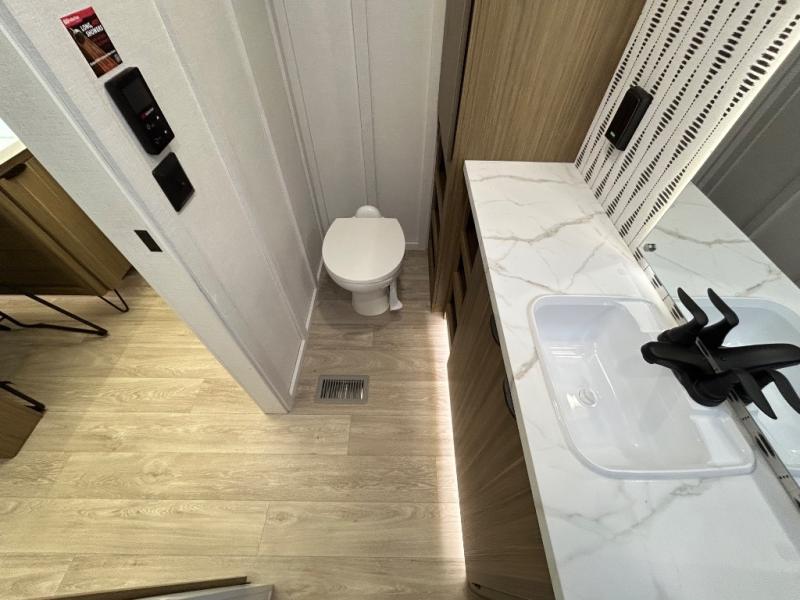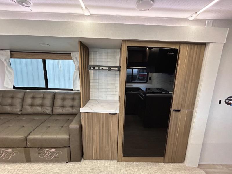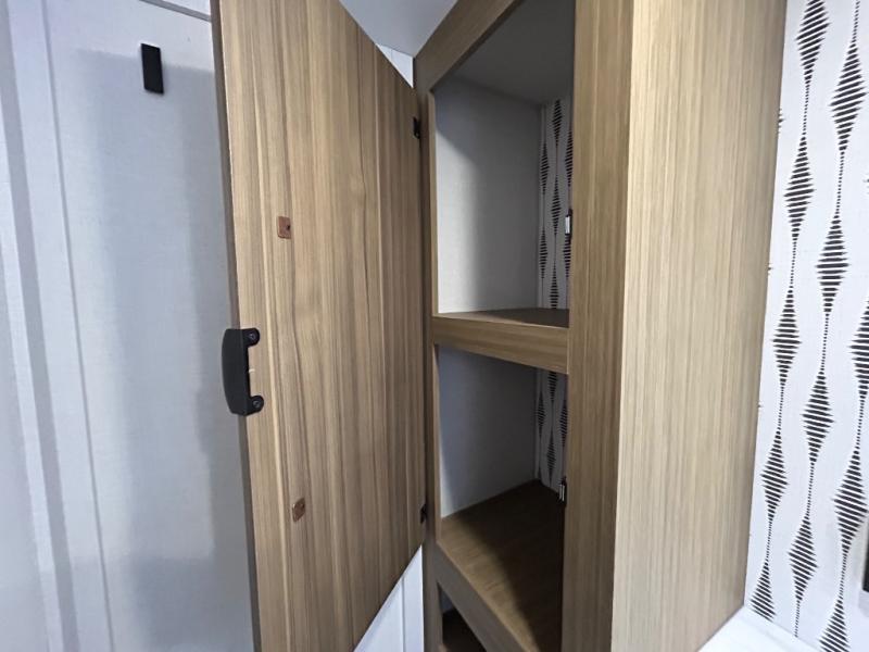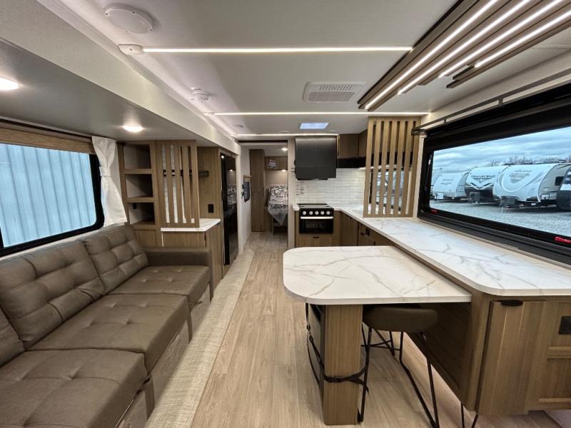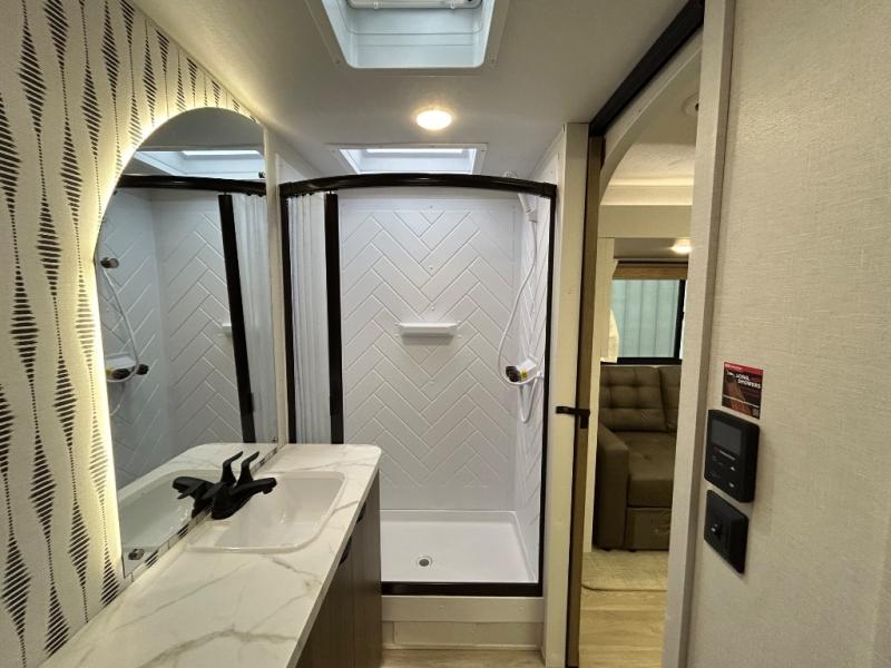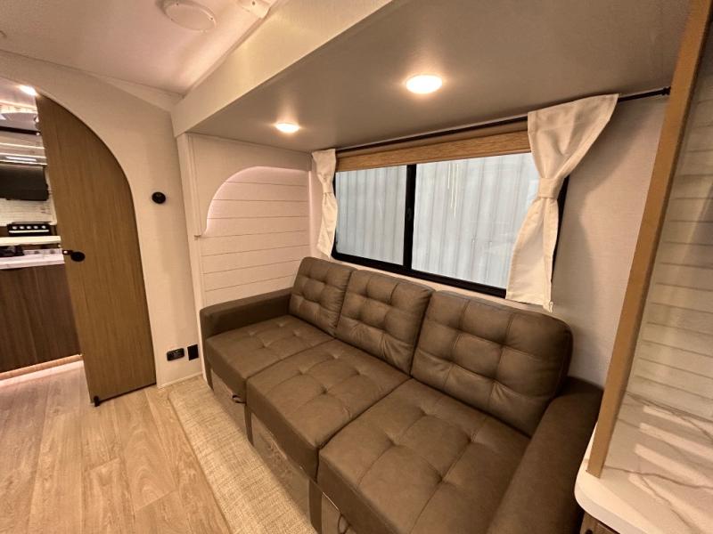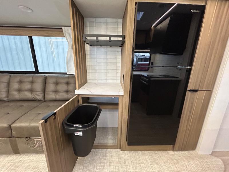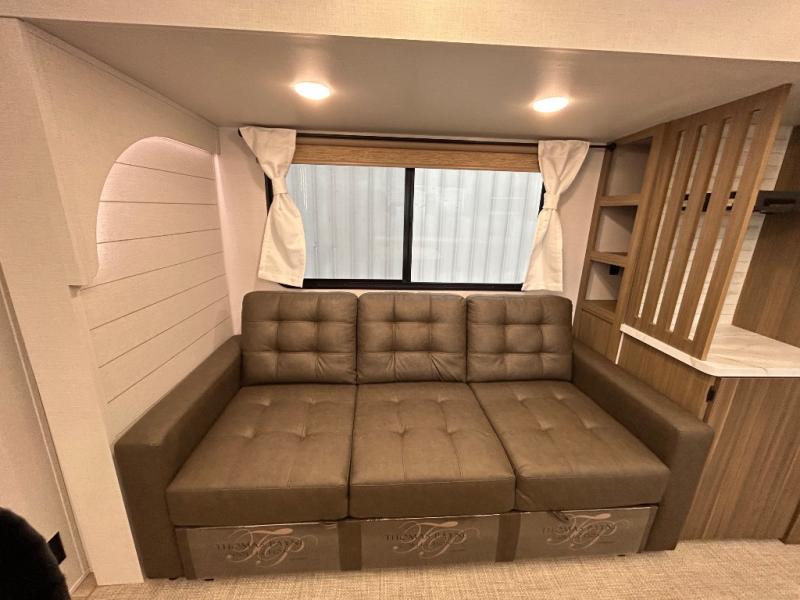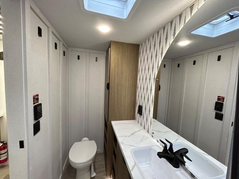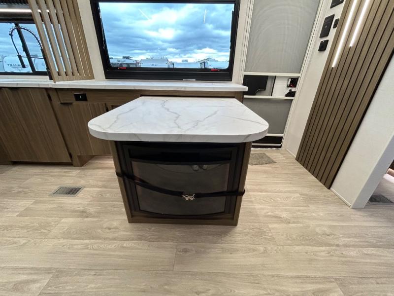 You can enjoy at-home comforts wherever you decide to camp in this travel trailer. The custom king bed with Versa Tilt includes dual shelves and a wardrobe so you can keep your space tidy. If you have a guest or two little ones, they can sleep on the jackknife sofa within the large slide out. Once you've made breakfast in the fully equipped kitchen, you can utilize the pull-out table to dine at. There is also a fireplace below the table, which will be perfect for cozy evenings indoors. And don't overlook the full rear bath, complete with a spacious shower, a toilet, bath shelves, and ample counter space!