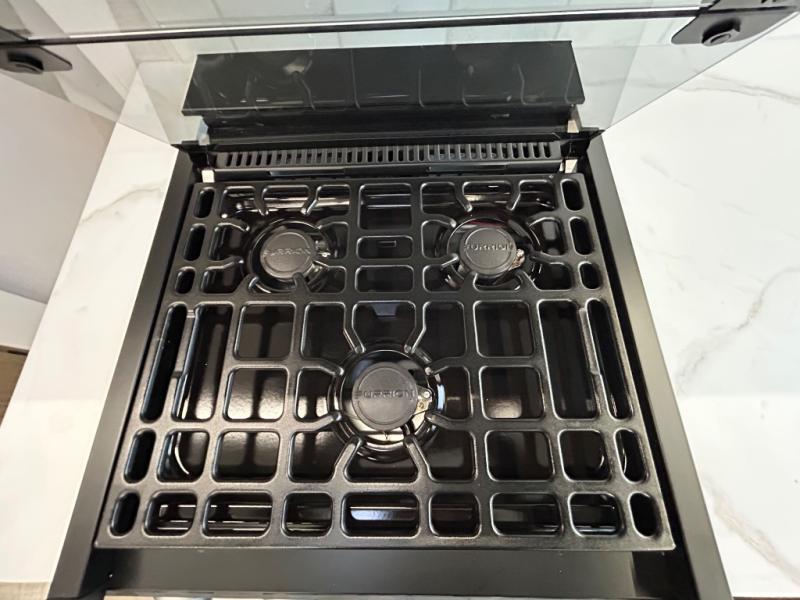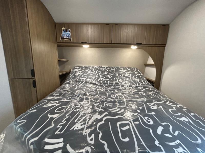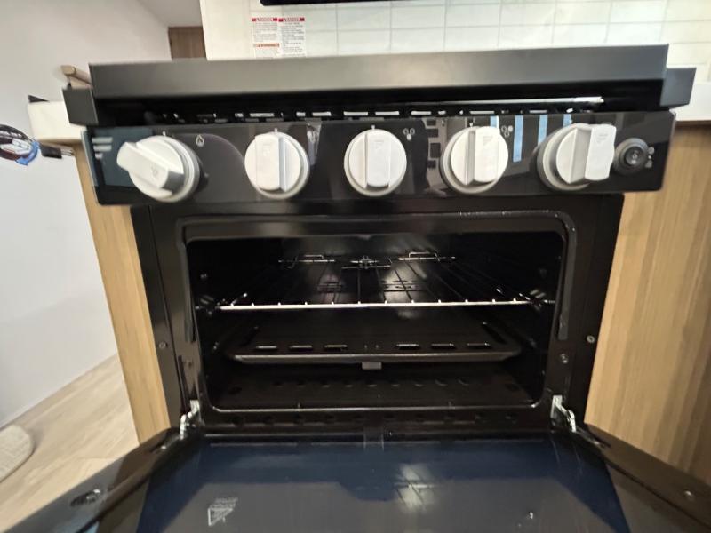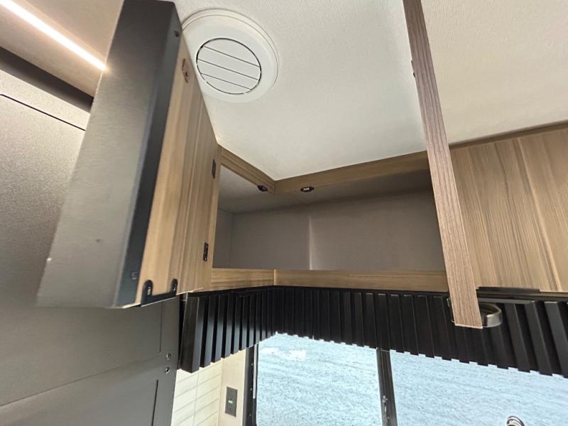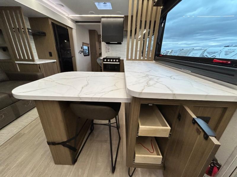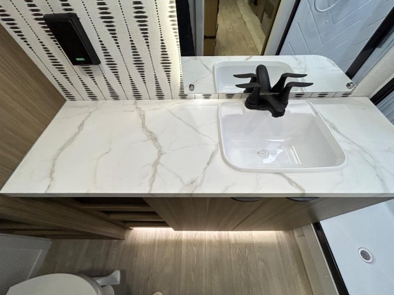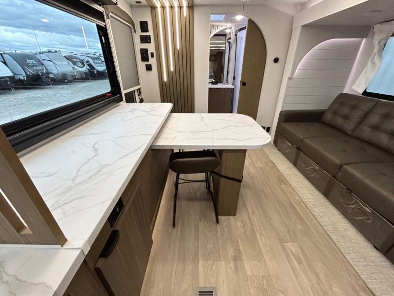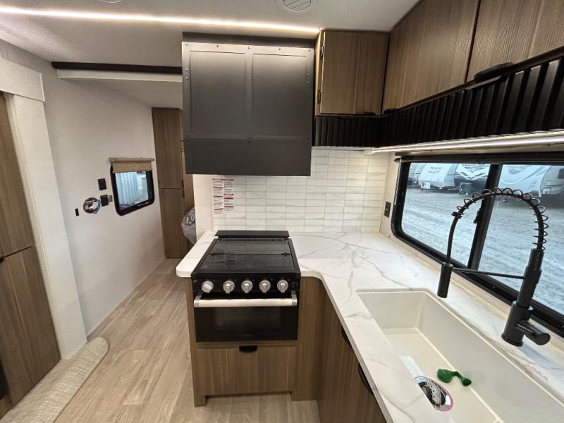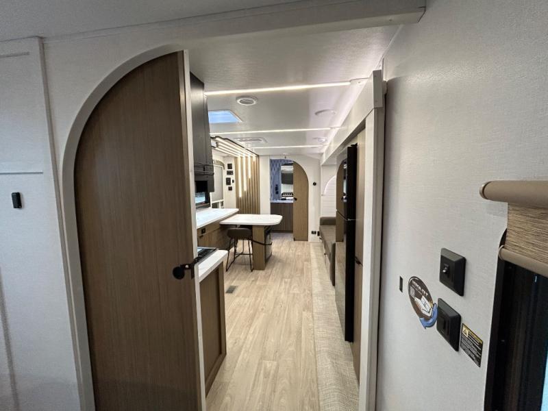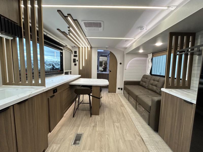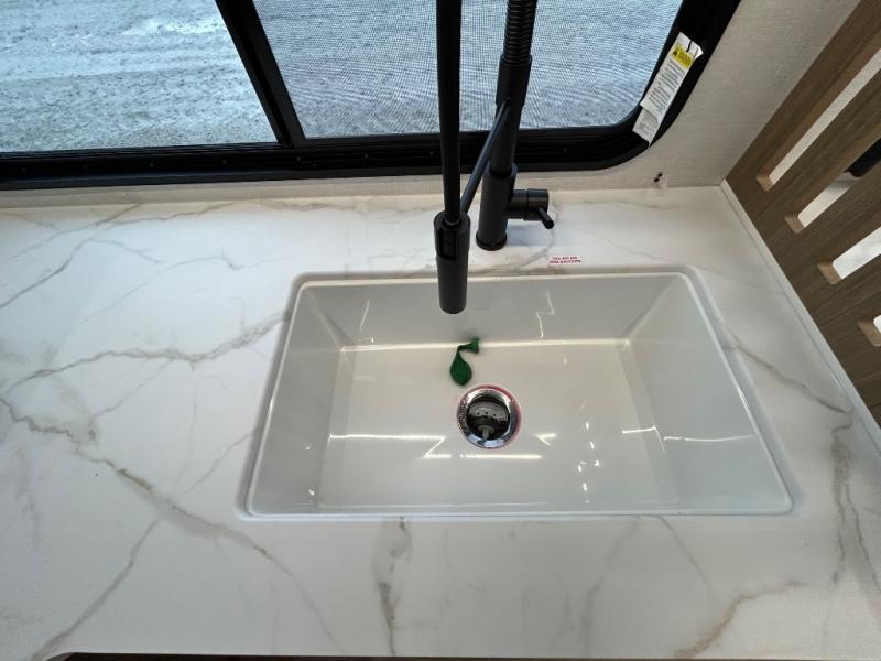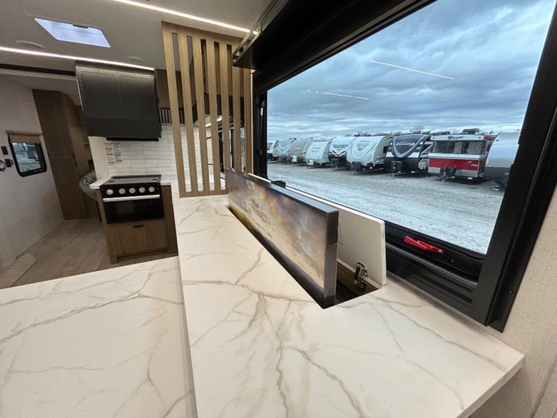 You can enjoy at-home comforts wherever you decide to camp in this travel trailer. The custom king bed with Versa Tilt includes dual shelves and a wardrobe so you can keep your space tidy. If you have a guest or two little ones, they can sleep on the jackknife sofa within the large slide out. Once you've made breakfast in the fully equipped kitchen, you can utilize the pull-out table to dine at. There is also a fireplace below the table, which will be perfect for cozy evenings indoors. And don't overlook the full rear bath, complete with a spacious shower, a toilet, bath shelves, and ample counter space!