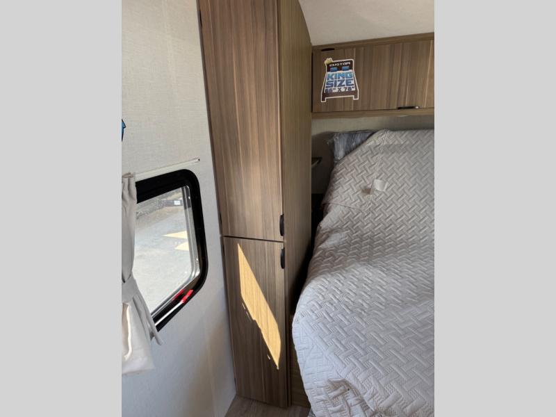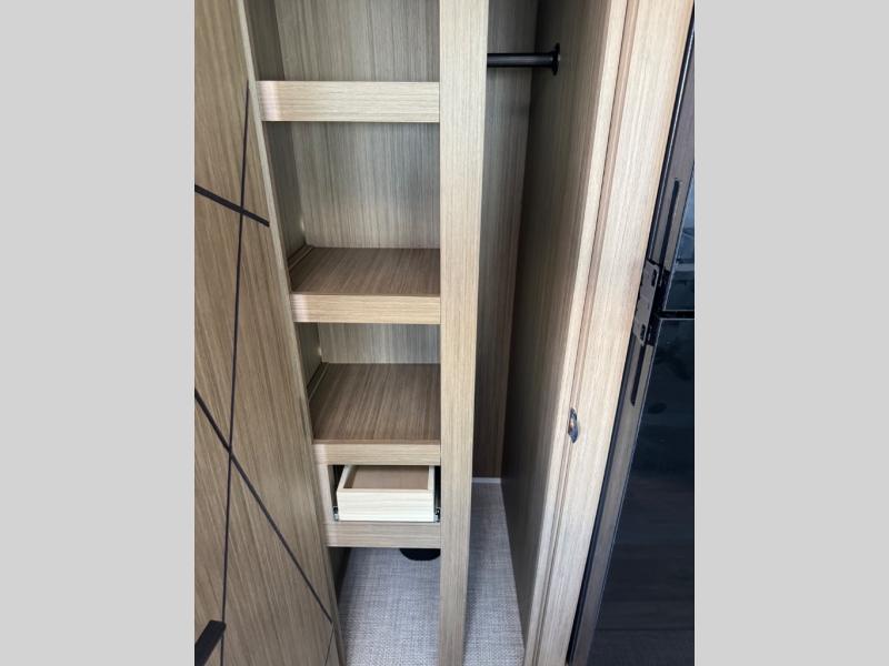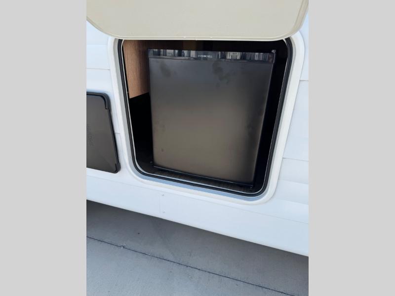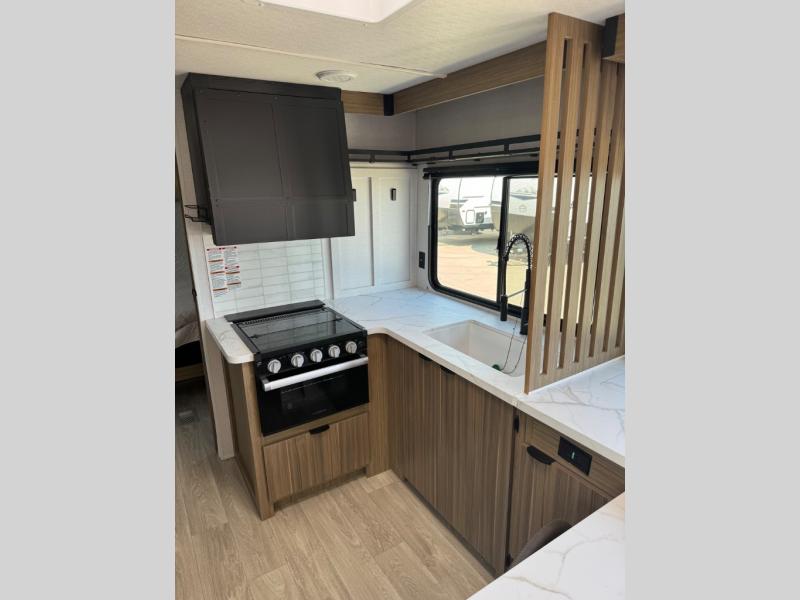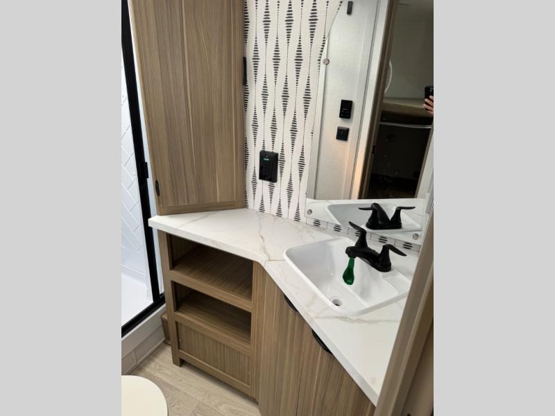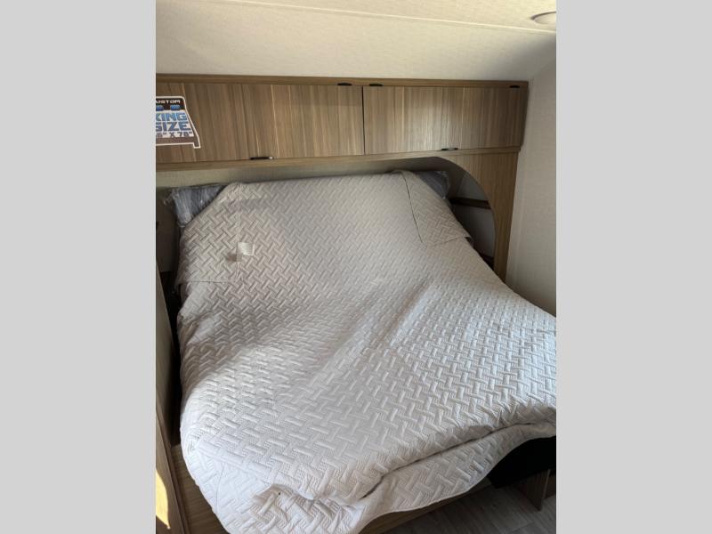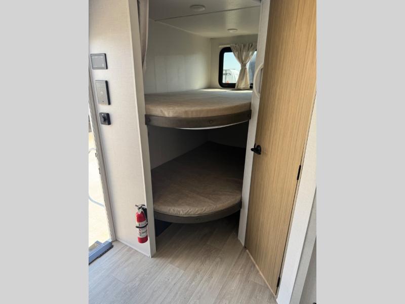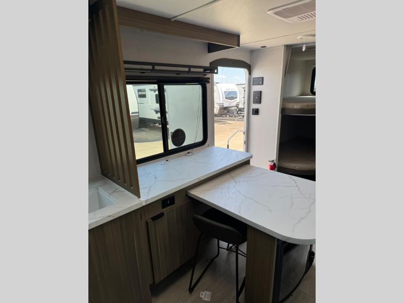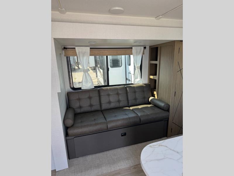 You can enjoy at-home comforts wherever you decide to camp in this travel trailer. The custom king bed with Versa Tilt includes dual shelves and a wardrobe so you can keep your space tidy. If you have a guest or two little ones, they can sleep on the jackknife sofa within the large slide out or on the double-size bunks right next to the full bath. Once you've made breakfast in the fully equipped kitchen, you can utilize the pull-out table to dine at. There is also a fireplace below the table, which will be perfect for cozy evenings indoors.