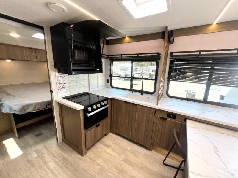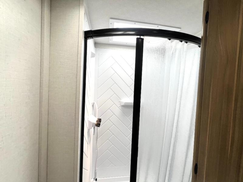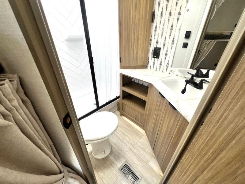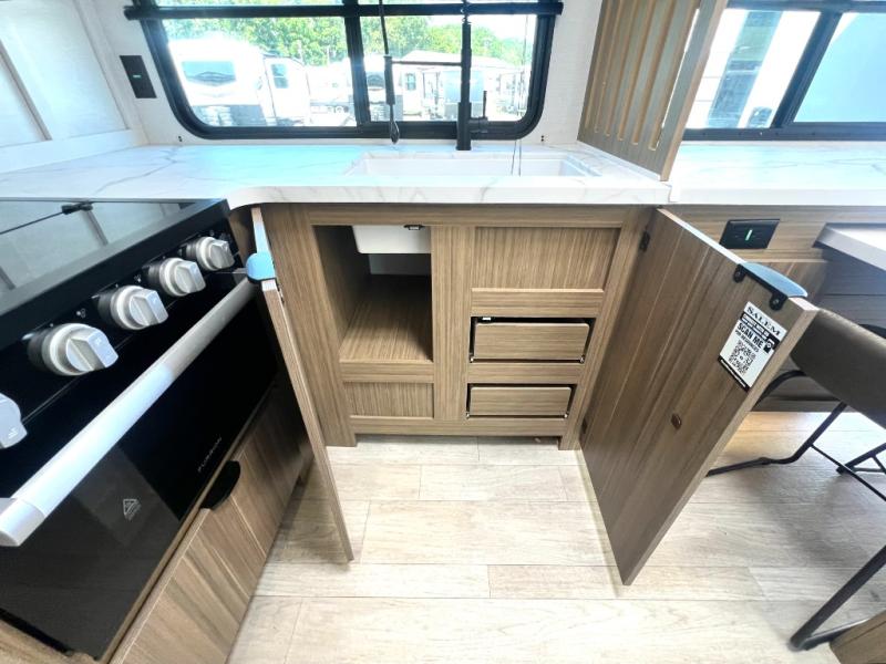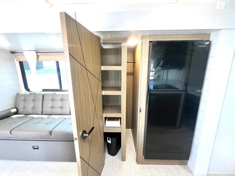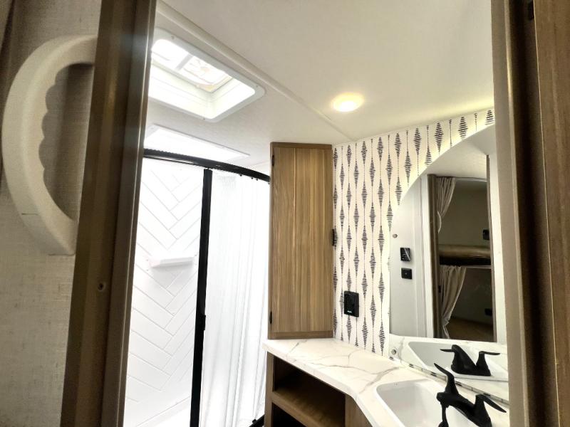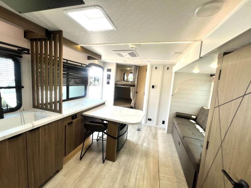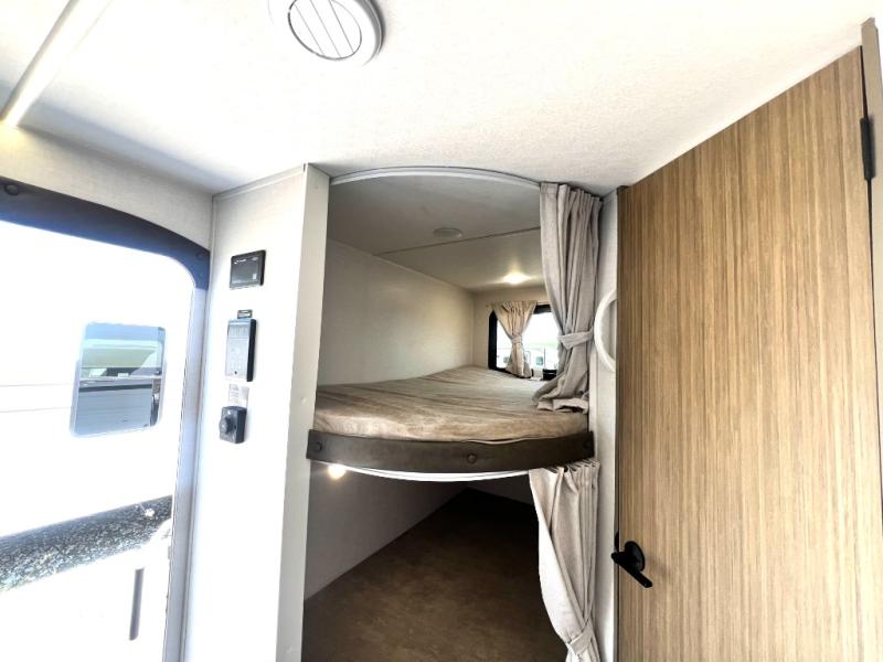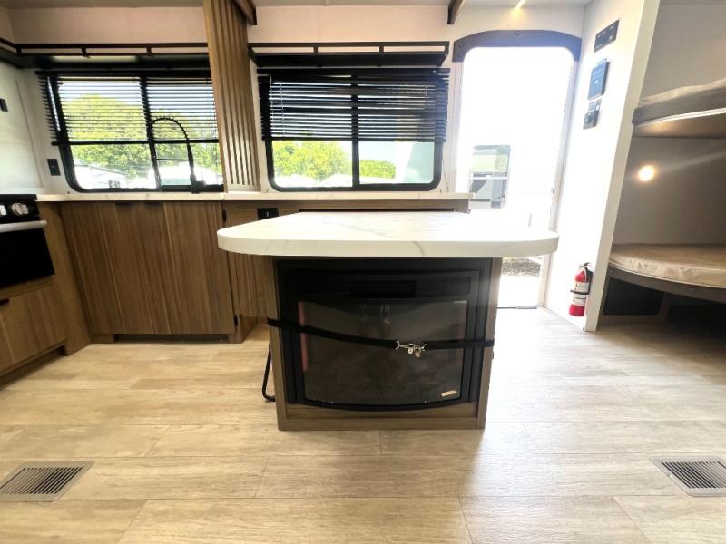 You can enjoy at-home comforts wherever you decide to camp in this travel trailer. The custom king bed with Versa Tilt includes dual shelves and a wardrobe so you can keep your space tidy. If you have a guest or two little ones, they can sleep on the jackknife sofa within the large slide out or on the double-size bunks right next to the full bath. Once you've made breakfast in the fully equipped kitchen, you can utilize the pull-out table to dine at. There is also a fireplace below the table, which will be perfect for cozy evenings indoors.