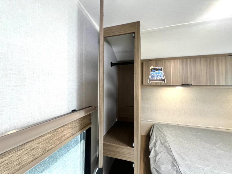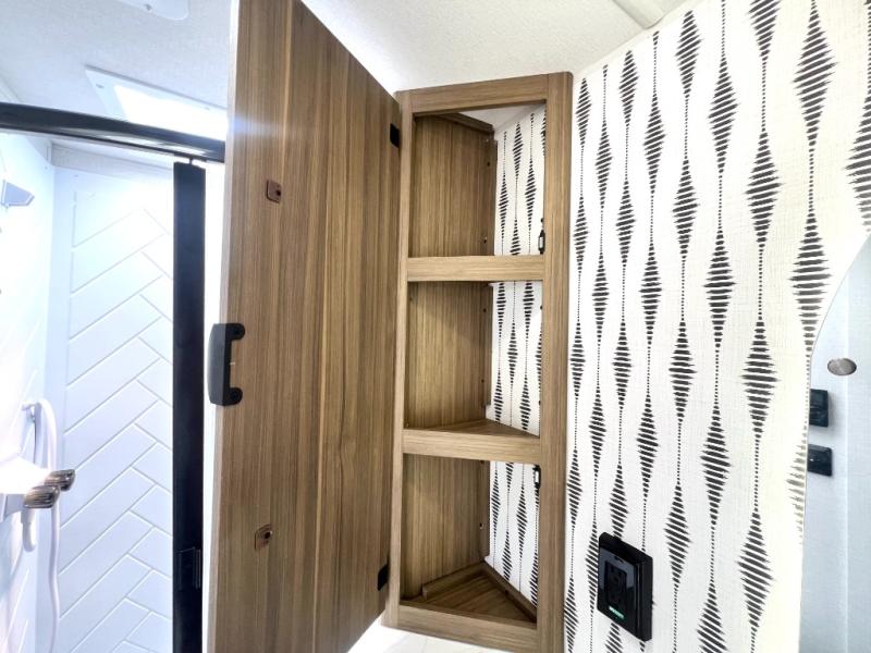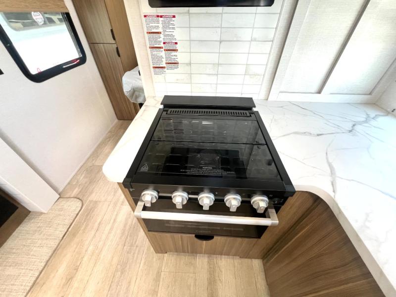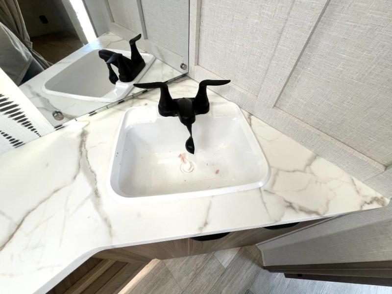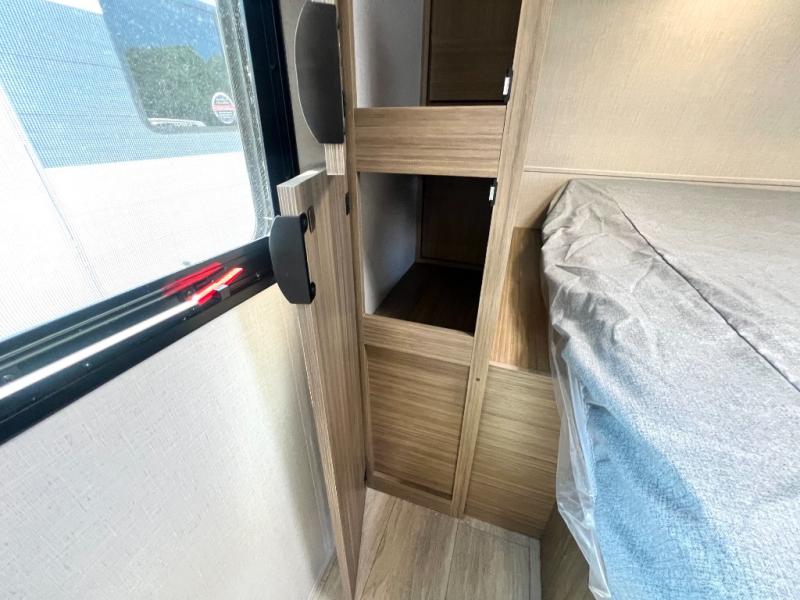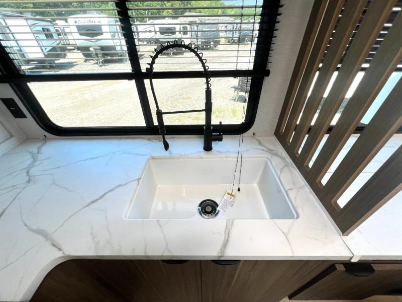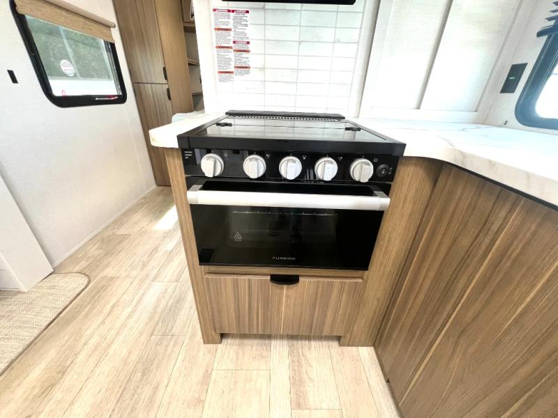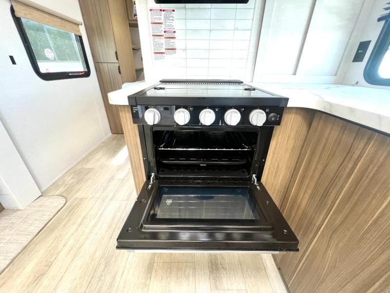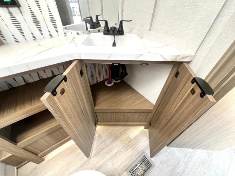 You can enjoy at-home comforts wherever you decide to camp in this travel trailer. The custom king bed with Versa Tilt includes dual shelves and a wardrobe so you can keep your space tidy. If you have a guest or two little ones, they can sleep on the jackknife sofa within the large slide out or on the double-size bunks right next to the full bath. Once you've made breakfast in the fully equipped kitchen, you can utilize the pull-out table to dine at. There is also a fireplace below the table, which will be perfect for cozy evenings indoors.