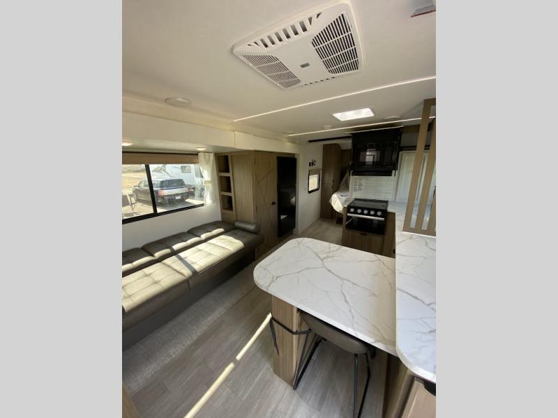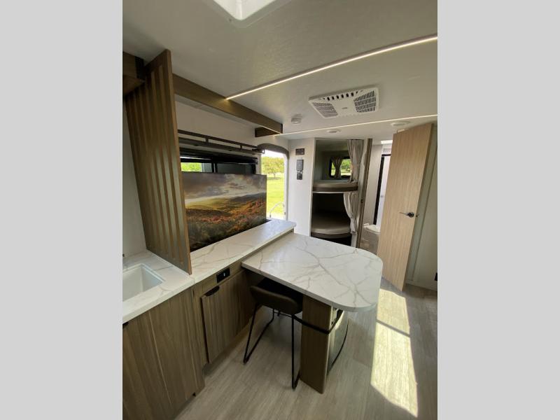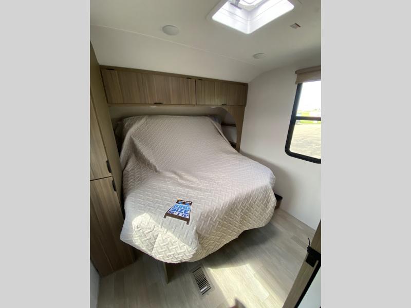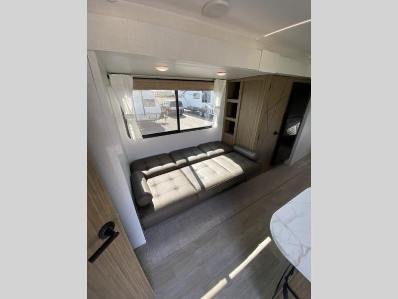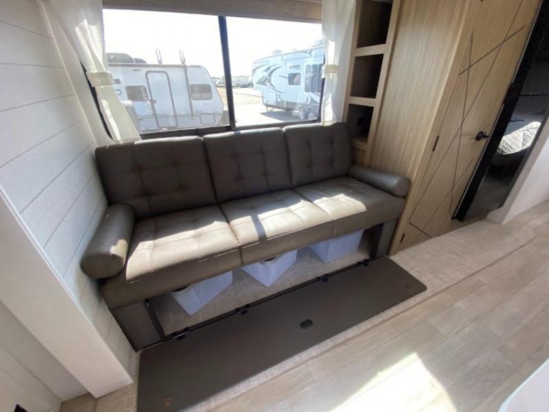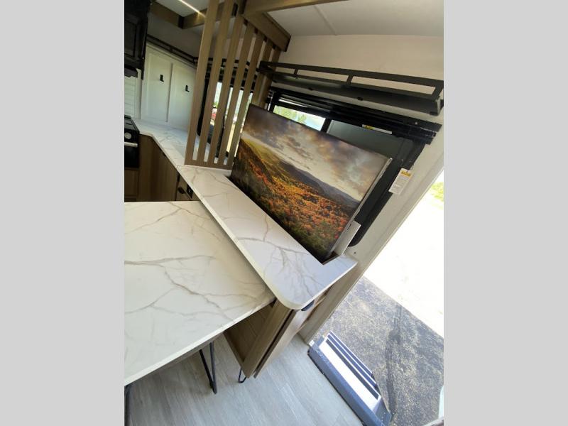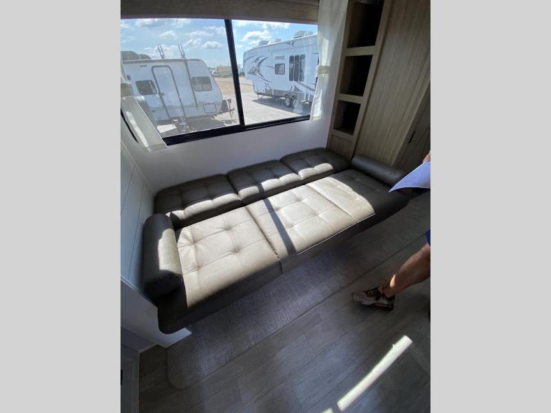 You can enjoy at-home comforts wherever you decide to camp in this travel trailer. The custom king bed with Versa Tilt includes dual shelves and a wardrobe so you can keep your space tidy. If you have a guest or two little ones, they can sleep on the jackknife sofa within the large slide out or on the double-size bunks right next to the full bath. Once you've made breakfast in the fully equipped kitchen, you can utilize the pull-out table to dine at. There is also a fireplace below the table, which will be perfect for cozy evenings indoors.