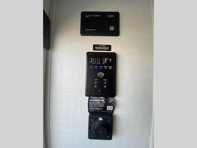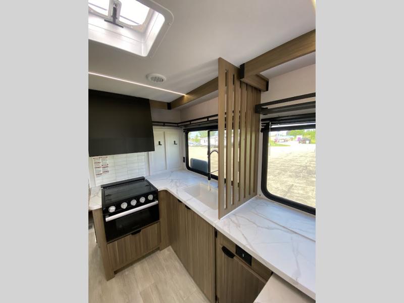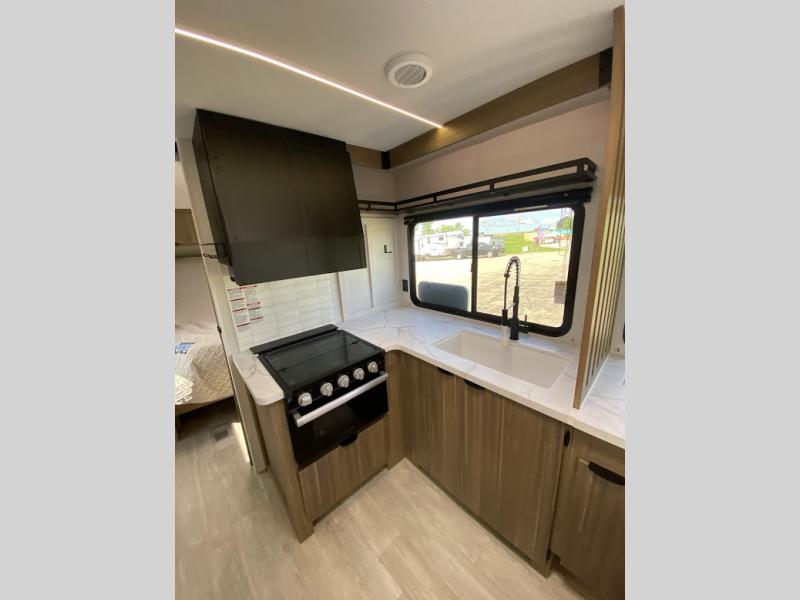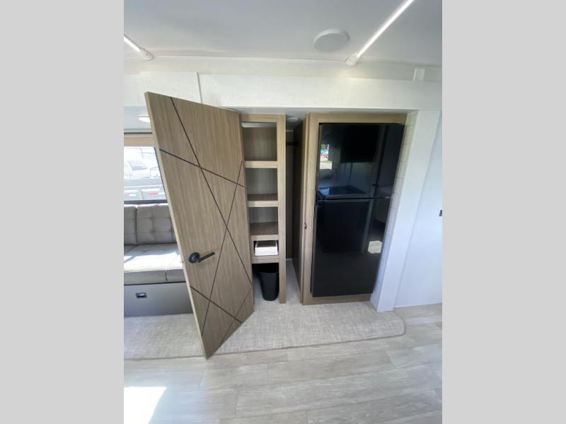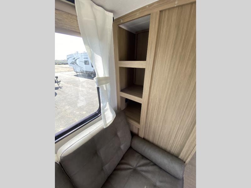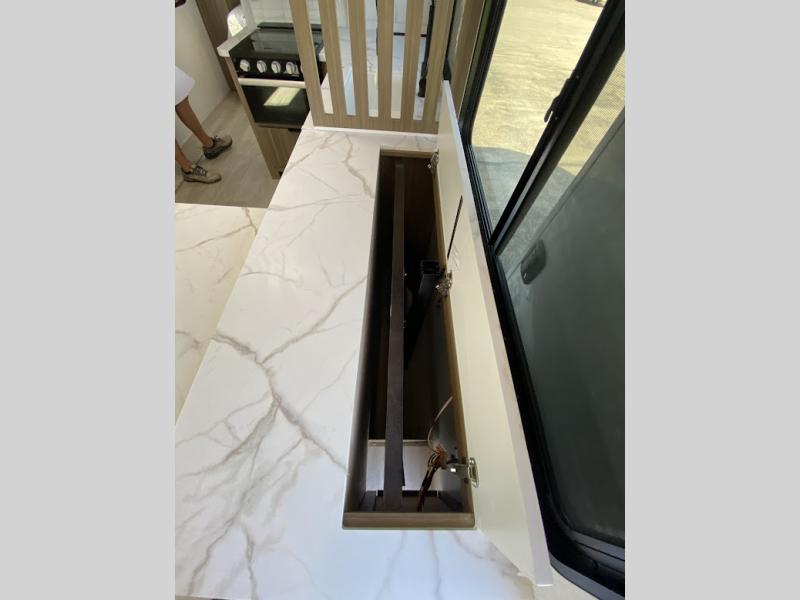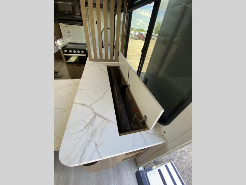 You can enjoy at-home comforts wherever you decide to camp in this travel trailer. The custom king bed with Versa Tilt includes dual shelves and a wardrobe so you can keep your space tidy. If you have a guest or two little ones, they can sleep on the jackknife sofa within the large slide out or on the double-size bunks right next to the full bath. Once you've made breakfast in the fully equipped kitchen, you can utilize the pull-out table to dine at. There is also a fireplace below the table, which will be perfect for cozy evenings indoors.