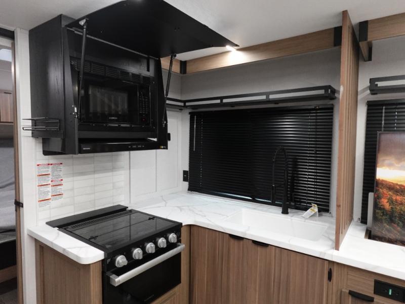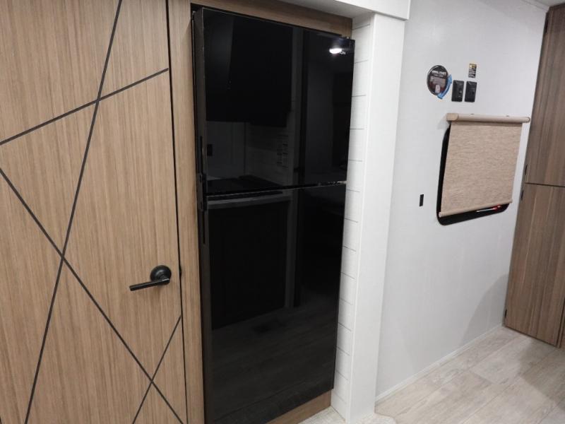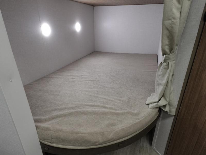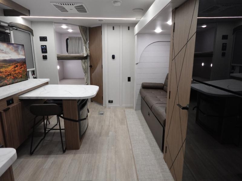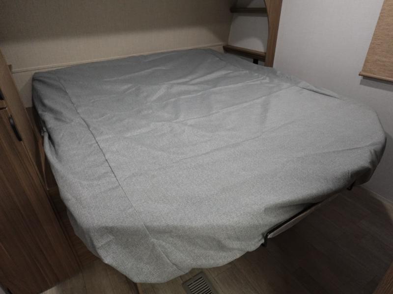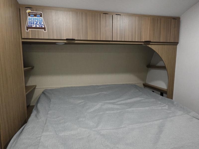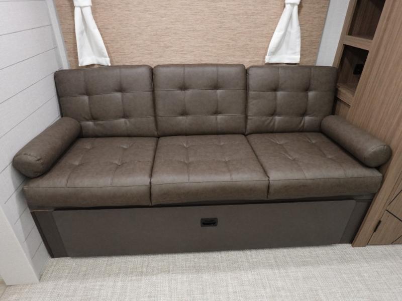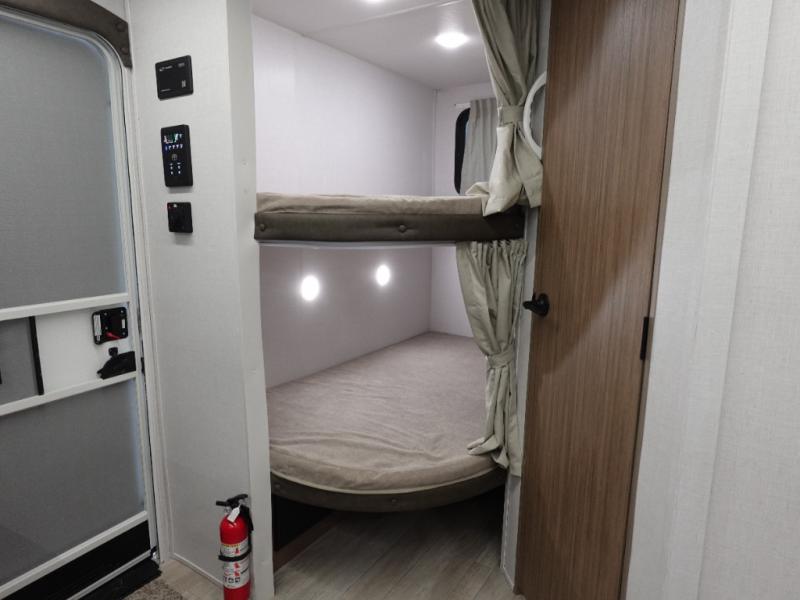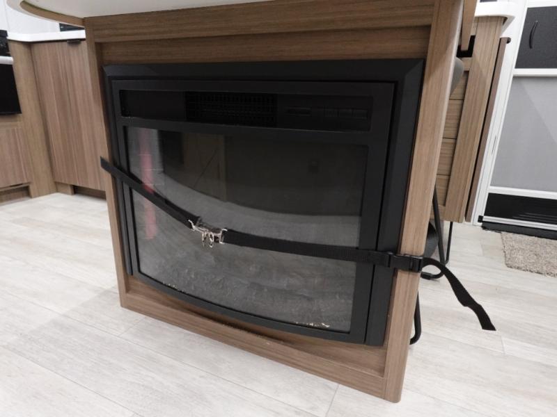 You can enjoy at-home comforts wherever you decide to camp in this travel trailer. The custom king bed with Versa Tilt includes dual shelves and a wardrobe so you can keep your space tidy. If you have a guest or two little ones, they can sleep on the jackknife sofa within the large slide out or on the double-size bunks right next to the full bath. Once you've made breakfast in the fully equipped kitchen, you can utilize the pull-out table to dine at. There is also a fireplace below the table, which will be perfect for cozy evenings indoors.