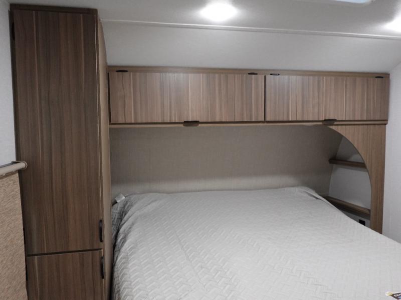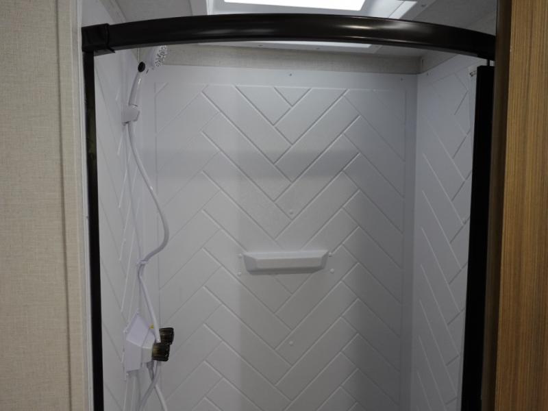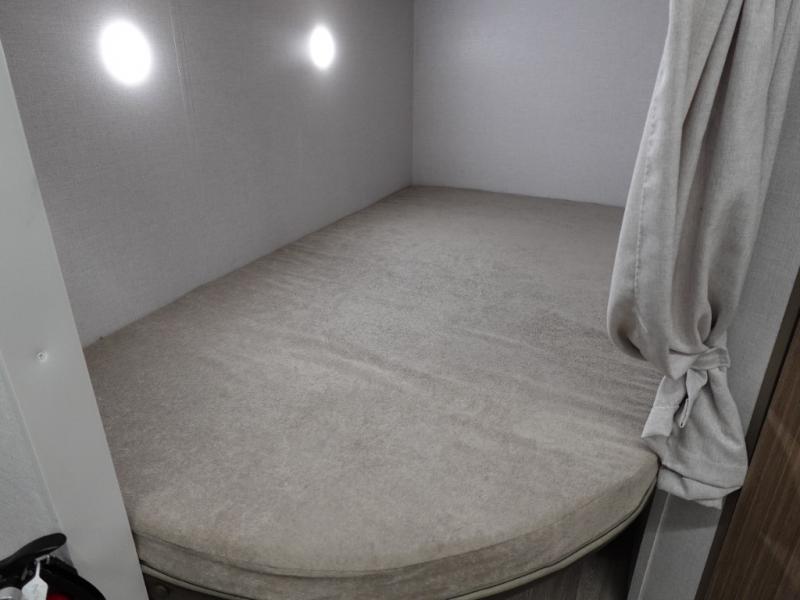 You can enjoy at-home comforts wherever you decide to camp in this travel trailer. The custom king bed with Versa Tilt includes dual shelves and a wardrobe so you can keep your space tidy. If you have a guest or two little ones, they can sleep on the jackknife sofa within the large slide out or on the double-size bunks right next to the full bath. Once you've made breakfast in the fully equipped kitchen, you can utilize the pull-out table to dine at. There is also a fireplace below the table, which will be perfect for cozy evenings indoors.
