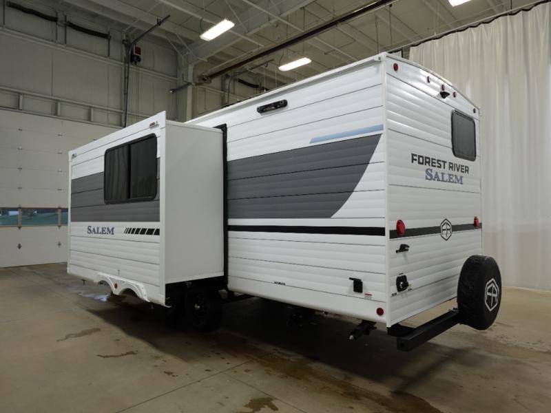 The Salem travel trailers are packed with hassle-free camping amenities and there are a variety of floorplans to choose from. The heated and enclosed Accessibelly will help protect against the elements and debris during transport, and the exterior retro/metal redesign is sure to be eye-catching! There are stylish roller shades inside, along with updated backsplash, elegant curtain rods and curtains, plus many more interior comforts! Choose a Salem travel trailer today for quality and value!