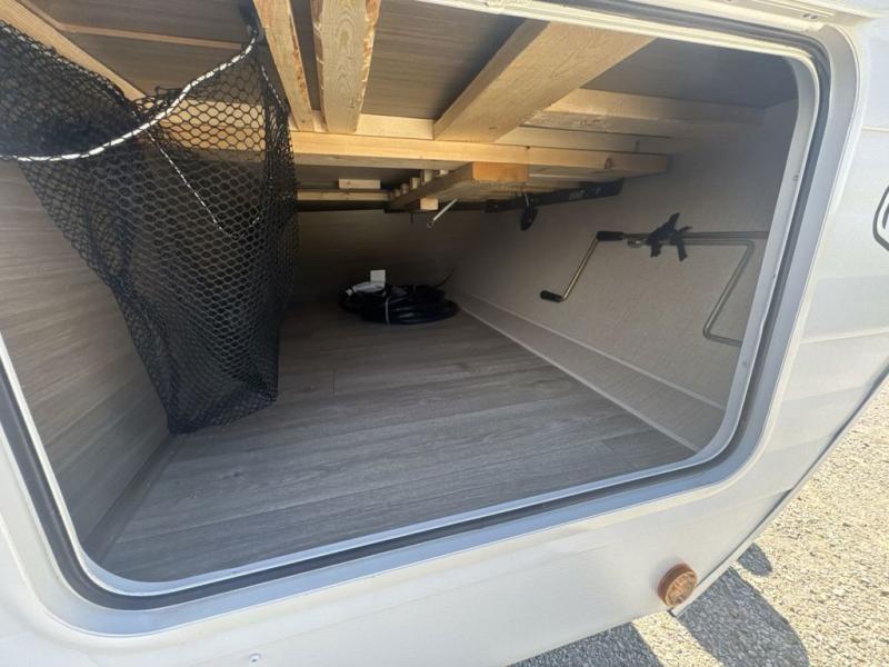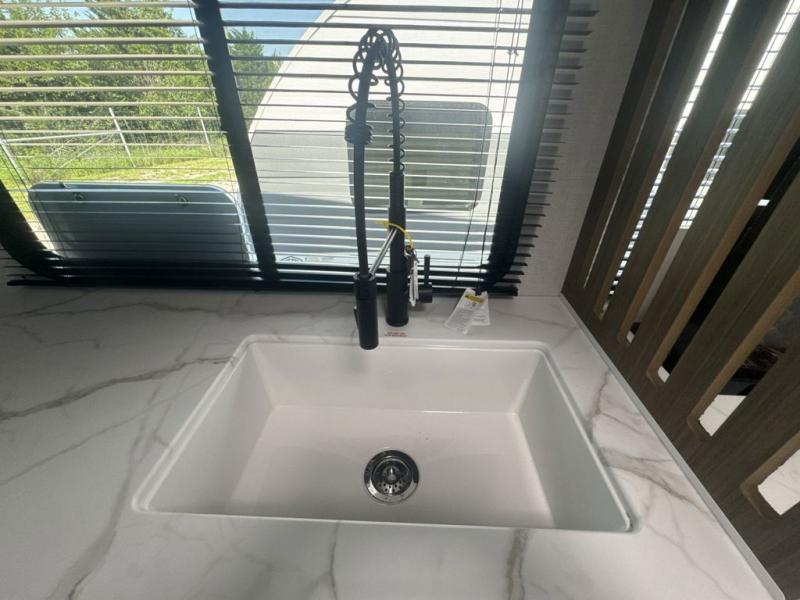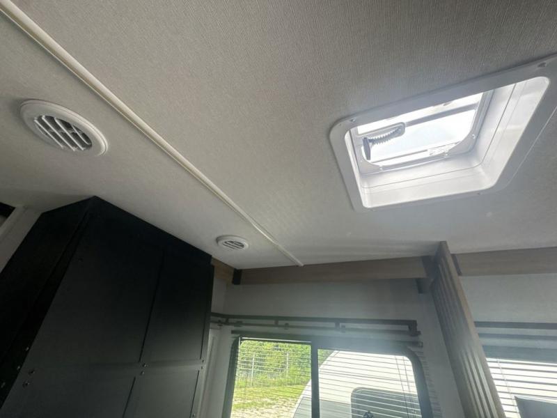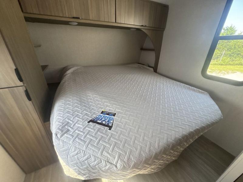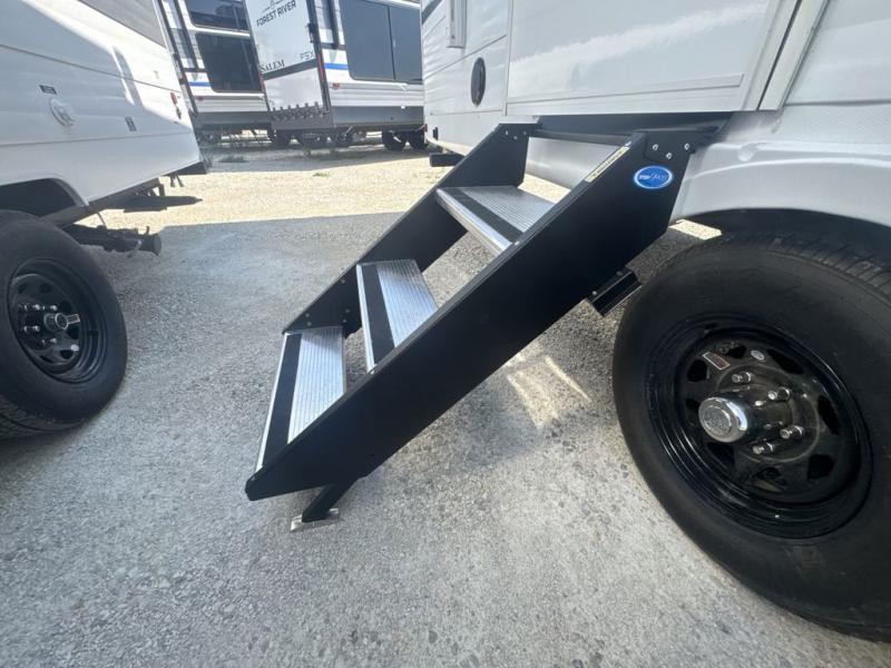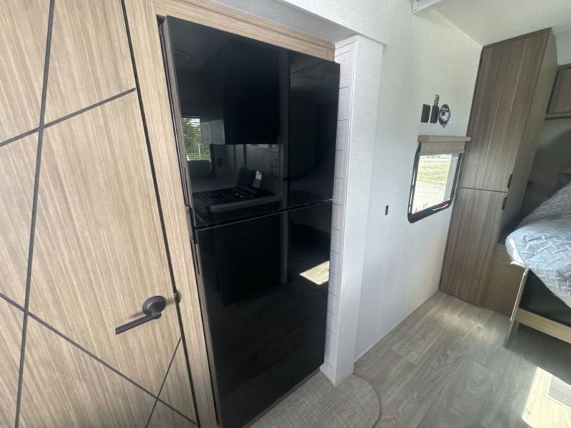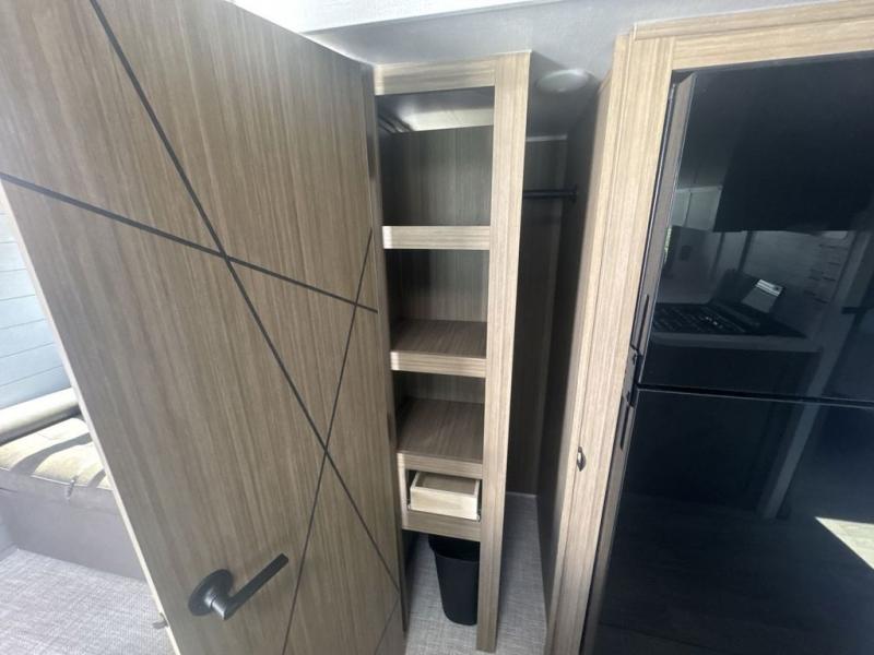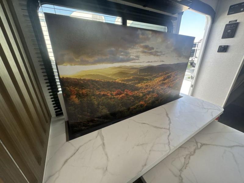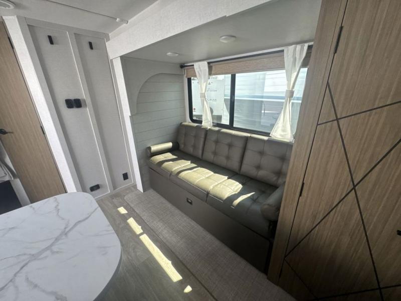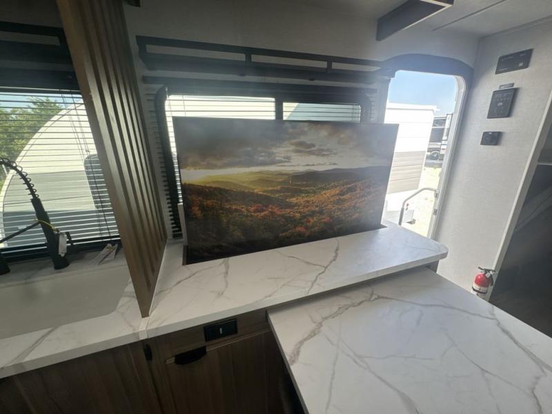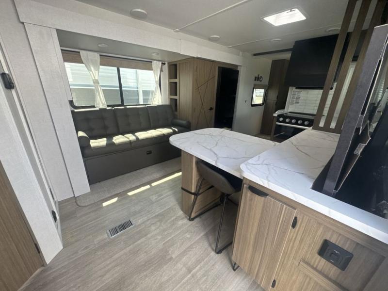 You can enjoy at-home comforts wherever you decide to camp in this travel trailer. The custom king bed with Versa Tilt includes dual shelves and a wardrobe so you can keep your space tidy. If you have a guest or two little ones, they can sleep on the jackknife sofa within the large slide out or on the double-size bunks right next to the full bath. Once you've made breakfast in the fully equipped kitchen, you can utilize the pull-out table to dine at. There is also a fireplace below the table, which will be perfect for cozy evenings indoors.