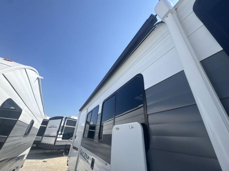 The Salem travel trailers are packed with hassle-free camping amenities and there are a variety of floorplans to choose from. The heated and enclosed Accessibelly will help protect against the elements and debris during transport, and the exterior retro/metal redesign is sure to be eye-catching! There are stylish roller shades inside, along with updated backsplash, elegant curtain rods and curtains, plus many more interior comforts! Choose a Salem travel trailer today for quality and value!