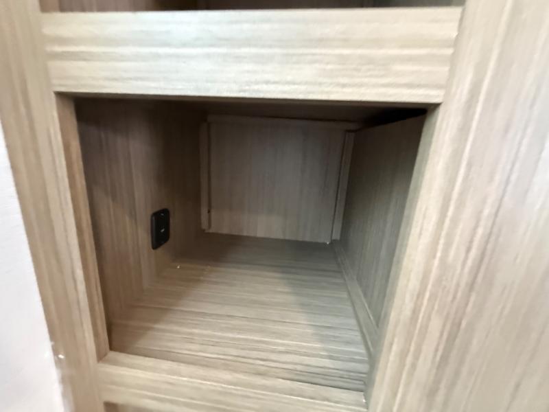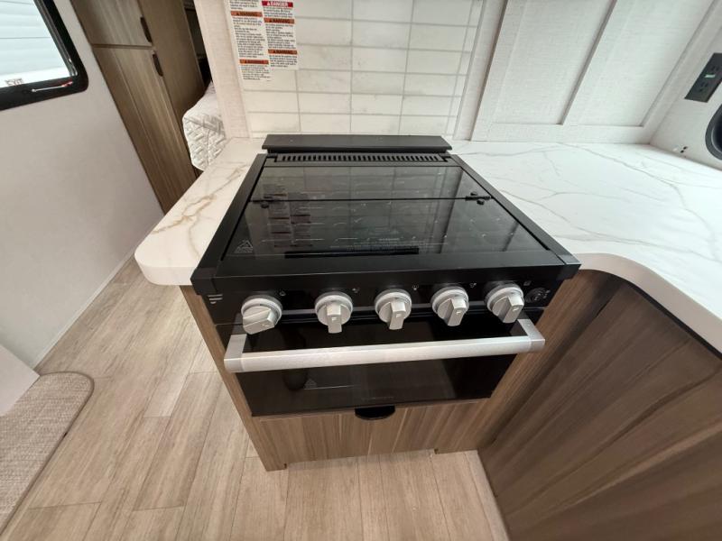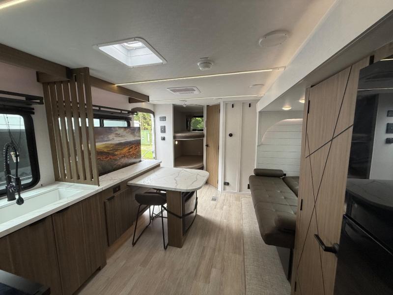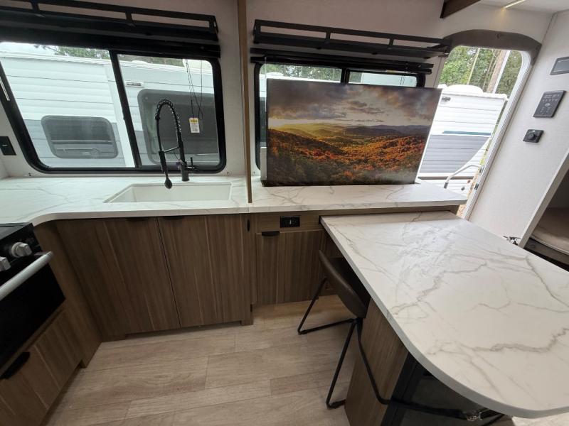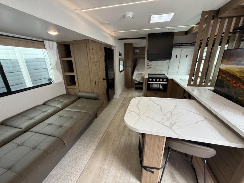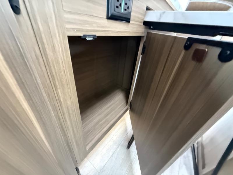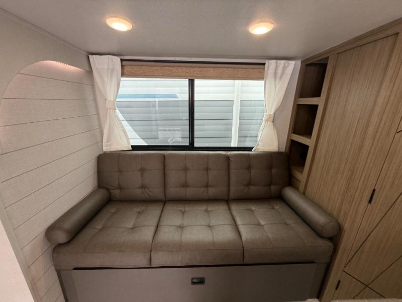 You can enjoy at-home comforts wherever you decide to camp in this travel trailer. The custom king bed with Versa Tilt includes dual shelves and a wardrobe so you can keep your space tidy. If you have a guest or two little ones, they can sleep on the jackknife sofa within the large slide out or on the double-size bunks right next to the full bath. Once you've made breakfast in the fully equipped kitchen, you can utilize the pull-out table to dine at. There is also a fireplace below the table, which will be perfect for cozy evenings indoors.