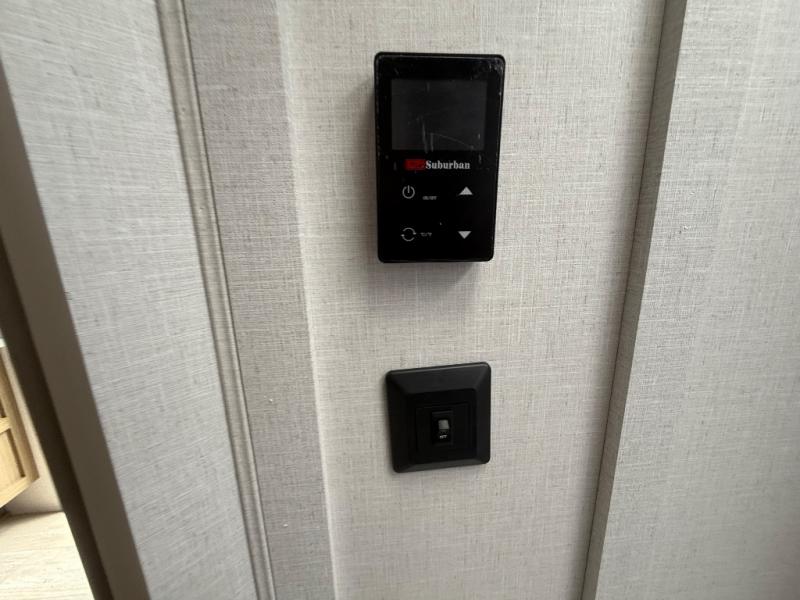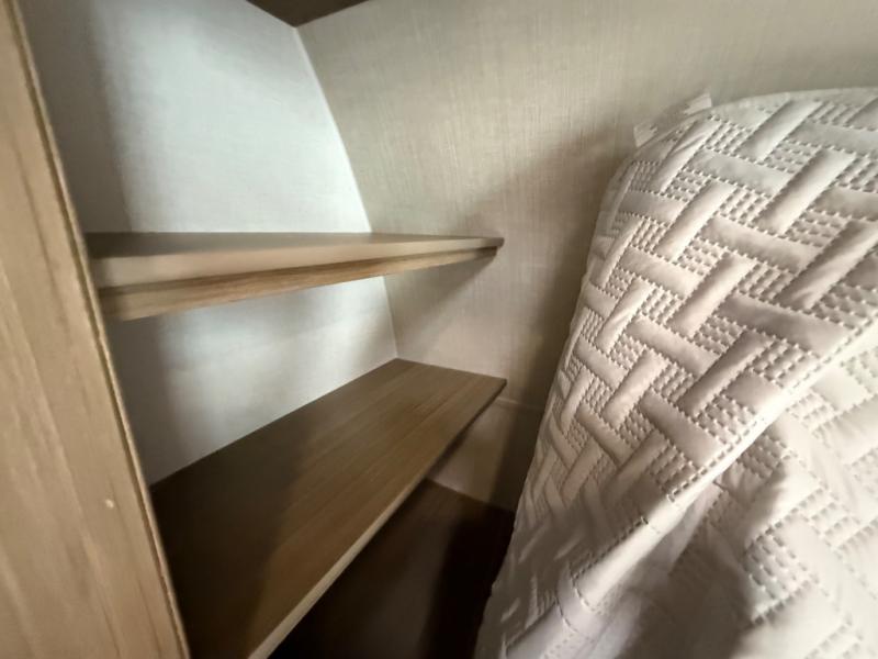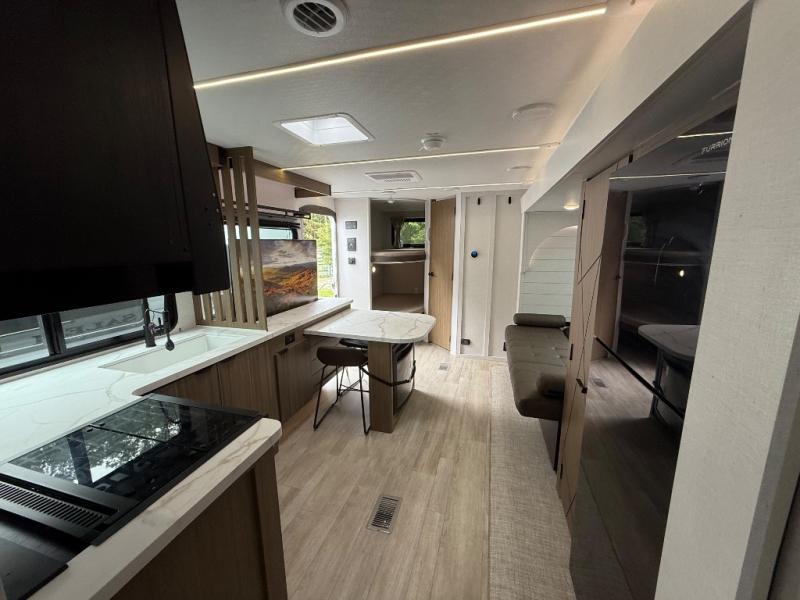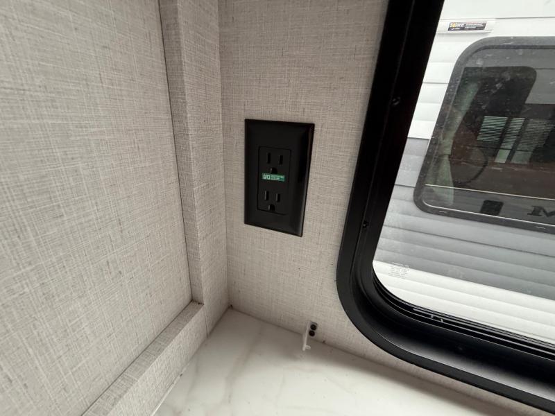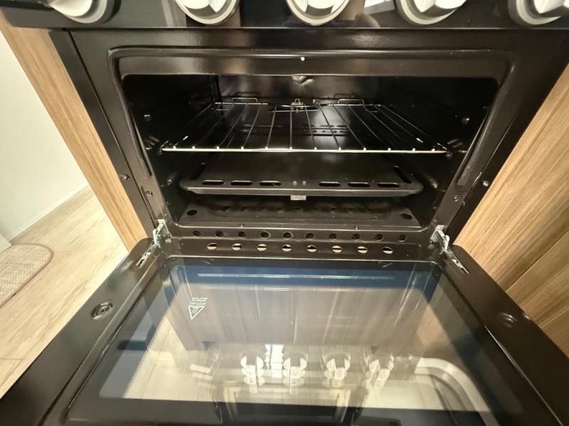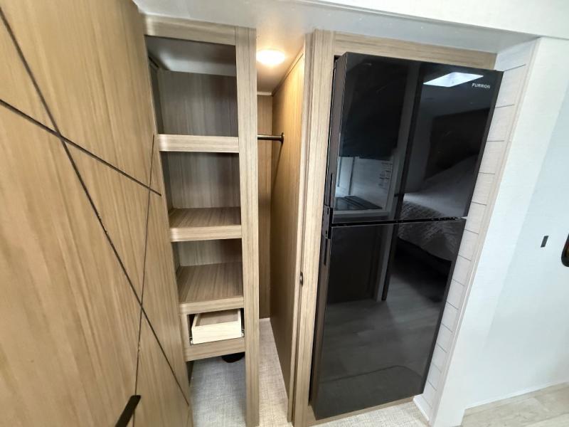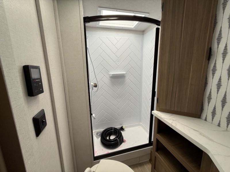 You can enjoy at-home comforts wherever you decide to camp in this travel trailer. The custom king bed with Versa Tilt includes dual shelves and a wardrobe so you can keep your space tidy. If you have a guest or two little ones, they can sleep on the jackknife sofa within the large slide out or on the double-size bunks right next to the full bath. Once you've made breakfast in the fully equipped kitchen, you can utilize the pull-out table to dine at. There is also a fireplace below the table, which will be perfect for cozy evenings indoors.