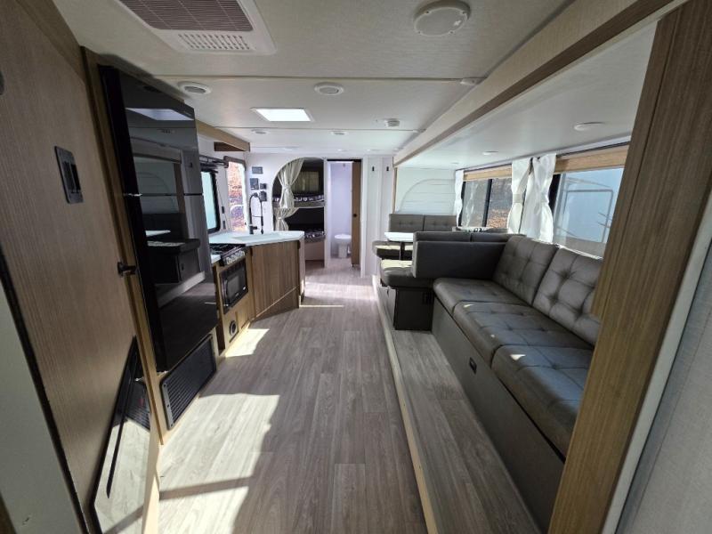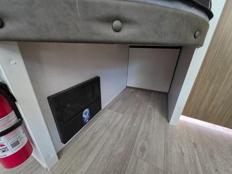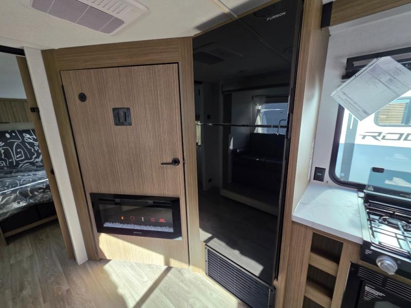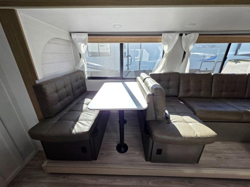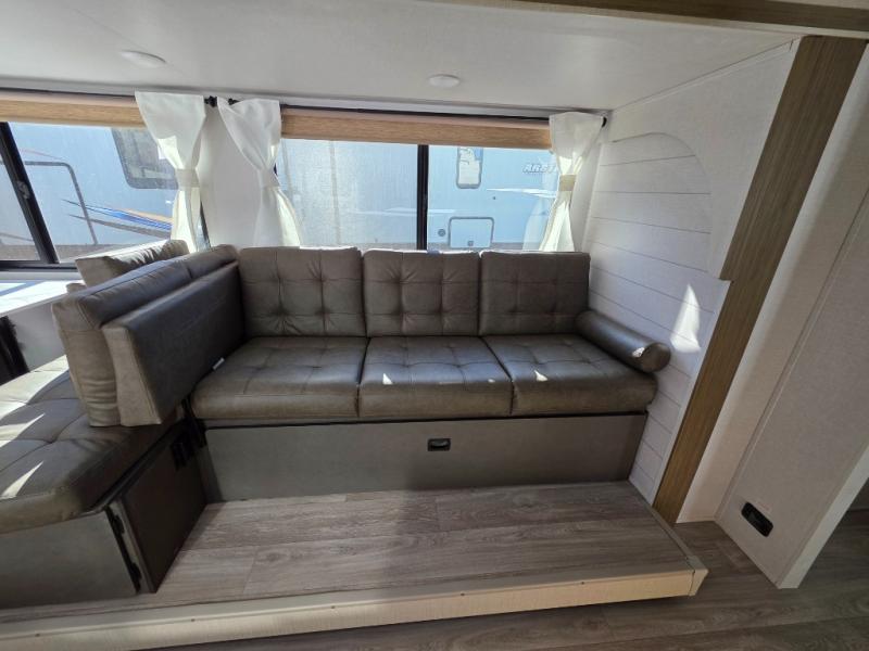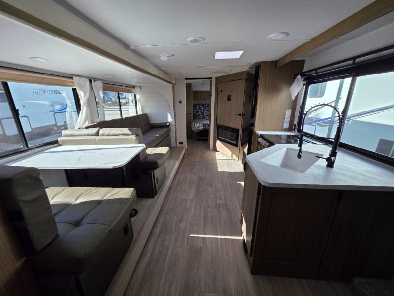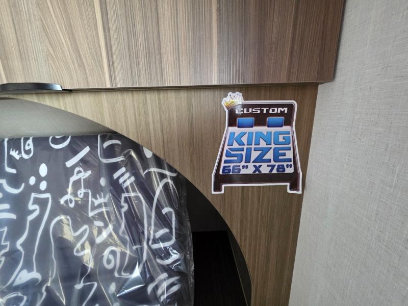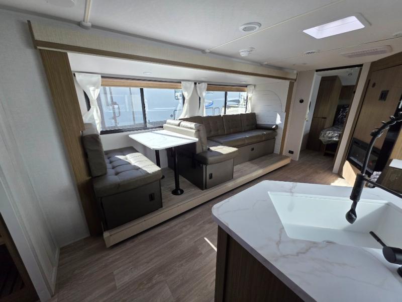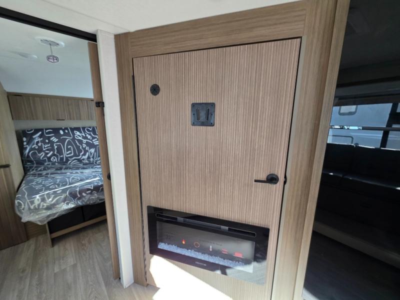 You can enjoy at-home comforts wherever you decide to camp in this travel trailer. The custom king bed with Versa Tilt includes dual shelves and a wardrobe so you can keep your space tidy. If you have a guest or two little ones, they can sleep on the jackknife sofa within the large slide out or on the double-size bunks right next to the full bath. Once you've made breakfast in the fully equipped kitchen, you can utilize the pull-out table to dine at. There is also a fireplace below the table, which will be perfect for cozy evenings indoors.