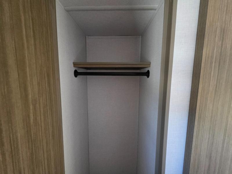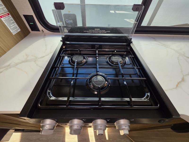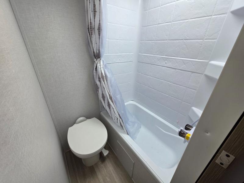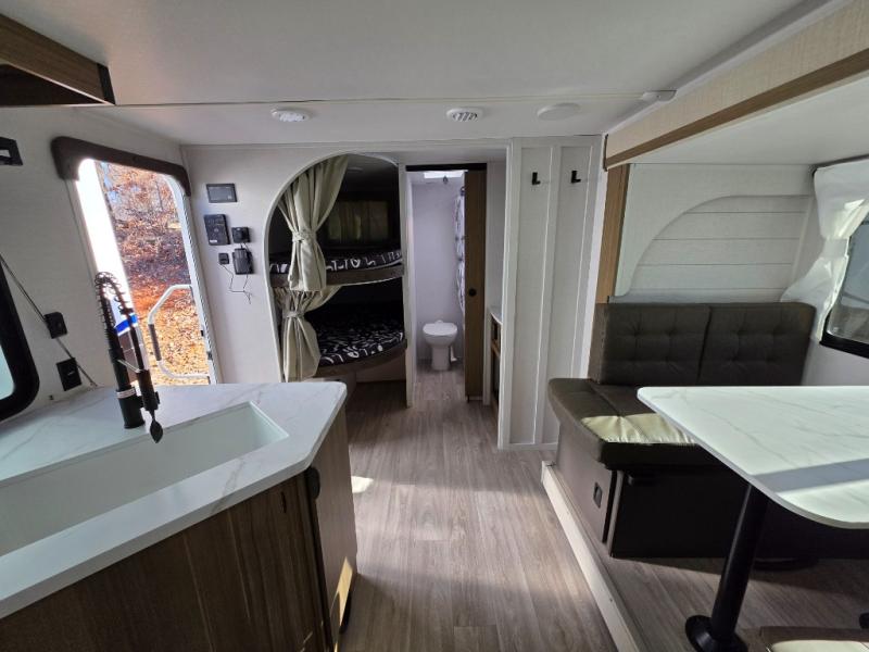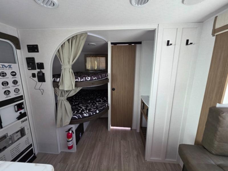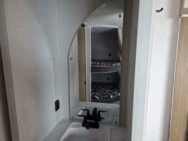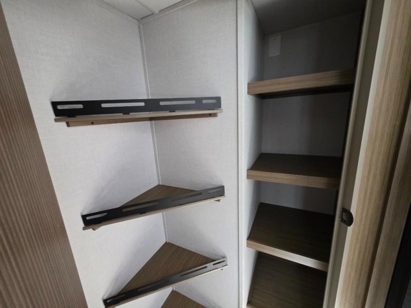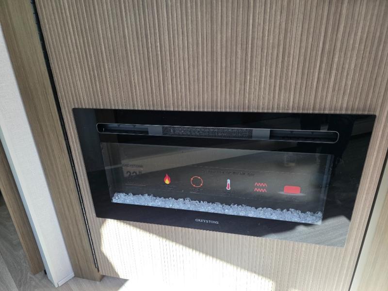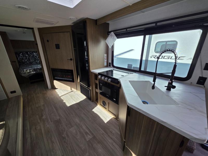 You can enjoy at-home comforts wherever you decide to camp in this travel trailer. The custom king bed with Versa Tilt includes dual shelves and a wardrobe so you can keep your space tidy. If you have a guest or two little ones, they can sleep on the jackknife sofa within the large slide out or on the double-size bunks right next to the full bath. Once you've made breakfast in the fully equipped kitchen, you can utilize the pull-out table to dine at. There is also a fireplace below the table, which will be perfect for cozy evenings indoors.