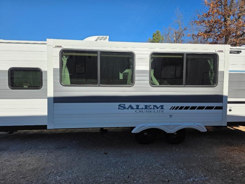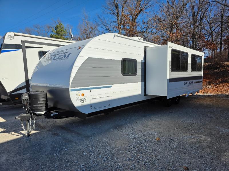 The Salem travel trailers are packed with hassle-free camping amenities and there are a variety of floorplans to choose from. The heated and enclosed Accessibelly will help protect against the elements and debris during transport, and the exterior retro/metal redesign is sure to be eye-catching! There are stylish roller shades inside, along with updated backsplash, elegant curtain rods and curtains, plus many more interior comforts! Choose a Salem travel trailer today for quality and value!