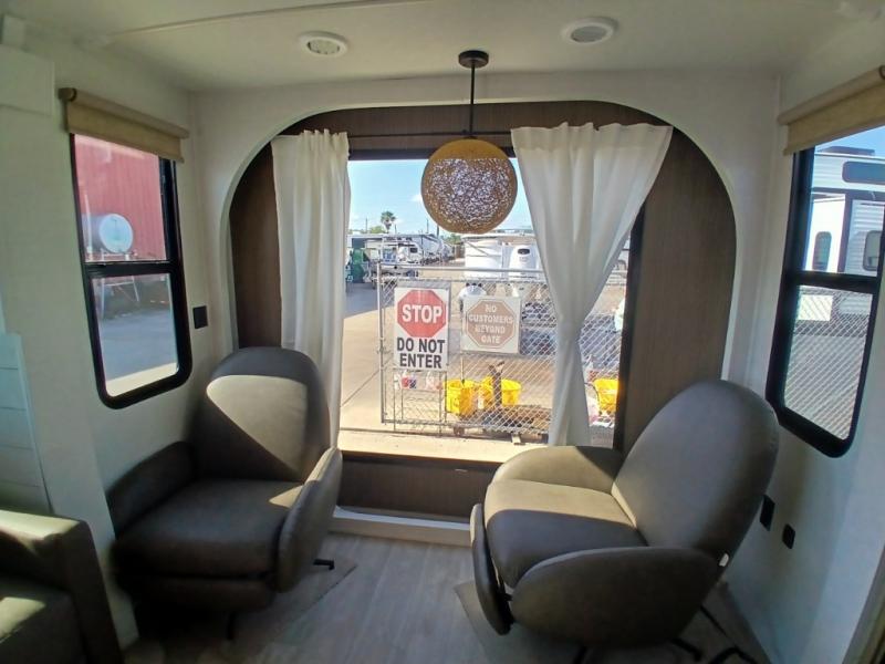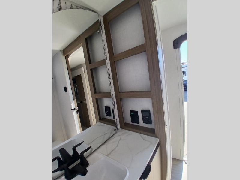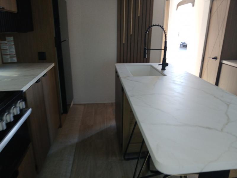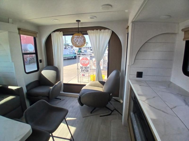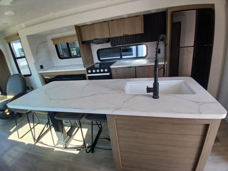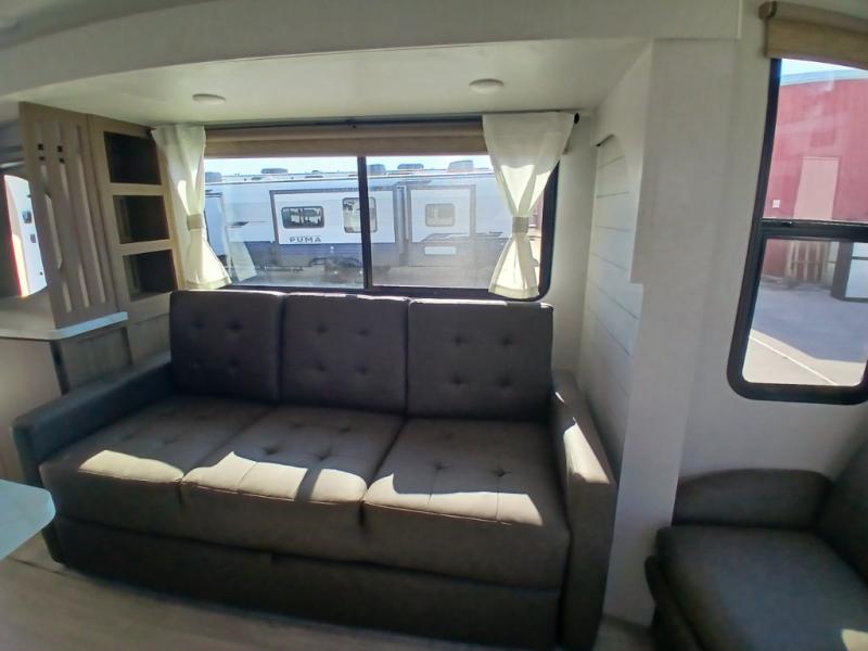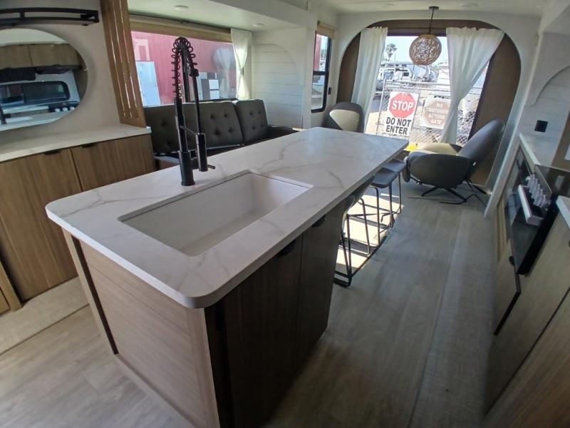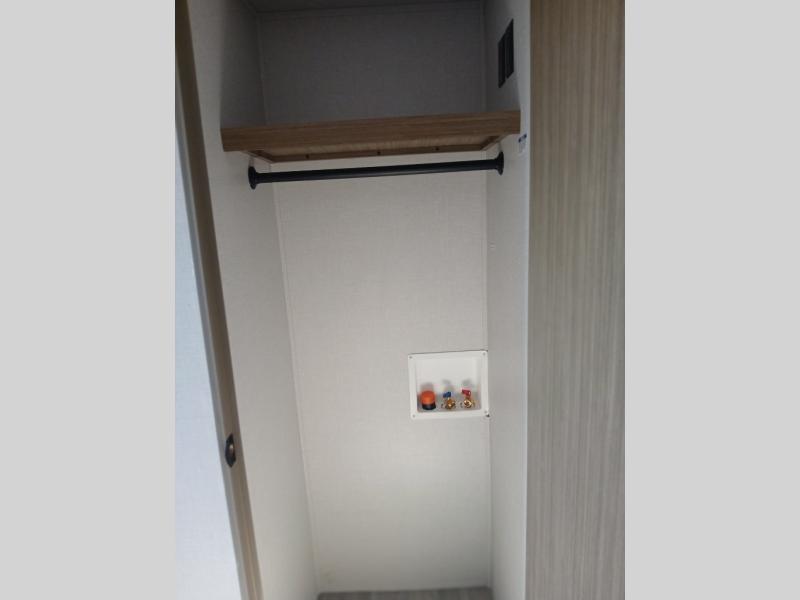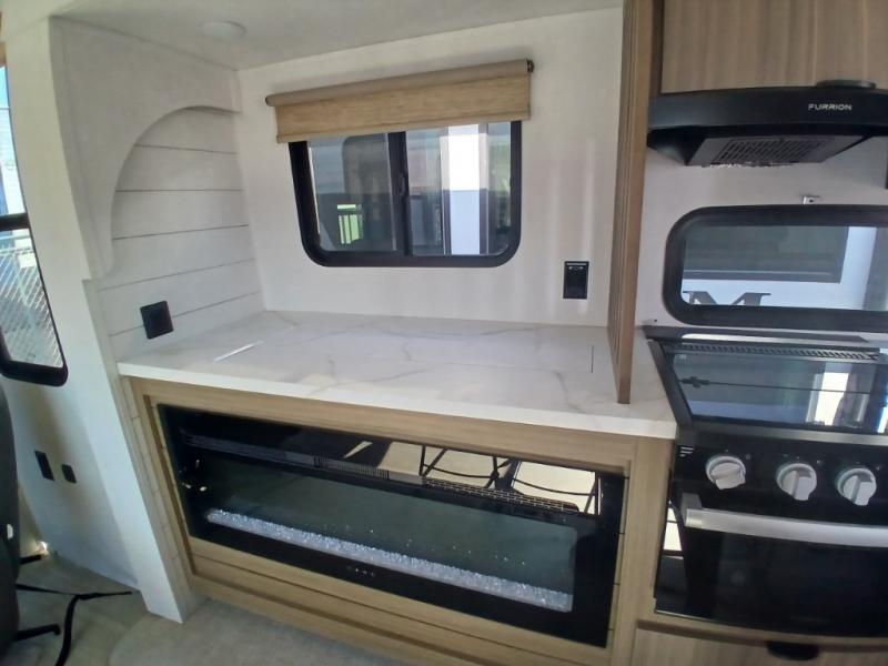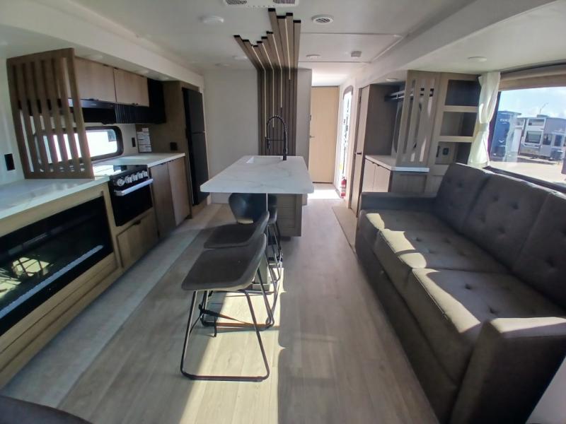 Find your zen int this spacious travel trailer for four! Once you've unloaded your gear, you can head inside to make lunch at the kitchen island with four chairs. An 80" trundle sofa provides additional seating space plus sleeping space for guests. You will love the rear custom recliners that are conveniently located next to the fireplace. The full bath is located towards the front next to the private bedroom so you can easily use the restroom at night, and you're sure to get a great night's rest on the custom king bed with Versa Tilt. This unit also includes washer and dryer prep, giving you the option to add these appliances.