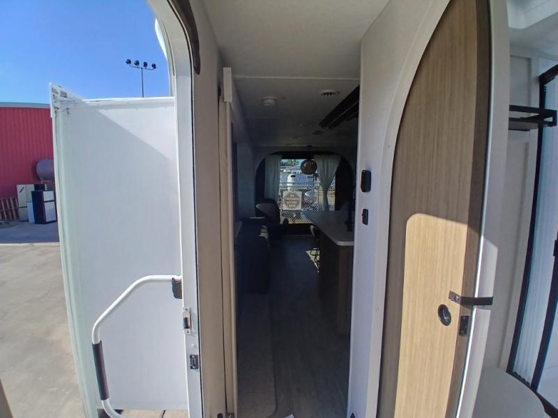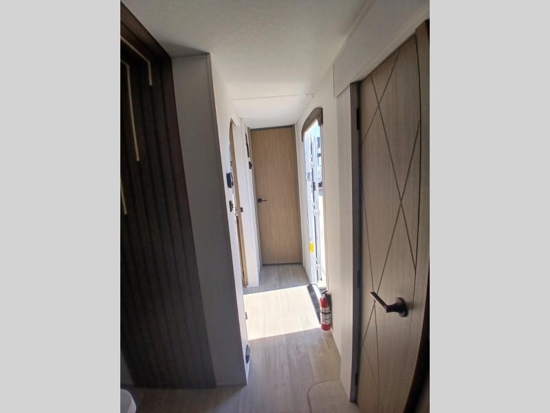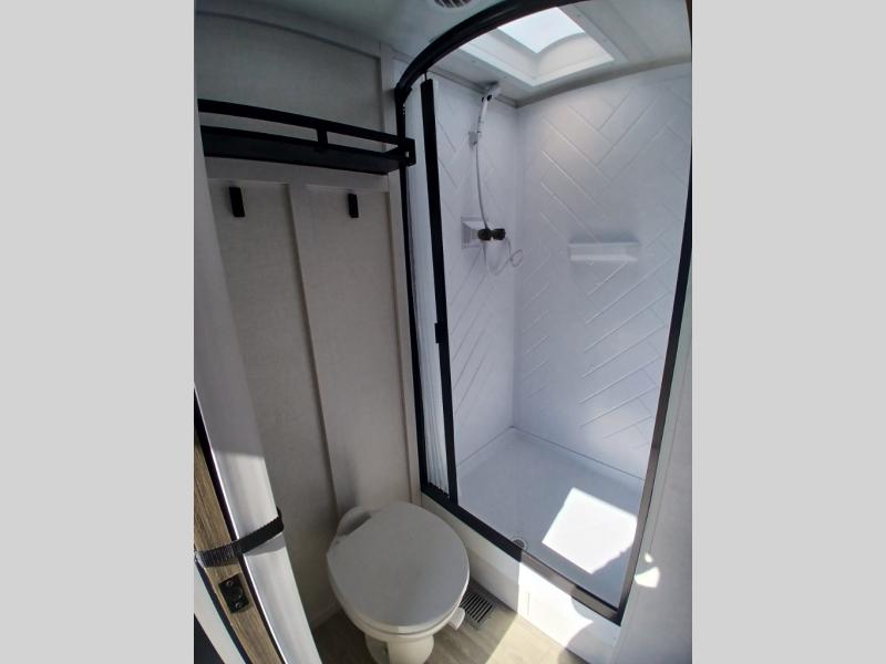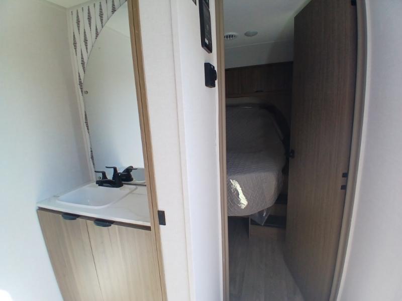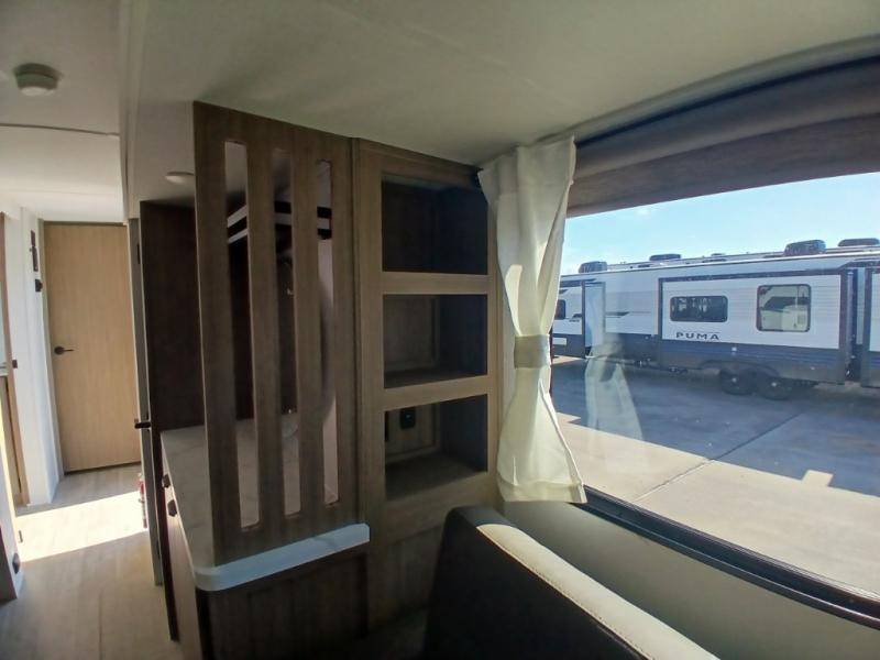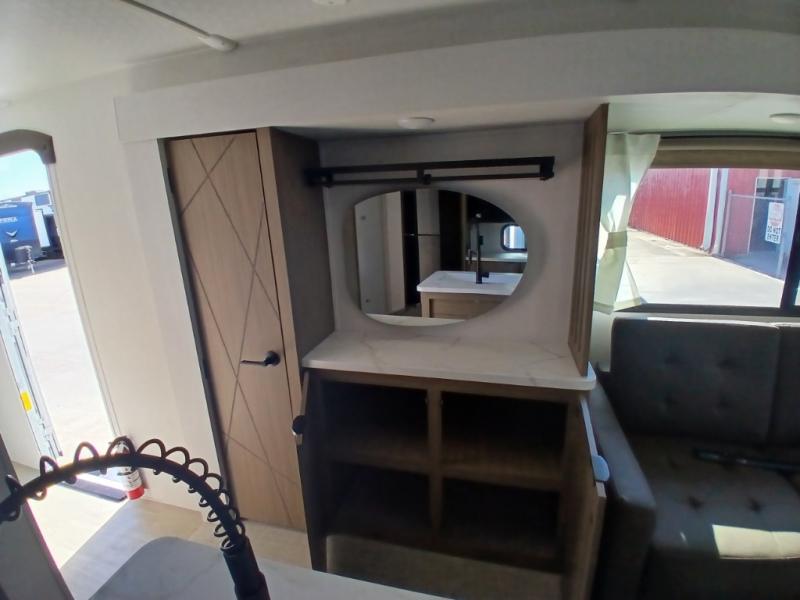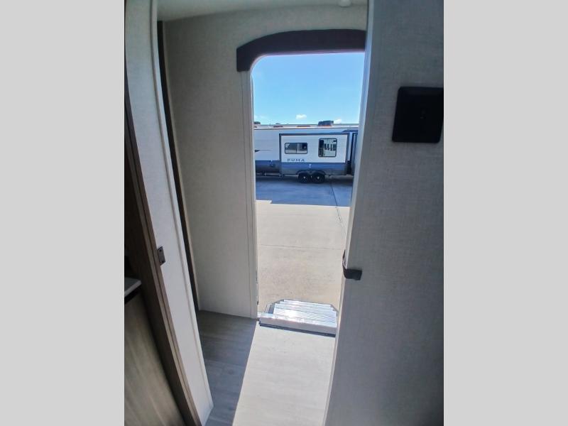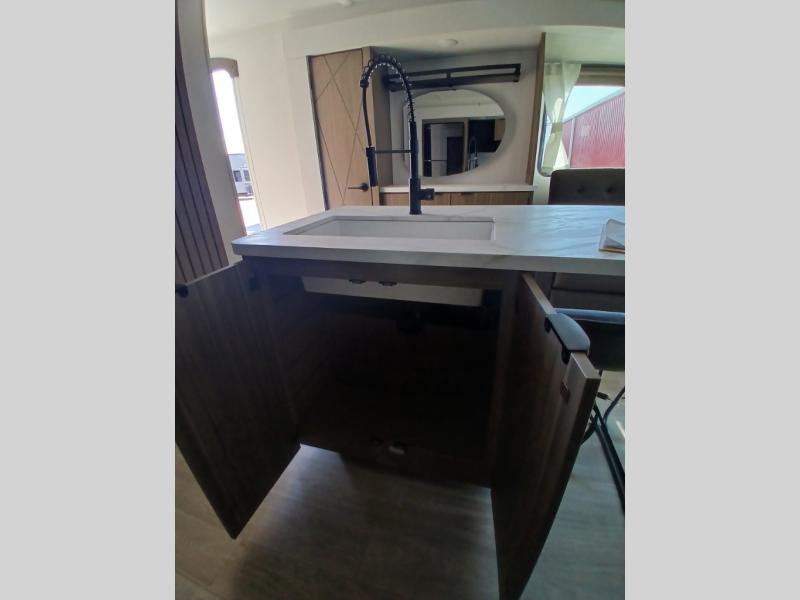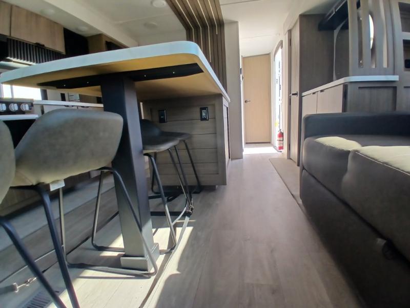Find your zen int this spacious travel trailer for four! Once you've unloaded your gear, you can head inside to make lunch at the kitchen island with four chairs. An 80" trundle sofa provides additional seating space plus sleeping space for guests. You will love the rear custom recliners that are conveniently located next to the fireplace. The full bath is located towards the front next to the private bedroom so you can easily use the restroom at night, and you're sure to get a great night's rest on the custom king bed with Versa Tilt. This unit also includes washer and dryer prep, giving you the option to add these appliances.