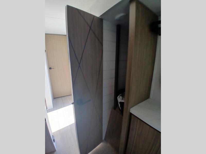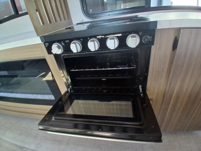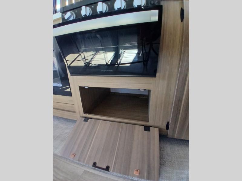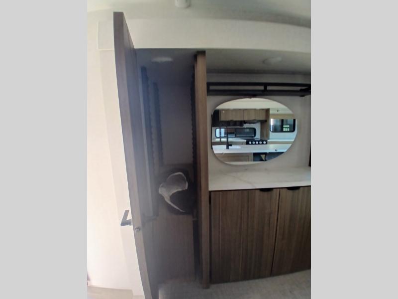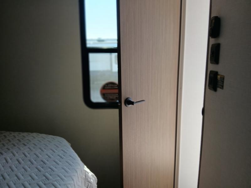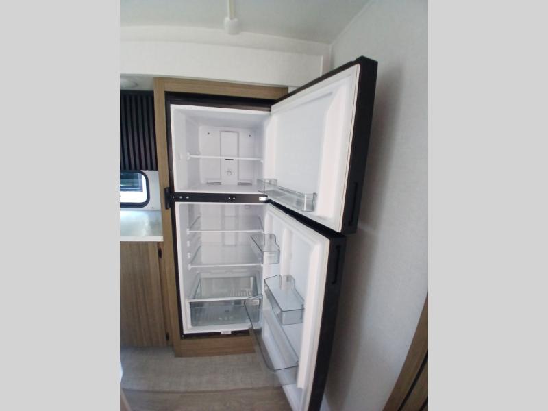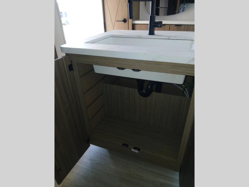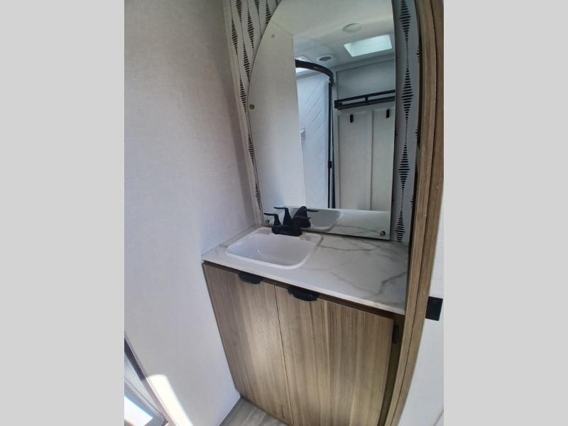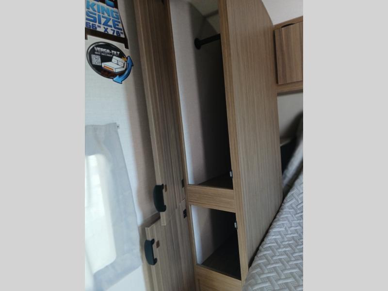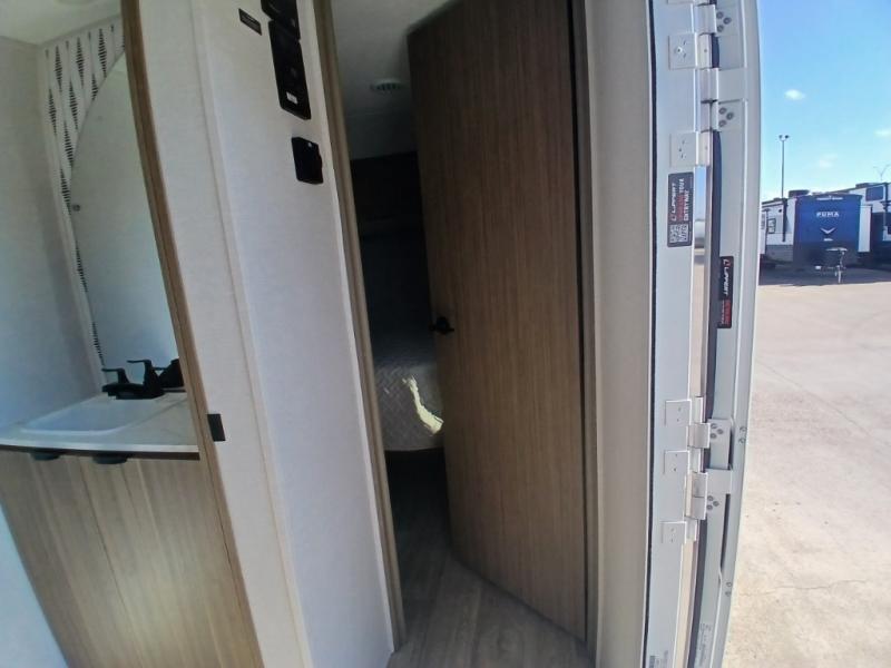 Find your zen int this spacious travel trailer for four! Once you've unloaded your gear, you can head inside to make lunch at the kitchen island with four chairs. An 80" trundle sofa provides additional seating space plus sleeping space for guests. You will love the rear custom recliners that are conveniently located next to the fireplace. The full bath is located towards the front next to the private bedroom so you can easily use the restroom at night, and you're sure to get a great night's rest on the custom king bed with Versa Tilt. This unit also includes washer and dryer prep, giving you the option to add these appliances.