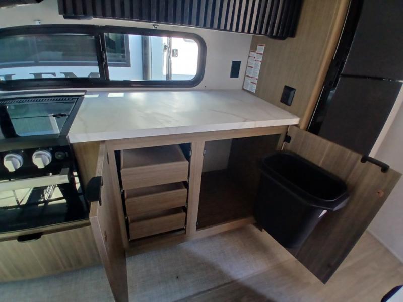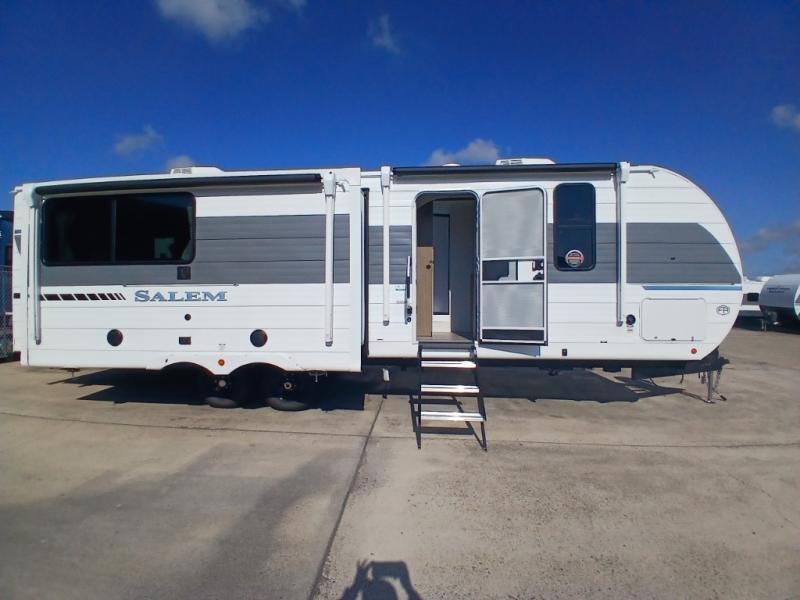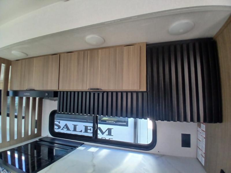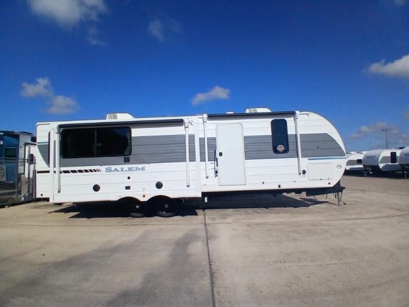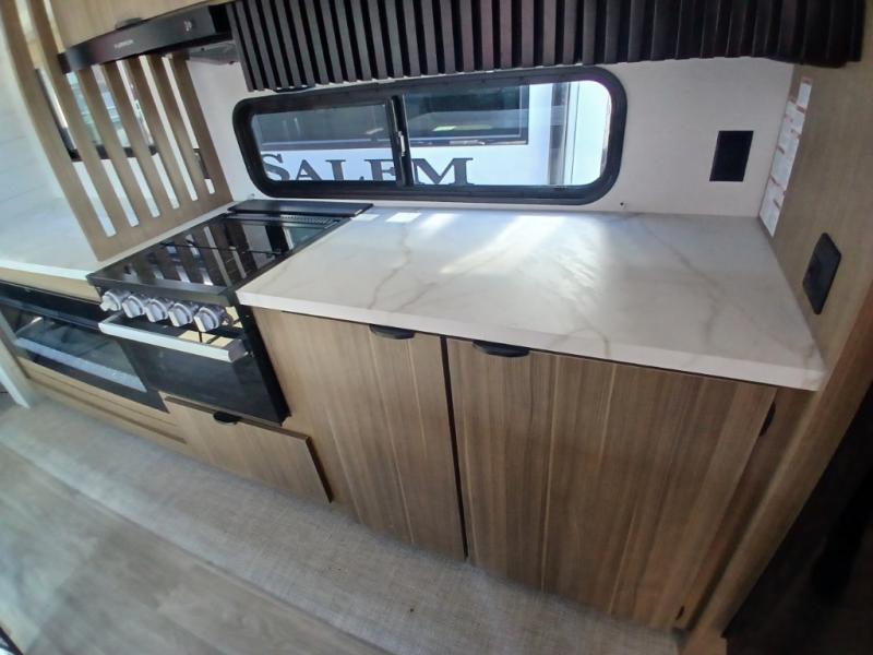 The Salem travel trailers are packed with hassle-free camping amenities and there are a variety of floorplans to choose from. The heated and enclosed Accessibelly will help protect against the elements and debris during transport, and the exterior retro/metal redesign is sure to be eye-catching! There are stylish roller shades inside, along with updated backsplash, elegant curtain rods and curtains, plus many more interior comforts! Choose a Salem travel trailer today for quality and value!