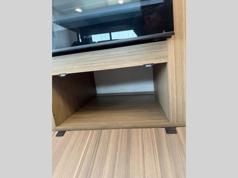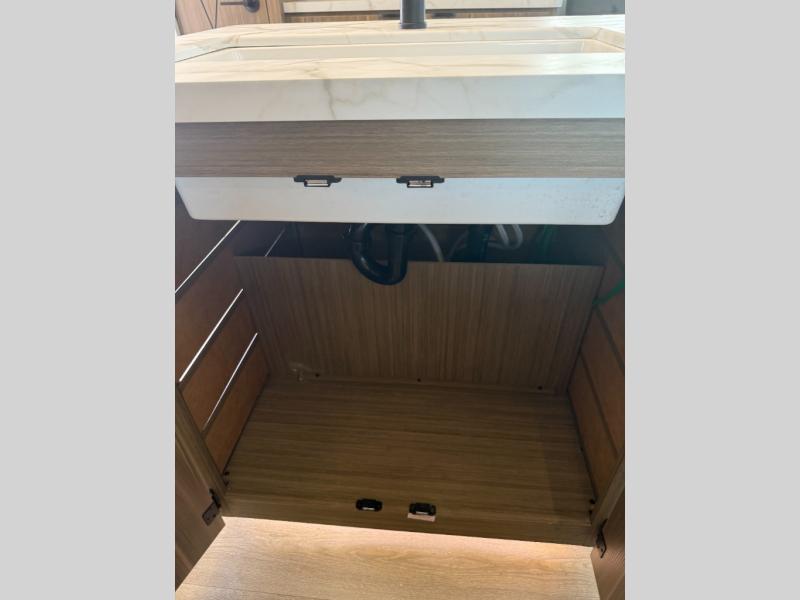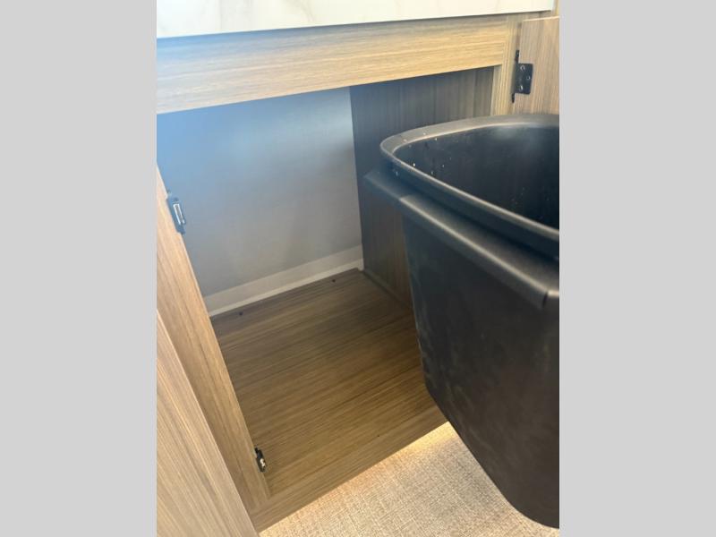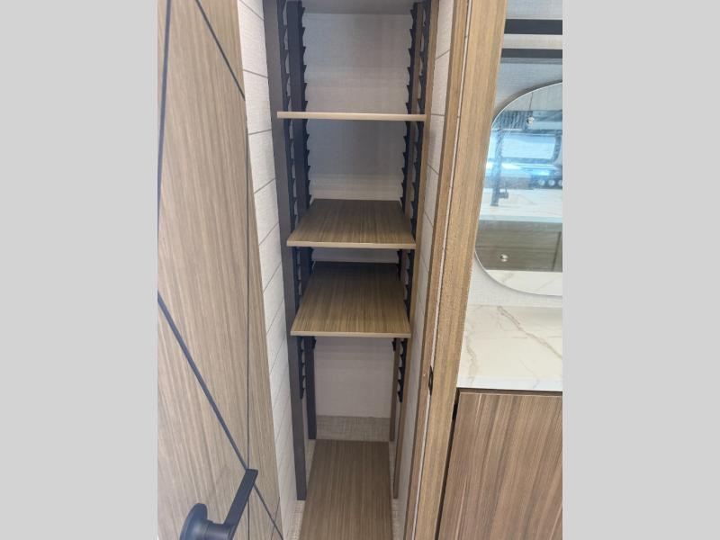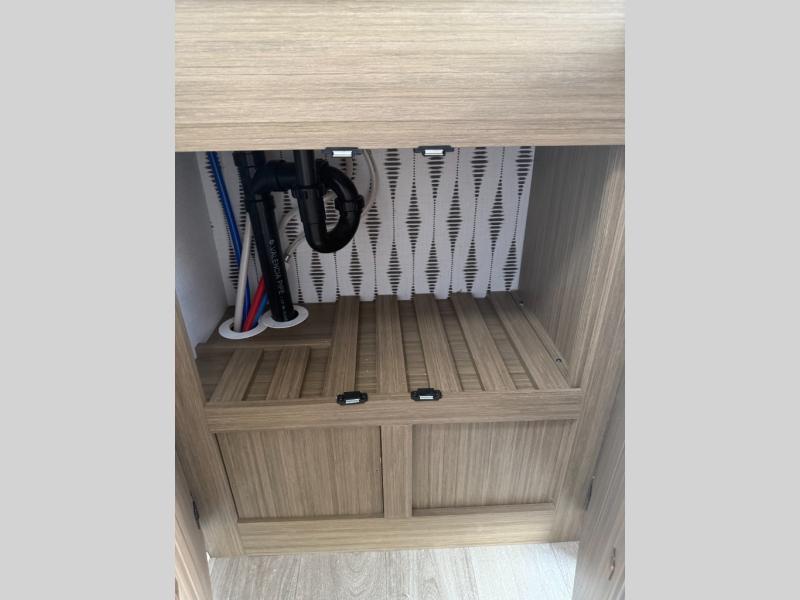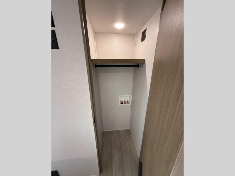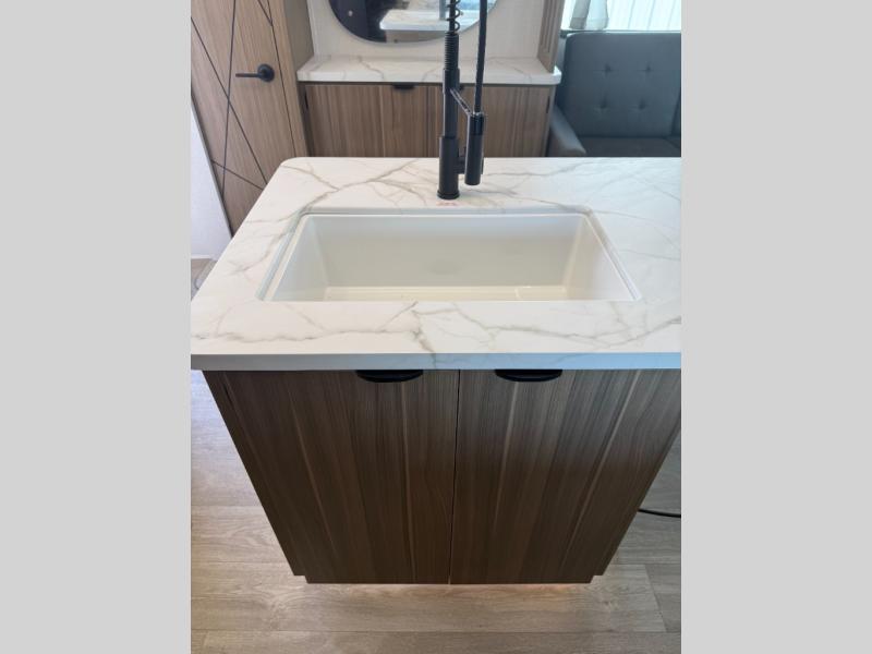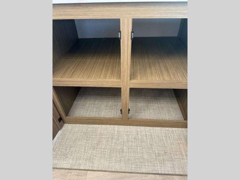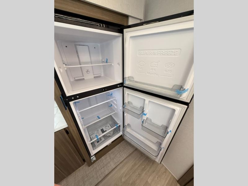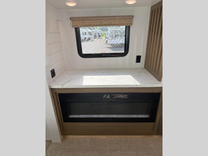 Find your zen int this spacious travel trailer for four! Once you've unloaded your gear, you can head inside to make lunch at the kitchen island with four chairs. An 80" trundle sofa provides additional seating space plus sleeping space for guests. You will love the rear custom recliners that are conveniently located next to the fireplace. The full bath is located towards the front next to the private bedroom so you can easily use the restroom at night, and you're sure to get a great night's rest on the custom king bed with Versa Tilt. This unit also includes washer and dryer prep, giving you the option to add these appliances.