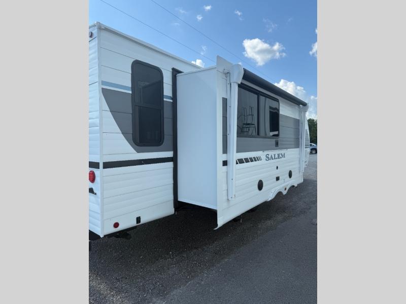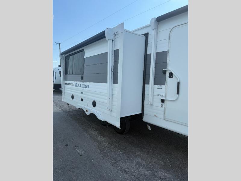 The Salem travel trailers are packed with hassle-free camping amenities and there are a variety of floorplans to choose from. The heated and enclosed Accessibelly will help protect against the elements and debris during transport, and the exterior retro/metal redesign is sure to be eye-catching! There are stylish roller shades inside, along with updated backsplash, elegant curtain rods and curtains, plus many more interior comforts! Choose a Salem travel trailer today for quality and value!