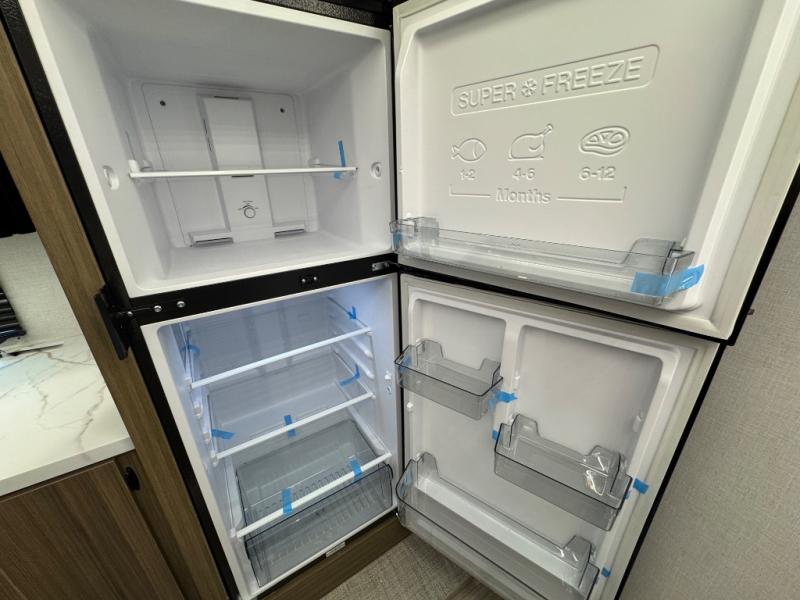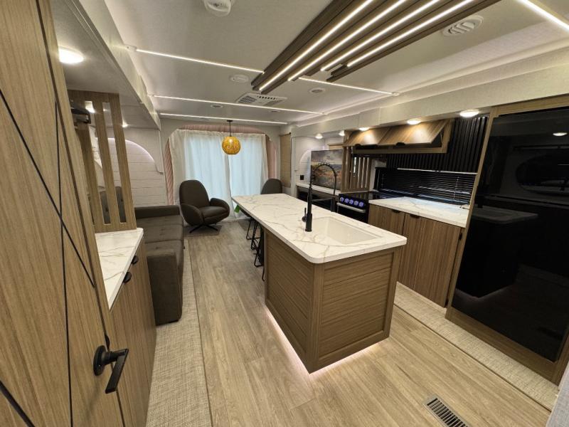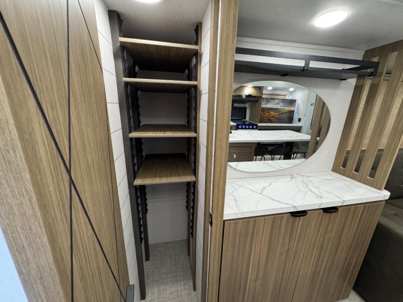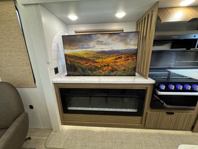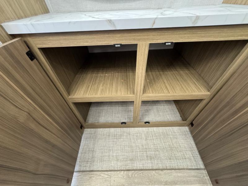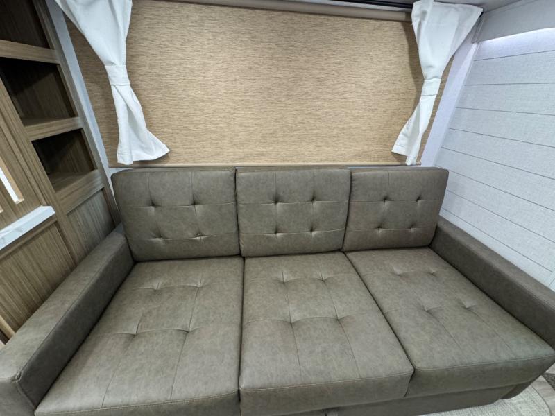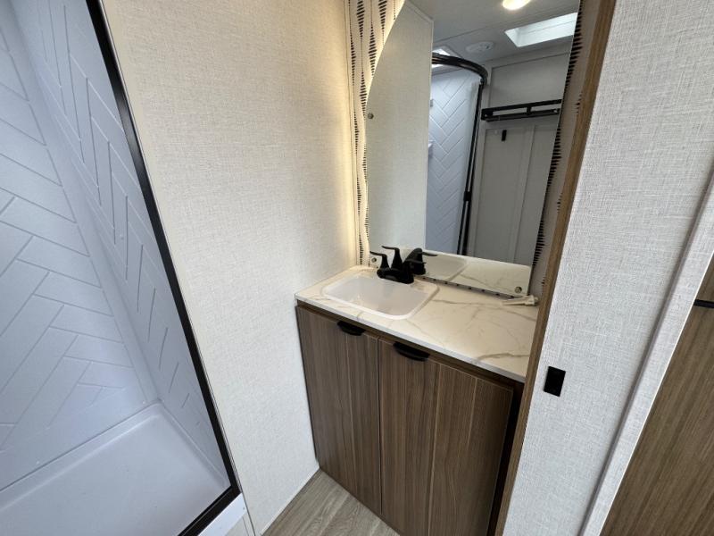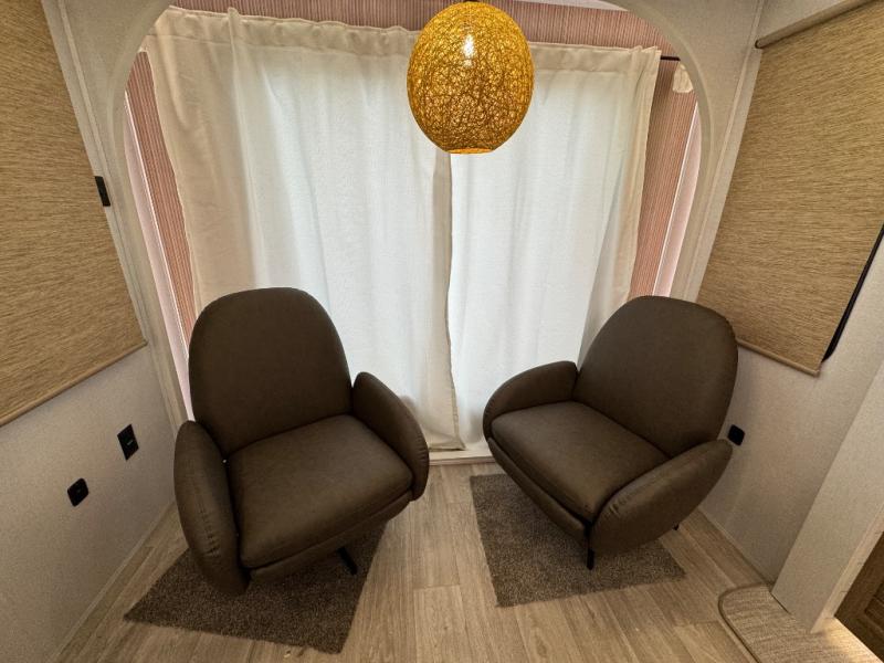 Find your zen int this spacious travel trailer for four! Once you've unloaded your gear, you can head inside to make lunch at the kitchen island with four chairs. An 80" trundle sofa provides additional seating space plus sleeping space for guests. You will love the rear custom recliners that are conveniently located next to the fireplace. The full bath is located towards the front next to the private bedroom so you can easily use the restroom at night, and you're sure to get a great night's rest on the custom king bed with Versa Tilt. This unit also includes washer and dryer prep, giving you the option to add these appliances.
