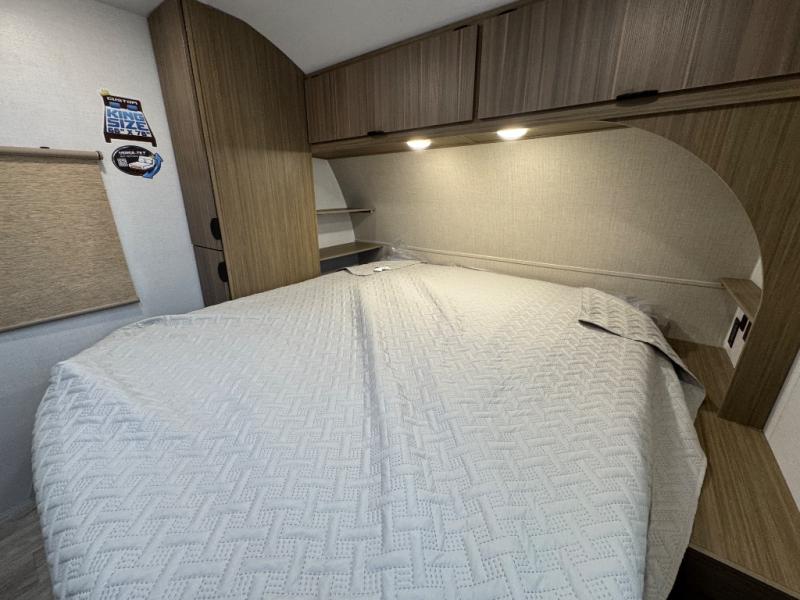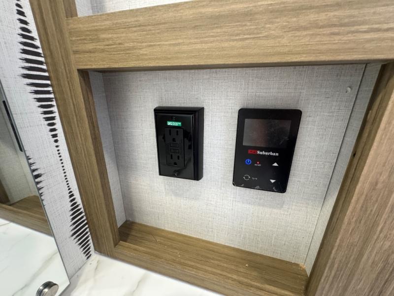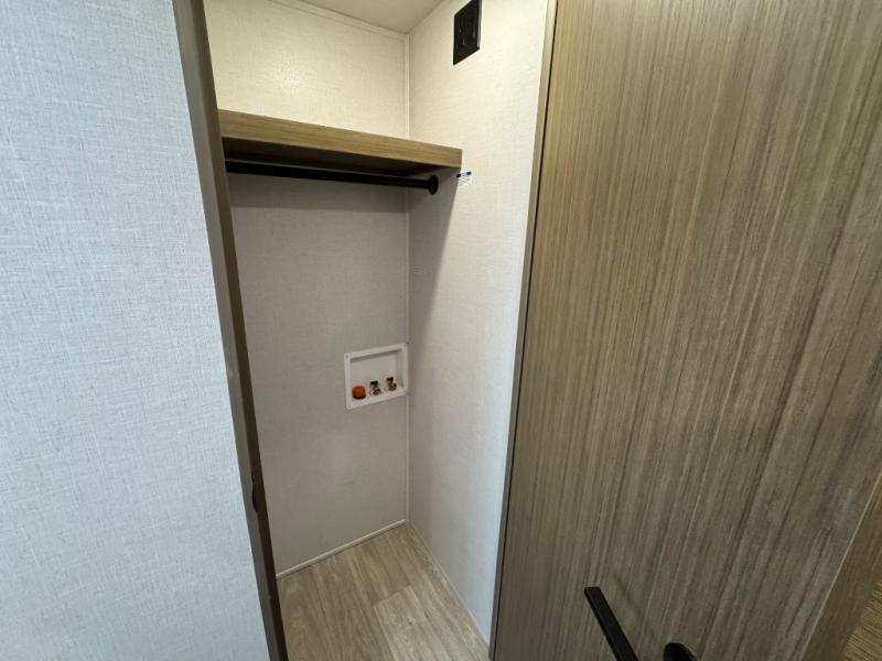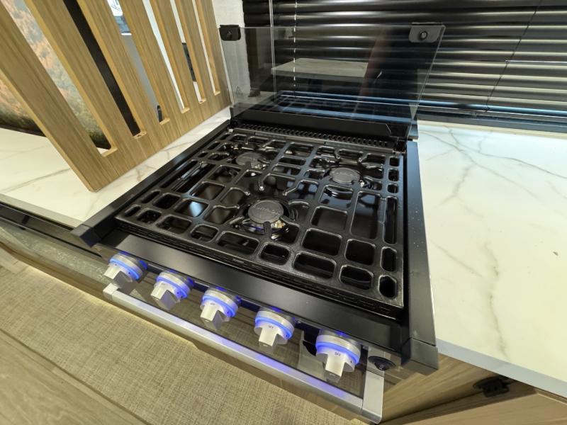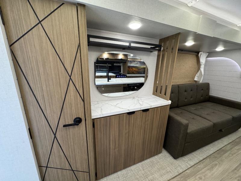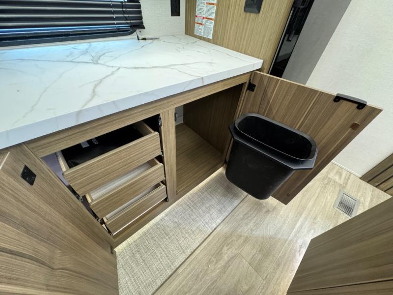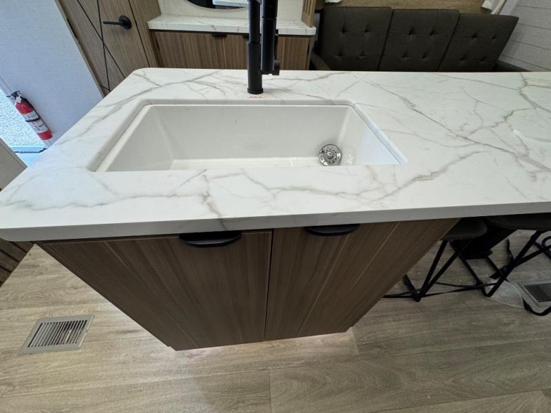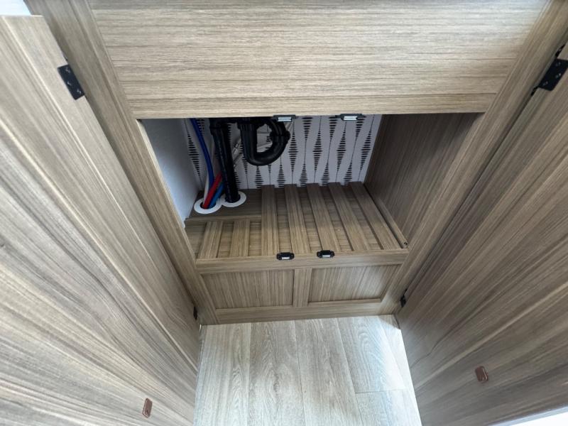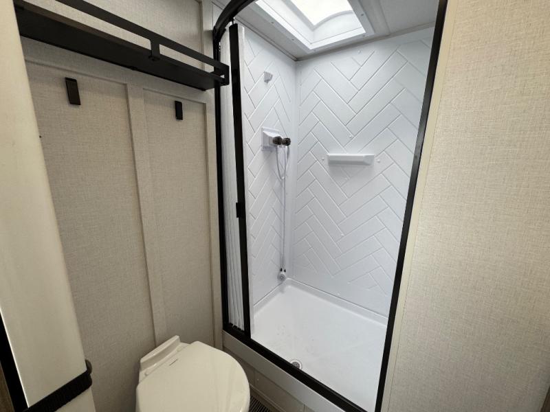 Find your zen int this spacious travel trailer for four! Once you've unloaded your gear, you can head inside to make lunch at the kitchen island with four chairs. An 80" trundle sofa provides additional seating space plus sleeping space for guests. You will love the rear custom recliners that are conveniently located next to the fireplace. The full bath is located towards the front next to the private bedroom so you can easily use the restroom at night, and you're sure to get a great night's rest on the custom king bed with Versa Tilt. This unit also includes washer and dryer prep, giving you the option to add these appliances.