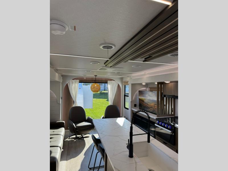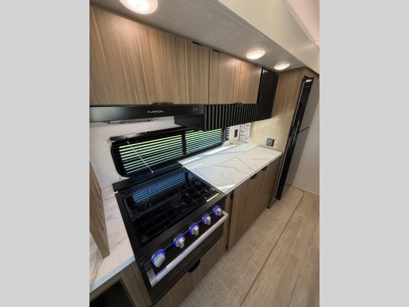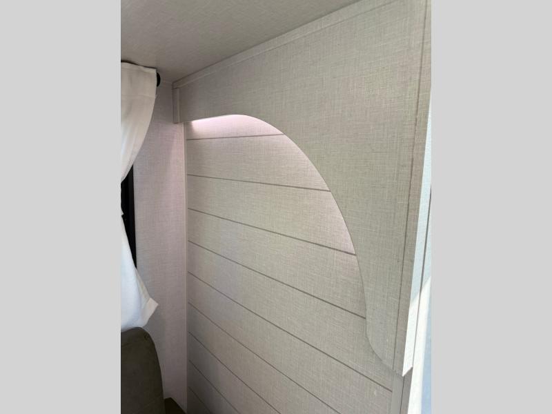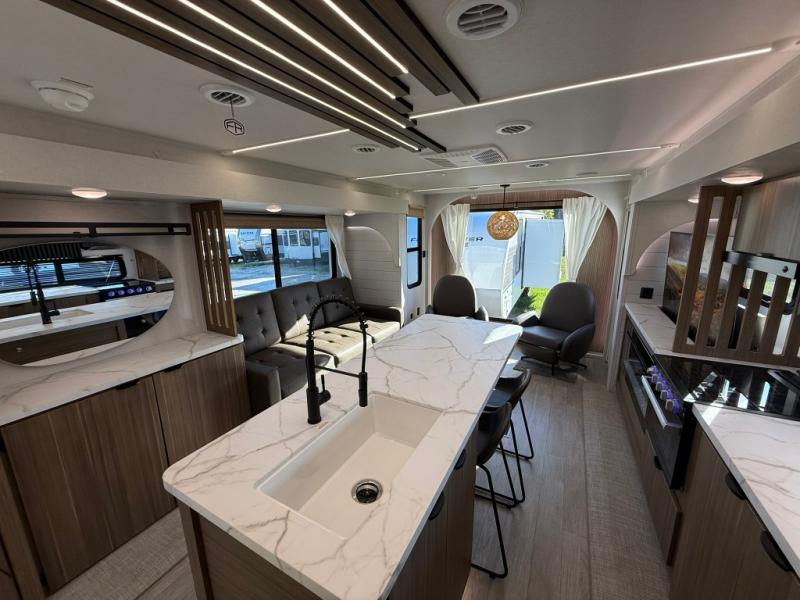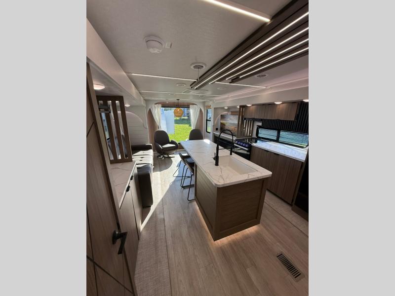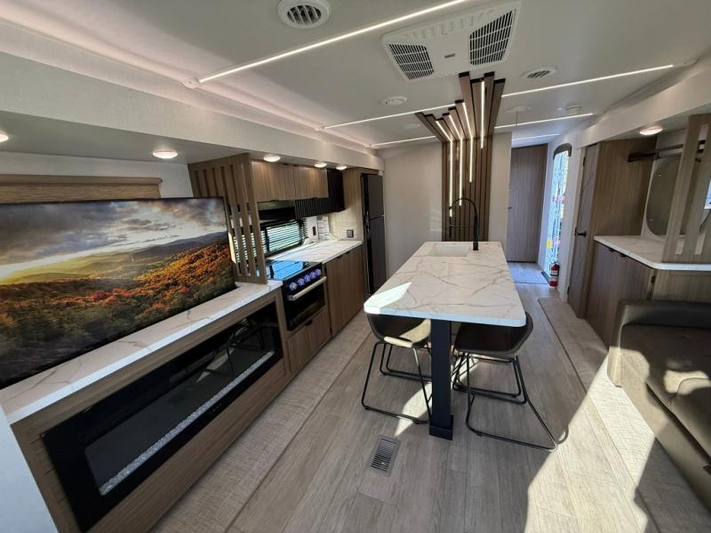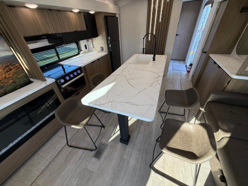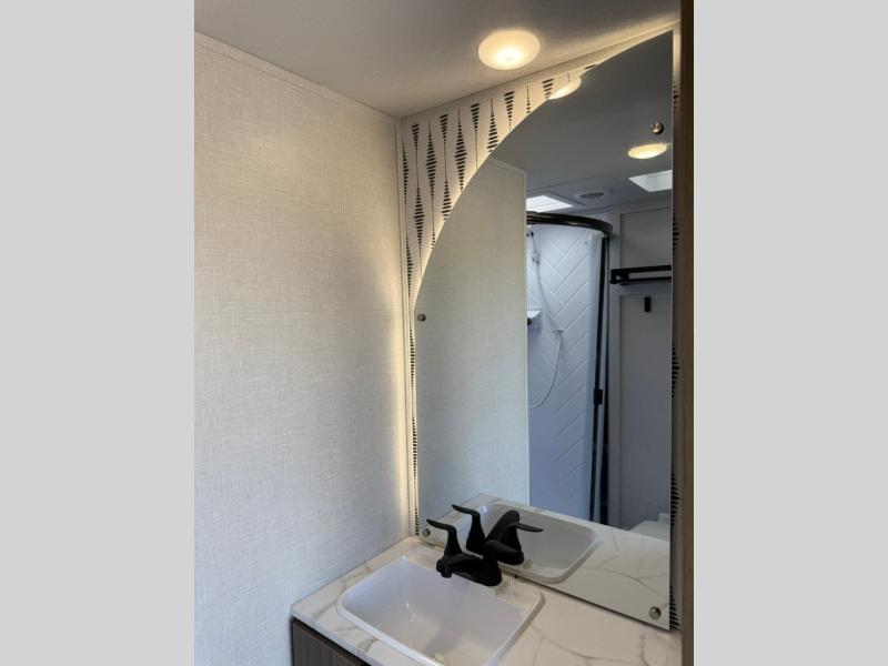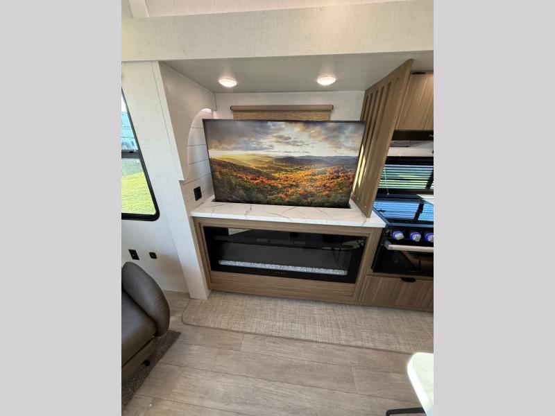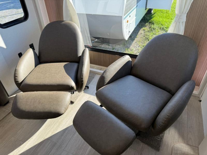 Find your zen int this spacious travel trailer for four! Once you've unloaded your gear, you can head inside to make lunch at the kitchen island with four chairs. An 80" trundle sofa provides additional seating space plus sleeping space for guests. You will love the rear custom recliners that are conveniently located next to the fireplace. The full bath is located towards the front next to the private bedroom so you can easily use the restroom at night, and you're sure to get a great night's rest on the custom king bed with Versa Tilt. This unit also includes washer and dryer prep, giving you the option to add these appliances.