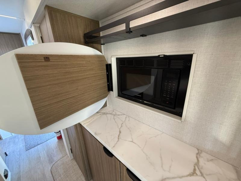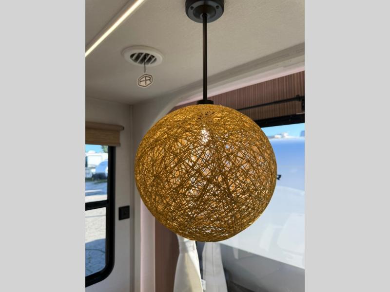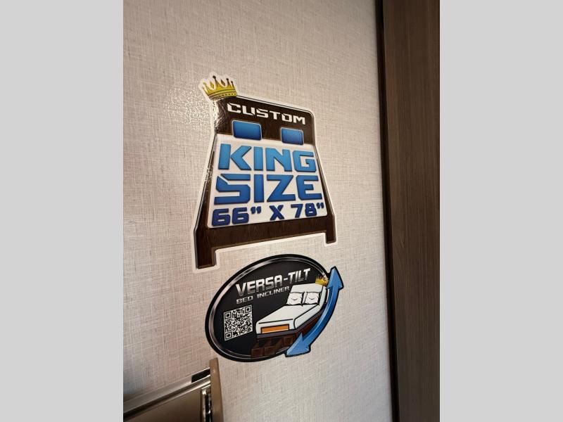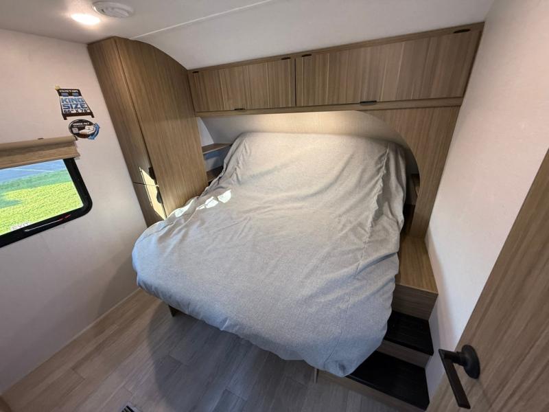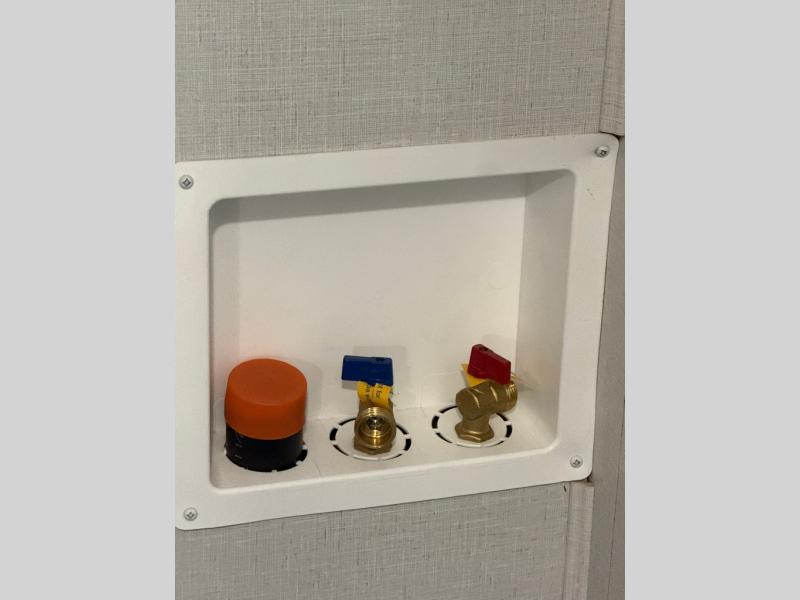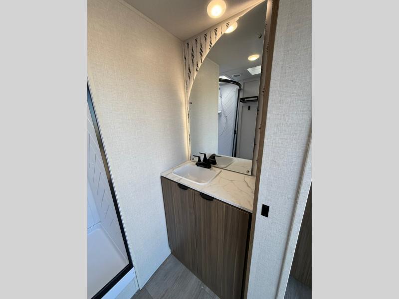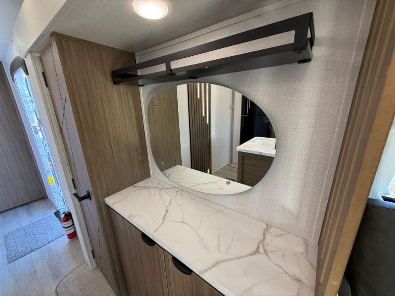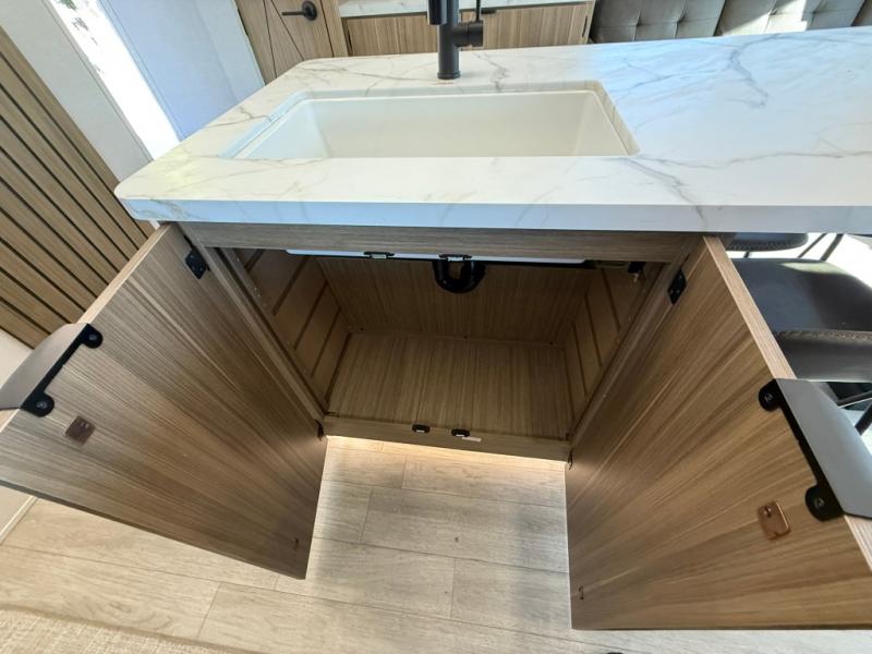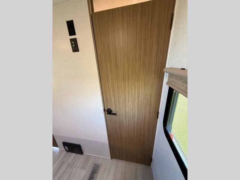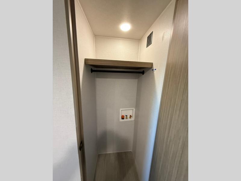 Find your zen int this spacious travel trailer for four! Once you've unloaded your gear, you can head inside to make lunch at the kitchen island with four chairs. An 80" trundle sofa provides additional seating space plus sleeping space for guests. You will love the rear custom recliners that are conveniently located next to the fireplace. The full bath is located towards the front next to the private bedroom so you can easily use the restroom at night, and you're sure to get a great night's rest on the custom king bed with Versa Tilt. This unit also includes washer and dryer prep, giving you the option to add these appliances.
